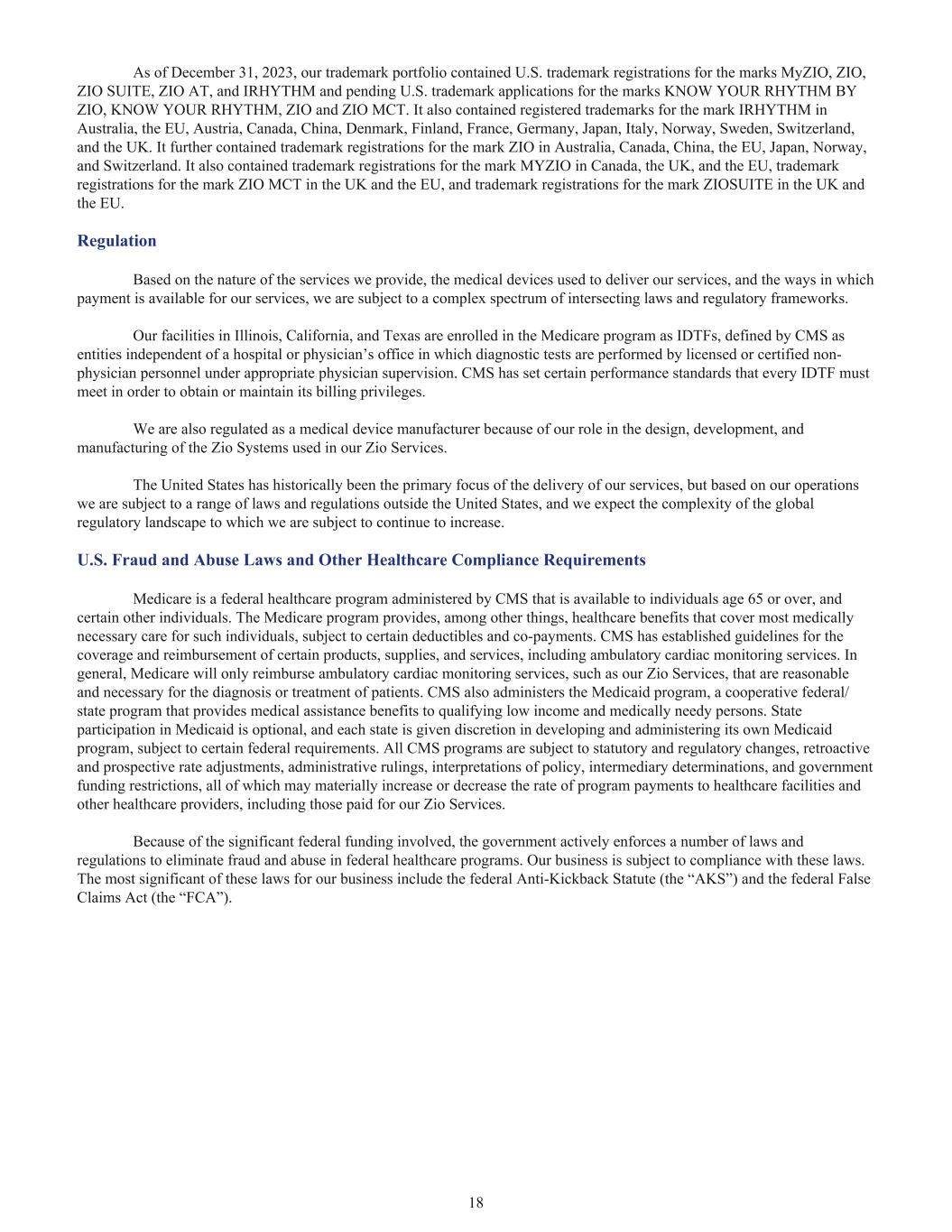 As of December 31, 2023, our trademark portfolio contained U.S. trademark registrations for the marks MyZIO, ZIO, ZIO SUITE, ZIO AT, and IRHYTHM and pending U.S. trademark applications for the marks KNOW YOUR RHYTHM BY ZIO, KNOW YOUR RHYTHM, ZIO and ZIO MCT. It also contained registered trademarks for the mark IRHYTHM in Australia, the EU, Austria, Canada, China, Denmark, Finland, France, Germany, Japan, Italy, Norway, Sweden, Switzerland, and the UK. It further contained trademark registrations for the mark ZIO in Australia, Canada, China, the EU, Japan, Norway, and Switzerland. It also contained trademark registrations for the mark MYZIO in Canada, the UK, and the EU, trademark registrations for the mark ZIO MCT in the UK and the EU, and trademark registrations for the mark ZIOSUITE in the UK and the EU. Regulation Based on the nature of the services we provide, the medical devices used to deliver our services, and the ways in which payment is available for our services, we are subject to a complex spectrum of intersecting laws and regulatory frameworks. Our facilities in Illinois, California, and Texas are enrolled in the Medicare program as IDTFs, defined by CMS as entities independent of a hospital or physician’s office in which diagnostic tests are performed by licensed or certified non- physician personnel under appropriate physician supervision. CMS has set certain performance standards that every IDTF must meet in order to obtain or maintain its billing privileges. We are also regulated as a medical device manufacturer because of our role in the design, development, and manufacturing of the Zio Systems used in our Zio Services. The United States has historically been the primary focus of the delivery of our services, but based on our operations we are subject to a range of laws and regulations outside the United States, and we expect the complexity of the global regulatory landscape to which we are subject to continue to increase. U.S. Fraud and Abuse Laws and Other Healthcare Compliance Requirements Medicare is a federal healthcare program administered by CMS that is available to individuals age 65 or over, and certain other individuals. The Medicare program provides, among other things, healthcare benefits that cover most medically necessary care for such individuals, subject to certain deductibles and co-payments. CMS has established guidelines for the coverage and reimbursement of certain products, supplies, and services, including ambulatory cardiac monitoring services. In general, Medicare will only reimburse ambulatory cardiac monitoring services, such as our Zio Services, that are reasonable and necessary for the diagnosis or treatment of patients. CMS also administers the Medicaid program, a cooperative federal/ state program that provides medical assistance benefits to qualifying low income and medically needy persons. State participation in Medicaid is optional, and each state is given discretion in developing and administering its own Medicaid program, subject to certain federal requirements. All CMS programs are subject to statutory and regulatory changes, retroactive and prospective rate adjustments, administrative rulings, interpretations of policy, intermediary determinations, and government funding restrictions, all of which may materially increase or decrease the rate of program payments to healthcare facilities and other healthcare providers, including those paid for our Zio Services. Because of the significant federal funding involved, the government actively enforces a number of laws and regulations to eliminate fraud and abuse in federal healthcare programs. Our business is subject to compliance with these laws. The most significant of these laws for our business include the federal Anti-Kickback Statute (the “AKS”) and the federal False Claims Act (the “FCA”). 18