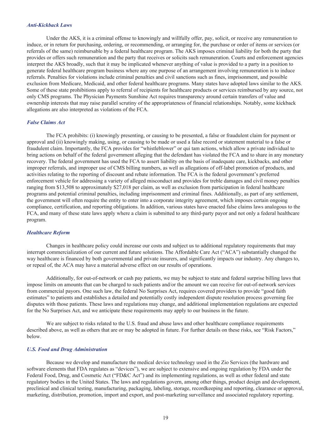 Anti-Kickback Laws Under the AKS, it is a criminal offense to knowingly and willfully offer, pay, solicit, or receive any remuneration to induce, or in return for purchasing, ordering, or recommending, or arranging for, the purchase or order of items or services (or referrals of the same) reimbursable by a federal healthcare program. The AKS imposes criminal liability for both the party that provides or offers such remuneration and the party that receives or solicits such remuneration. Courts and enforcement agencies interpret the AKS broadly, such that it may be implicated whenever anything of value is provided to a party in a position to generate federal healthcare program business where any one purpose of an arrangement involving remuneration is to induce referrals. Penalties for violations include criminal penalties and civil sanctions such as fines, imprisonment, and possible exclusion from Medicare, Medicaid, and other federal healthcare programs. Many states have adopted laws similar to the AKS. Some of these state prohibitions apply to referral of recipients for healthcare products or services reimbursed by any source, not only CMS programs. The Physician Payments Sunshine Act requires transparency around certain transfers of value and ownership interests that may raise parallel scrutiny of the appropriateness of financial relationships. Notably, some kickback allegations are also interpreted as violations of the FCA. False Claims Act The FCA prohibits: (i) knowingly presenting, or causing to be presented, a false or fraudulent claim for payment or approval and (ii) knowingly making, using, or causing to be made or used a false record or statement material to a false or fraudulent claim. Importantly, the FCA provides for “whistleblower” or qui tam actions, which allow a private individual to bring actions on behalf of the federal government alleging that the defendant has violated the FCA and to share in any monetary recovery. The federal government has used the FCA to assert liability on the basis of inadequate care, kickbacks, and other improper referrals, and improper use of CMS billing numbers, as well as allegations of off-label promotion of products, and activities relating to the reporting of discount and rebate information. The FCA is the federal government’s preferred enforcement vehicle for addressing a variety of alleged misconduct and provides for treble damages and civil money penalties ranging from $13,508 to approximately $27,018 per claim, as well as exclusion from participation in federal healthcare programs and potential criminal penalties, including imprisonment and criminal fines. Additionally, as part of any settlement, the government will often require the entity to enter into a corporate integrity agreement, which imposes certain ongoing compliance, certification, and reporting obligations. In addition, various states have enacted false claims laws analogous to the FCA, and many of these state laws apply where a claim is submitted to any third-party payor and not only a federal healthcare program. Healthcare Reform Changes in healthcare policy could increase our costs and subject us to additional regulatory requirements that may interrupt commercialization of our current and future solutions. The Affordable Care Act (“ACA”) substantially changed the way healthcare is financed by both governmental and private insurers, and significantly impacts our industry. Any changes to, or repeal of, the ACA may have a material adverse effect on our results of operations. Additionally, for out-of-network or cash pay patients, we may be subject to state and federal surprise billing laws that impose limits on amounts that can be charged to such patients and/or the amount we can receive for out-of-network services from commercial payors. One such law, the federal No Surprises Act, requires covered providers to provide “good faith estimates” to patients and establishes a detailed and potentially costly independent dispute resolution process governing fee disputes with those patients. These laws and regulations may change, and additional implementation regulations are expected for the No Surprises Act, and we anticipate these requirements may apply to our business in the future. We are subject to risks related to the U.S. fraud and abuse laws and other healthcare compliance requirements described above, as well as others that are or may be adopted in future. For further details on these risks, see “Risk Factors,” below. U.S. Food and Drug Administration Because we develop and manufacture the medical device technology used in the Zio Services (the hardware and software elements that FDA regulates as “devices”), we are subject to extensive and ongoing regulation by FDA under the Federal Food, Drug, and Cosmetic Act (“FD&C Act”) and its implementing regulations, as well as other federal and state regulatory bodies in the United States. The laws and regulations govern, among other things, product design and development, preclinical and clinical testing, manufacturing, packaging, labeling, storage, recordkeeping and reporting, clearance or approval, marketing, distribution, promotion, import and export, and post-marketing surveillance and associated regulatory reporting. 19