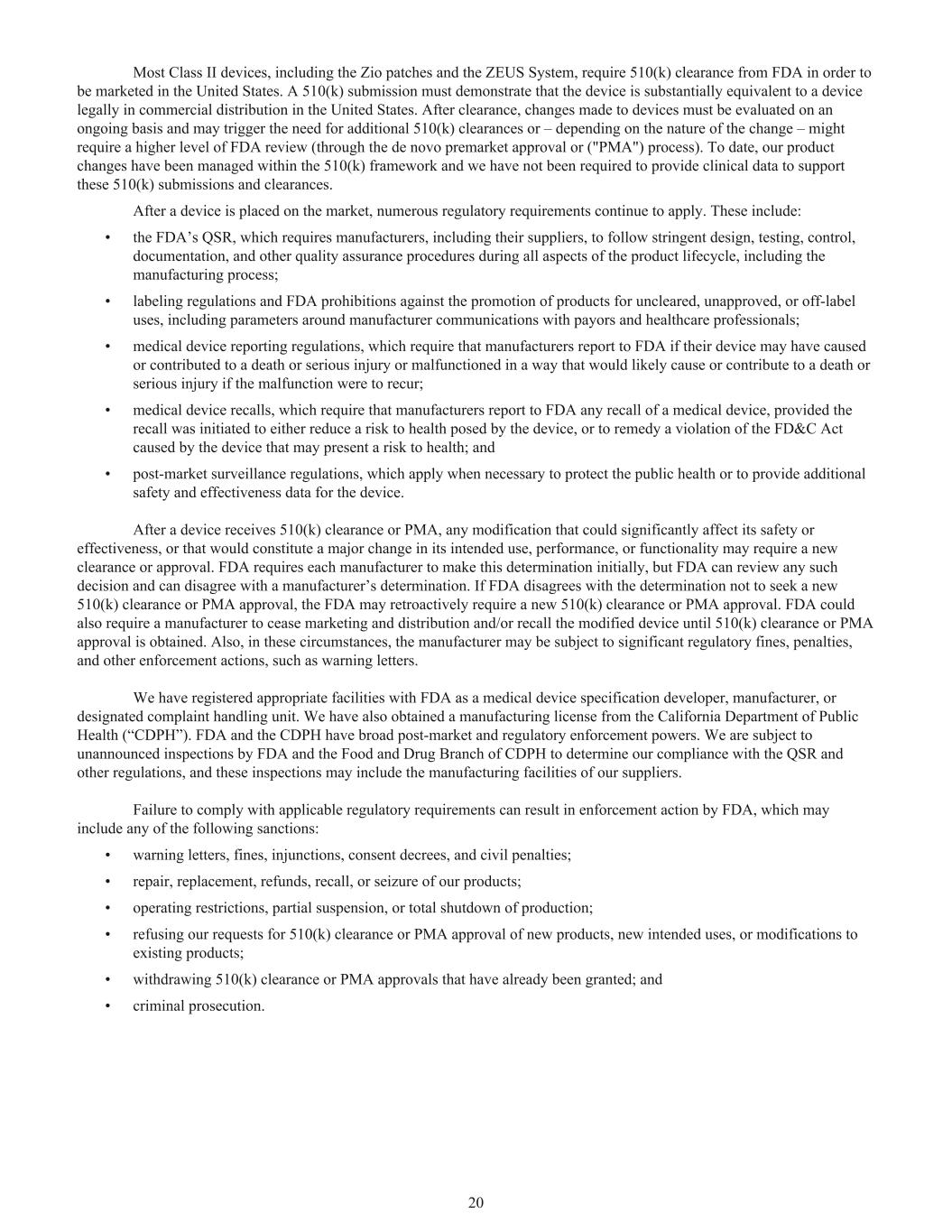 Most Class II devices, including the Zio patches and the ZEUS System, require 510(k) clearance from FDA in order to be marketed in the United States. A 510(k) submission must demonstrate that the device is substantially equivalent to a device legally in commercial distribution in the United States. After clearance, changes made to devices must be evaluated on an ongoing basis and may trigger the need for additional 510(k) clearances or – depending on the nature of the change – might require a higher level of FDA review (through the de novo premarket approval or ("PMA") process). To date, our product changes have been managed within the 510(k) framework and we have not been required to provide clinical data to support these 510(k) submissions and clearances. After a device is placed on the market, numerous regulatory requirements continue to apply. These include: • the FDA’s QSR, which requires manufacturers, including their suppliers, to follow stringent design, testing, control, documentation, and other quality assurance procedures during all aspects of the product lifecycle, including the manufacturing process; • labeling regulations and FDA prohibitions against the promotion of products for uncleared, unapproved, or off-label uses, including parameters around manufacturer communications with payors and healthcare professionals; • medical device reporting regulations, which require that manufacturers report to FDA if their device may have caused or contributed to a death or serious injury or malfunctioned in a way that would likely cause or contribute to a death or serious injury if the malfunction were to recur; • medical device recalls, which require that manufacturers report to FDA any recall of a medical device, provided the recall was initiated to either reduce a risk to health posed by the device, or to remedy a violation of the FD&C Act caused by the device that may present a risk to health; and • post-market surveillance regulations, which apply when necessary to protect the public health or to provide additional safety and effectiveness data for the device. After a device receives 510(k) clearance or PMA, any modification that could significantly affect its safety or effectiveness, or that would constitute a major change in its intended use, performance, or functionality may require a new clearance or approval. FDA requires each manufacturer to make this determination initially, but FDA can review any such decision and can disagree with a manufacturer’s determination. If FDA disagrees with the determination not to seek a new 510(k) clearance or PMA approval, the FDA may retroactively require a new 510(k) clearance or PMA approval. FDA could also require a manufacturer to cease marketing and distribution and/or recall the modified device until 510(k) clearance or PMA approval is obtained. Also, in these circumstances, the manufacturer may be subject to significant regulatory fines, penalties, and other enforcement actions, such as warning letters. We have registered appropriate facilities with FDA as a medical device specification developer, manufacturer, or designated complaint handling unit. We have also obtained a manufacturing license from the California Department of Public Health (“CDPH”). FDA and the CDPH have broad post-market and regulatory enforcement powers. We are subject to unannounced inspections by FDA and the Food and Drug Branch of CDPH to determine our compliance with the QSR and other regulations, and these inspections may include the manufacturing facilities of our suppliers. Failure to comply with applicable regulatory requirements can result in enforcement action by FDA, which may include any of the following sanctions: • warning letters, fines, injunctions, consent decrees, and civil penalties; • repair, replacement, refunds, recall, or seizure of our products; • operating restrictions, partial suspension, or total shutdown of production; • refusing our requests for 510(k) clearance or PMA approval of new products, new intended uses, or modifications to existing products; • withdrawing 510(k) clearance or PMA approvals that have already been granted; and • criminal prosecution. 20