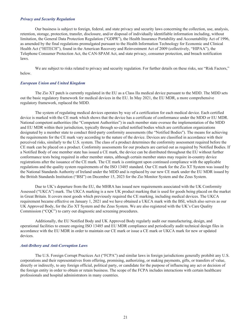 Privacy and Security Regulation Our business is subject to foreign, federal, and state privacy and security laws concerning the collection, use, analysis, retention, storage, protection, transfer, disclosure, and/or disposal of individually identifiable information including, without limitation, the General Data Protection Regulation (“GDPR”), the Health Insurance Portability and Accountability Act of 1996, as amended by the final regulations promulgated pursuant to the Health Information Technology for Economic and Clinical Health Act (“HITECH”), found in the American Recovery and Reinvestment Act of 2009 (collectively, “HIPAA”), the Telephone Consumer Protection Act, the CAN-SPAM Act, and state privacy, consumer protection, and breach notification laws. We are subject to risks related to privacy and security regulation. For further details on these risks, see “Risk Factors,” below. European Union and United Kingdom The Zio XT patch is currently regulated in the EU as a Class IIa medical device pursuant to the MDD. The MDD sets out the basic regulatory framework for medical devices in the EU. In May 2021, the EU MDR, a more comprehensive regulatory framework, replaced the MDD. The system of regulating medical devices operates by way of a certification for each medical device. Each certified device is marked with the CE mark which shows that the device has a certificate of conformance under the MDD or EU MDR. National competent authorities (the “Competent Authorities”) in each member state oversee the implementation of the MDD and EU MDR within their jurisdiction, typically through so-called notified bodies which are certification organizations designated by a member state to conduct third-party conformity assessments (the “Notified Bodies"). The means for achieving the requirements for the CE mark vary according to the nature of the device. Devices are classified in accordance with their perceived risks, similarly to the U.S. system. The class of a product determines the conformity assessment required before the CE mark can be placed on a product. Conformity assessments for our products are carried out as required by Notified Bodies. If a Notified Body of one member state has issued a CE mark, the device can be distributed throughout the EU without further conformance tests being required in other member states, although certain member states may require in-country device registrations after the issuance of the CE mark. The CE mark is contingent upon continued compliance with the applicable regulations and the quality system requirements of the ISO 13485 standard. Our CE mark for the Zio XT System was issued by the National Standards Authority of Ireland under the MDD and is replaced by our new CE mark under the EU MDR issued by the British Standards Institution (“BSI”) on December 15, 2023 for the Zio Monitor System and the Zeus System. Due to UK’s departure from the EU, the MHRA has issued new requirements associated with the UK Conformity Assessed (“UKCA”) mark. The UKCA marking is a new UK product marking that is used for goods being placed on the market in Great Britain. It covers most goods which previously required the CE marking, including medical devices. The UKCA requirement became effective on January 1, 2021 and we have obtained a UKCA mark with the BSI, which also serves as our UK Approved Body, for the Zio XT System and the Zeus System. We are also registered with the UK’s Care Quality Commission (“CQC”) to carry out diagnostic and screening procedures. Additionally, the EU Notified Body and UK Approved Body regularly audit our manufacturing, design, and operational facilities to ensure ongoing ISO 13485 and EU MDR compliance and periodically audit technical design files in accordance with the EU MDR in order to maintain our CE mark or issue a CE mark or UKCA mark for new or updated devices. Anti-Bribery and Anti-Corruption Laws The U.S. Foreign Corrupt Practices Act (“FCPA”) and similar laws in foreign jurisdictions generally prohibit any U.S. corporations and their representatives from offering, promising, authorizing, or making payments, gifts, or transfers of value, directly or indirectly, to any foreign official, political party, or candidate for the purpose of influencing any act or decision of the foreign entity in order to obtain or retain business. The scope of the FCPA includes interactions with certain healthcare professionals and hospital administrators in many countries. 21