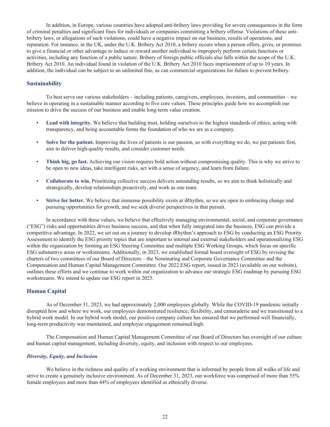In addition, in Europe, various countries have adopted anti-bribery laws providing for severe consequences in the form of criminal penalties and significant fines for individuals or companies committing a bribery offense. Violations of these anti- bribery laws, or allegations of such violations, could have a negative impact on our business, results of operations, and reputation. For instance, in the UK, under the U.K. Bribery Act 2010, a bribery occurs when a person offers, gives, or promises to give a financial or other advantage to induce or reward another individual to improperly perform certain functions or activities, including any function of a public nature. Bribery of foreign public officials also falls within the scope of the U.K. Bribery Act 2010. An individual found in violation of the U.K. Bribery Act 2010 faces imprisonment of up to 10 years. In addition, the individual can be subject to an unlimited fine, as can commercial organizations for failure to prevent bribery. Sustainability To best serve our various stakeholders – including patients, caregivers, employees, investors, and communities – we believe in operating in a sustainable manner according to five core values. These principles guide how we accomplish our mission to drive the success of our business and enable long-term value creation. • Lead with integrity. We believe that building trust, holding ourselves to the highest standards of ethics, acting with transparency, and being accountable forms the foundation of who we are as a company. • Solve for the patient. Improving the lives of patients is our passion, so with everything we do, we put patients first, aim to deliver high-quality results, and consider customer needs. • Think big, go fast. Achieving our vision requires bold action without compromising quality. This is why we strive to be open to new ideas, take intelligent risks, act with a sense of urgency, and learn from failure. • Collaborate to win. Prioritizing collective success delivers astounding results, so we aim to think holistically and strategically, develop relationships proactively, and work as one team. • Strive for better. We believe that immense possibility exists at iRhythm, so we are open to embracing change and pursuing opportunities for growth, and we seek diverse perspectives in that pursuit. In accordance with these values, we believe that effectively managing environmental, social, and corporate governance (“ESG”) risks and opportunities drives business success, and that when fully integrated into the business, ESG can provide a competitive advantage. In 2022, we set out on a journey to develop iRhythm’s approach to ESG by conducting an ESG Priority Assessment to identify the ESG priority topics that are important to internal and external stakeholders and operationalizing ESG within the organization by forming an ESG Steering Committee and multiple ESG Working Groups, which focus on specific ESG substantive areas or workstreams. Additionally, in 2023, we established formal board oversight of ESG by revising the charters of two committees of our Board of Directors – the Nominating and Corporate Governance Committee and the Compensation and Human Capital Management Committee. Our 2022 ESG report, issued in 2023 (available on our website), outlines these efforts and we continue to work within our organization to advance our strategic ESG roadmap by pursuing ESG workstreams. We intend to update our ESG report in 2025. Human Capital As of December 31, 2023, we had approximately 2,000 employees globally. While the COVID-19 pandemic initially disrupted how and where we work, our employees demonstrated resilience, flexibility, and camaraderie and we transitioned to a hybrid work model. In our hybrid work model, our positive company culture has ensured that we performed well financially, long-term productivity was maintained, and employee engagement remained high. The Compensation and Human Capital Management Committee of our Board of Directors has oversight of our culture and human capital management, including diversity, equity, and inclusion with respect to our employees. Diversity, Equity, and Inclusion We believe in the richness and quality of a working environment that is informed by people from all walks of life and strive to create a genuinely inclusive environment. As of December 31, 2023, our workforce was comprised of more than 55% female employees and more than 44% of employees identified as ethnically diverse. 22