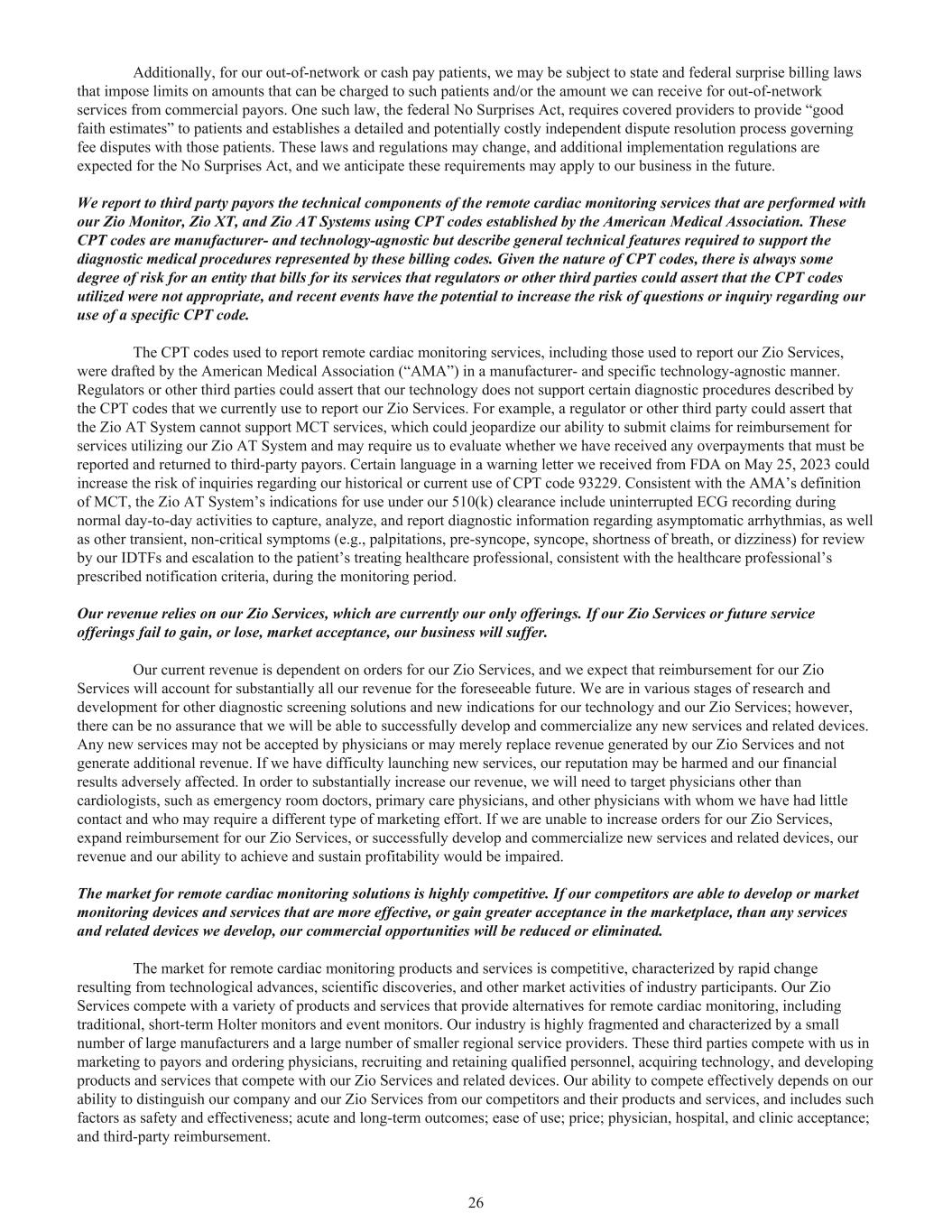 Additionally, for our out-of-network or cash pay patients, we may be subject to state and federal surprise billing laws that impose limits on amounts that can be charged to such patients and/or the amount we can receive for out-of-network services from commercial payors. One such law, the federal No Surprises Act, requires covered providers to provide “good faith estimates” to patients and establishes a detailed and potentially costly independent dispute resolution process governing fee disputes with those patients. These laws and regulations may change, and additional implementation regulations are expected for the No Surprises Act, and we anticipate these requirements may apply to our business in the future. We report to third party payors the technical components of the remote cardiac monitoring services that are performed with our Zio Monitor, Zio XT, and Zio AT Systems using CPT codes established by the American Medical Association. These CPT codes are manufacturer- and technology-agnostic but describe general technical features required to support the diagnostic medical procedures represented by these billing codes. Given the nature of CPT codes, there is always some degree of risk for an entity that bills for its services that regulators or other third parties could assert that the CPT codes utilized were not appropriate, and recent events have the potential to increase the risk of questions or inquiry regarding our use of a specific CPT code. The CPT codes used to report remote cardiac monitoring services, including those used to report our Zio Services, were drafted by the American Medical Association (“AMA”) in a manufacturer- and specific technology-agnostic manner. Regulators or other third parties could assert that our technology does not support certain diagnostic procedures described by the CPT codes that we currently use to report our Zio Services. For example, a regulator or other third party could assert that the Zio AT System cannot support MCT services, which could jeopardize our ability to submit claims for reimbursement for services utilizing our Zio AT System and may require us to evaluate whether we have received any overpayments that must be reported and returned to third-party payors. Certain language in a warning letter we received from FDA on May 25, 2023 could increase the risk of inquiries regarding our historical or current use of CPT code 93229. Consistent with the AMA’s definition of MCT, the Zio AT System’s indications for use under our 510(k) clearance include uninterrupted ECG recording during normal day-to-day activities to capture, analyze, and report diagnostic information regarding asymptomatic arrhythmias, as well as other transient, non-critical symptoms (e.g., palpitations, pre-syncope, syncope, shortness of breath, or dizziness) for review by our IDTFs and escalation to the patient’s treating healthcare professional, consistent with the healthcare professional’s prescribed notification criteria, during the monitoring period. Our revenue relies on our Zio Services, which are currently our only offerings. If our Zio Services or future service offerings fail to gain, or lose, market acceptance, our business will suffer. Our current revenue is dependent on orders for our Zio Services, and we expect that reimbursement for our Zio Services will account for substantially all our revenue for the foreseeable future. We are in various stages of research and development for other diagnostic screening solutions and new indications for our technology and our Zio Services; however, there can be no assurance that we will be able to successfully develop and commercialize any new services and related devices. Any new services may not be accepted by physicians or may merely replace revenue generated by our Zio Services and not generate additional revenue. If we have difficulty launching new services, our reputation may be harmed and our financial results adversely affected. In order to substantially increase our revenue, we will need to target physicians other than cardiologists, such as emergency room doctors, primary care physicians, and other physicians with whom we have had little contact and who may require a different type of marketing effort. If we are unable to increase orders for our Zio Services, expand reimbursement for our Zio Services, or successfully develop and commercialize new services and related devices, our revenue and our ability to achieve and sustain profitability would be impaired. The market for remote cardiac monitoring solutions is highly competitive. If our competitors are able to develop or market monitoring devices and services that are more effective, or gain greater acceptance in the marketplace, than any services and related devices we develop, our commercial opportunities will be reduced or eliminated. The market for remote cardiac monitoring products and services is competitive, characterized by rapid change resulting from technological advances, scientific discoveries, and other market activities of industry participants. Our Zio Services compete with a variety of products and services that provide alternatives for remote cardiac monitoring, including traditional, short-term Holter monitors and event monitors. Our industry is highly fragmented and characterized by a small number of large manufacturers and a large number of smaller regional service providers. These third parties compete with us in marketing to payors and ordering physicians, recruiting and retaining qualified personnel, acquiring technology, and developing products and services that compete with our Zio Services and related devices. Our ability to compete effectively depends on our ability to distinguish our company and our Zio Services from our competitors and their products and services, and includes such factors as safety and effectiveness; acute and long-term outcomes; ease of use; price; physician, hospital, and clinic acceptance; and third