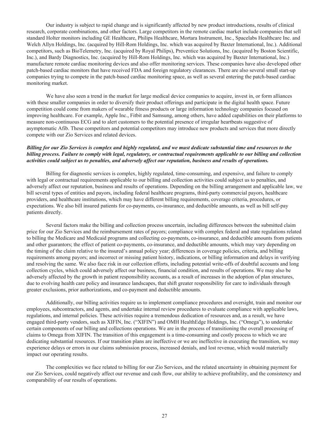 Our industry is subject to rapid change and is significantly affected by new product introductions, results of clinical research, corporate combinations, and other factors. Large competitors in the remote cardiac market include companies that sell standard Holter monitors including GE Healthcare, Philips Healthcare, Mortara Instrument, Inc., Spacelabs Healthcare Inc. and Welch Allyn Holdings, Inc. (acquired by Hill-Rom Holdings, Inc. which was acquired by Baxter International, Inc.). Additional competitors, such as BioTelemetry, Inc. (acquired by Royal Philips), Preventice Solutions, Inc. (acquired by Boston Scientific, Inc.), and Bardy Diagnostics, Inc. (acquired by Hill-Rom Holdings, Inc. which was acquired by Baxter International, Inc.) manufacture remote cardiac monitoring devices and also offer monitoring services. These companies have also developed other patch-based cardiac monitors that have received FDA and foreign regulatory clearances. There are also several small start-up companies trying to compete in the patch-based cardiac monitoring space, as well as several entering the patch-based cardiac monitoring market. We have also seen a trend in the market for large medical device companies to acquire, invest in, or form alliances with these smaller companies in order to diversify their product offerings and participate in the digital health space. Future competition could come from makers of wearable fitness products or large information technology companies focused on improving healthcare. For example, Apple Inc., Fitbit and Samsung, among others, have added capabilities on their platforms to measure non-continuous ECG and to alert customers to the potential presence of irregular heartbeats suggestive of asymptomatic Afib. These competitors and potential competitors may introduce new products and services that more directly compete with our Zio Services and related devices. Billing for our Zio Services is complex and highly regulated, and we must dedicate substantial time and resources to the billing process. Failure to comply with legal, regulatory, or contractual requirements applicable to our billing and collection activities could subject us to penalties, and adversely affect our reputation, business and results of operations. Billing for diagnostic services is complex, highly regulated, time-consuming, and expensive, and failure to comply with legal or contractual requirements applicable to our billing and collection activities could subject us to penalties, and adversely affect our reputation, business and results of operations. Depending on the billing arrangement and applicable law, we bill several types of entities and payors, including federal healthcare programs, third-party commercial payors, healthcare providers, and healthcare institutions, which may have different billing requirements, coverage criteria, procedures, or expectations. We also bill insured patients for co-payments, co-insurance, and deductible amounts, as well as bill self-pay patients directly. Several factors make the billing and collection process uncertain, including differences between the submitted claim price for our Zio Services and the reimbursement rates of payors; compliance with complex federal and state regulations related to billing the Medicare and Medicaid programs and collecting co-payments, co-insurance, and deductible amounts from patients and other guarantors; the effect of patient co-payments, co-insurance, and deductible amounts, which may vary depending on the timing of the claim relative to the insured’s annual policy year; differences in coverage policies, criteria, and billing requirements among payors; and incorrect or missing patient history, indications, or billing information and delays in verifying and resolving the same. We also face risk in our collection efforts, including potential write-offs of doubtful accounts and long collection cycles, which could adversely affect our business, financial condition, and results of operations. We may also be adversely affected by the growth in patient responsibility accounts, as a result of increases in the adoption of plan structures, due to evolving health care policy and insurance landscapes, that shift greater responsibility for care to individuals through greater exclusions, prior authorizations, and co-payment and deductible amounts. Additionally, our billing activities require us to implement compliance procedures and oversight, train and monitor our employees, subcontractors, and agents, and undertake internal review procedures to evaluate compliance with applicable laws, regulations, and internal policies. These activities require a tremendous dedication of resources and, as a result, we have engaged third-party vendors, such as XIFIN, Inc. (“XIFIN”) and OMH HealthEdge Holdings, Inc. (“Omega”), to undertake certain components of our billing and collections operations. We are in the process of transitioning the overall processing of claims to Omega from XIFIN. The transition of this engagement is a time-consuming and costly process to which we are dedicating substantial resources. If our transition plans are ineffective or we are ineffective in executing the transition, we may experience delays or errors in our claims submission process, increased denials, and lost revenue, which would materially impact our operating results. The complexities we face related to billing for our Zio Services, and the related uncertainty in obtaining payment for our Zio Services, could negatively affect our revenue and cash flow, our ability to achieve profitability, and the consistency and comparability of our results of operations. 27