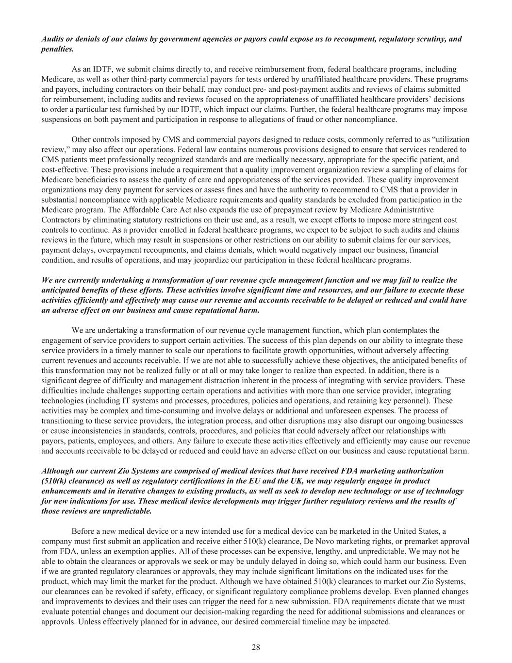 Audits or denials of our claims by government agencies or payors could expose us to recoupment, regulatory scrutiny, and penalties. As an IDTF, we submit claims directly to, and receive reimbursement from, federal healthcare programs, including Medicare, as well as other third-party commercial payors for tests ordered by unaffiliated healthcare providers. These programs and payors, including contractors on their behalf, may conduct pre- and post-payment audits and reviews of claims submitted for reimbursement, including audits and reviews focused on the appropriateness of unaffiliated healthcare providers’ decisions to order a particular test furnished by our IDTF, which impact our claims. Further, the federal healthcare programs may impose suspensions on both payment and participation in response to allegations of fraud or other noncompliance. Other controls imposed by CMS and commercial payors designed to reduce costs, commonly referred to as “utilization review,” may also affect our operations. Federal law contains numerous provisions designed to ensure that services rendered to CMS patients meet professionally recognized standards and are medically necessary, appropriate for the specific patient, and cost-effective. These provisions include a requirement that a quality improvement organization review a sampling of claims for Medicare beneficiaries to assess the quality of care and appropriateness of the services provided. These quality improvement organizations may deny payment for services or assess fines and have the authority to recommend to CMS that a provider in substantial noncompliance with applicable Medicare requirements and quality standards be excluded from participation in the Medicare program. The Affordable Care Act also expands the use of prepayment review by Medicare Administrative Contractors by eliminating statutory restrictions on their use and, as a result, we except efforts to impose more stringent cost controls to continue. As a provider enrolled in federal healthcare programs, we expect to be subject to such audits and claims reviews in the future, which may result in suspensions or other restrictions on our ability to submit claims for our services, payment delays, overpayment recoupments, and claims denials, which would negatively impact our business, financial condition, and results of operations, and may jeopardize our participation in these federal healthcare programs. We are currently undertaking a transformation of our revenue cycle management function and we may fail to realize the anticipated benefits of these efforts. These activities involve significant time and resources, and our failure to execute these activities efficiently and effectively may cause our revenue and accounts receivable to be delayed or reduced and could have an adverse effect on our business and cause reputational harm. We are undertaking a transformation of our revenue cycle management function, which plan contemplates the engagement of service providers to support certain activities. The success of this plan depends on our ability to integrate these service providers in a timely manner to scale our operations to facilitate growth opportunities, without adversely affecting current revenues and accounts receivable. If we are not able to successfully achieve these objectives, the anticipated benefits of this transformation may not be realized fully or at all or may take longer to realize than expected. In addition, there is a significant degree of difficulty and management distraction inherent in the process of integrating with service providers. These difficulties include challenges supporting certain operations and activities with more than one service provider, integrating technologies (including IT systems and processes, procedures, policies and operations, and retaining key personnel). These activities may be complex and time-consuming and involve delays or additional and unforeseen expenses. The process of transitioning to these service providers, the integration process, and other disruptions may also disrupt our ongoing businesses or cause inconsistencies in standards, controls, procedures, and policies that could adversely affect our relationships with payors, patients, employees, and others. Any failure to execute these activities effectively and efficiently may cause our revenue and accounts receivable to be delayed or reduced and could have an adverse effect on our business and cause reputational harm. Although our current Zio Systems are comprised of medical devices that have received FDA marketing authorization (510(k) clearance) as well as regulatory certifications in the EU and the UK, we may regularly engage in product enhancements and in iterative changes to existing products, as well as seek to develop new technology or use of technology for new indications for use. These medical device developments may trigger further regulatory reviews and the results of those reviews are unpredictable. Before a new medical device or a new intended use for a medical device can be marketed in the United States, a company must first submit an application and receive either 510(k) clearance, De Novo marketing rights, or premarket approval from FDA, unless an exemption applies. All of these processes can be expensive, lengthy, and unpredictable. We may not be able to obtain the clearances or approvals we seek or may be unduly delayed in doing so, which could harm our business. Even if we are granted regulatory clearances or approvals, they may include significant limitations on the indicated uses for the product, which may limit the market for the product. Although we have obtained 510(k) clearances to market our Zio Systems, our clearances can be revoked if safety, efficacy, or significant regulatory compliance problems develop. Even planned changes and improvements to devices and their uses can trigger the need for a new submission. FDA requirements dictate that we must eva