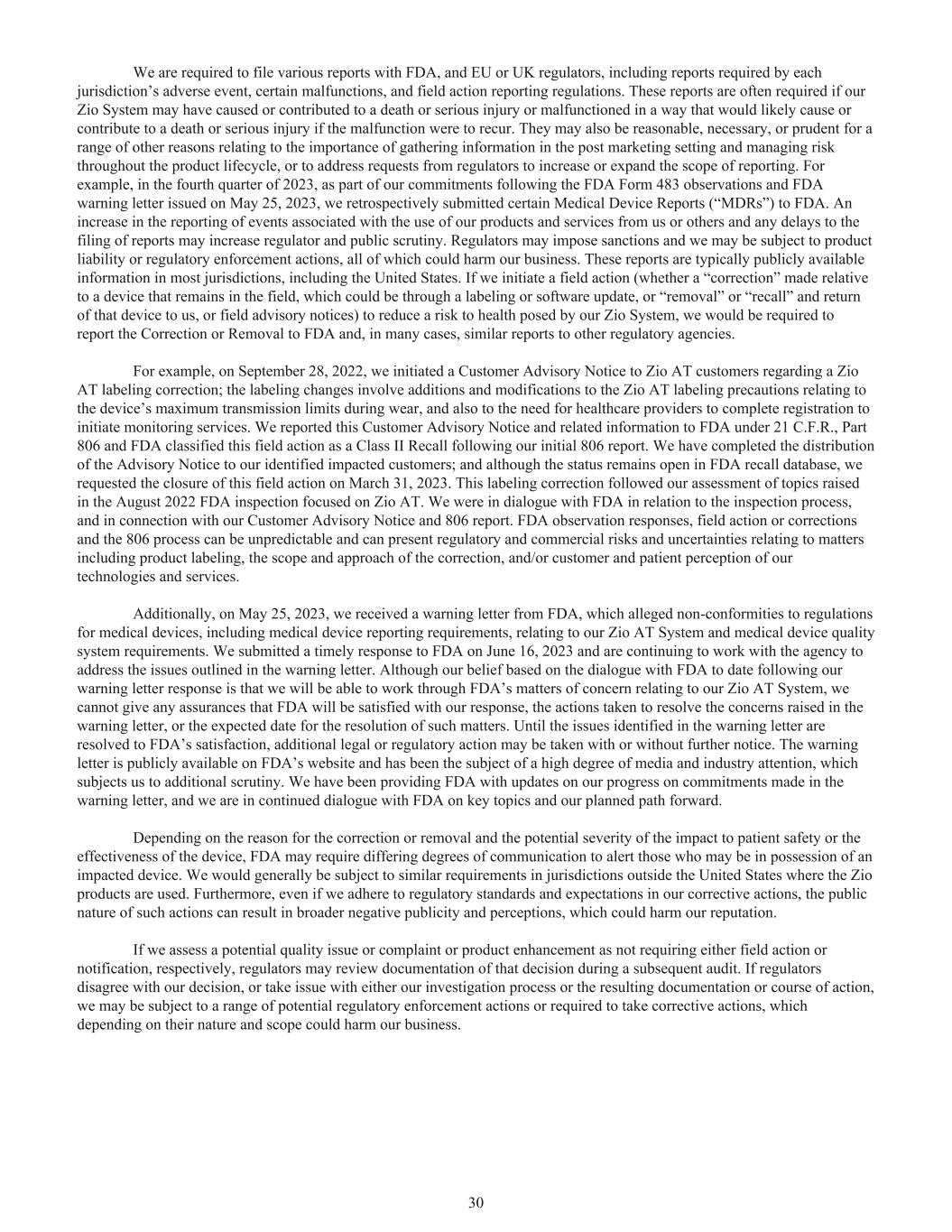 We are required to file various reports with FDA, and EU or UK regulators, including reports required by each jurisdiction’s adverse event, certain malfunctions, and field action reporting regulations. These reports are often required if our Zio System may have caused or contributed to a death or serious injury or malfunctioned in a way that would likely cause or contribute to a death or serious injury if the malfunction were to recur. They may also be reasonable, necessary, or prudent for a range of other reasons relating to the importance of gathering information in the post marketing setting and managing risk throughout the product lifecycle, or to address requests from regulators to increase or expand the scope of reporting. For example, in the fourth quarter of 2023, as part of our commitments following the FDA Form 483 observations and FDA warning letter issued on May 25, 2023, we retrospectively submitted certain Medical Device Reports (“MDRs”) to FDA. An increase in the reporting of events associated with the use of our products and services from us or others and any delays to the filing of reports may increase regulator and public scrutiny. Regulators may impose sanctions and we may be subject to product liability or regulatory enforcement actions, all of which could harm our business. These reports are typically publicly available information in most jurisdictions, including the United States. If we initiate a field action (whether a “correction” made relative to a device that remains in the field, which could be through a labeling or software update, or “removal” or “recall” and return of that device to us, or field advisory notices) to reduce a risk to health posed by our Zio System, we would be required to report the Correction or Removal to FDA and, in many cases, similar reports to other regulatory agencies. For example, on September 28, 2022, we initiated a Customer Advisory Notice to Zio AT customers regarding a Zio AT labeling correction; the labeling changes involve additions and modifications to the Zio AT labeling precautions relating to the device’s maximum transmission limits during wear, and also to the need for healthcare providers to complete registration to initiate monitoring services. We reported this Customer Advisory Notice and related information to FDA under 21 C.F.R., Part 806 and FDA classified this field action as a Class II Recall following our initial 806 report. We have completed the distribution of the Advisory Notice to our identified impacted customers; and although the status remains open in FDA recall database, we requested the closure of this field action on March 31, 2023. This labeling correction followed our assessment of topics raised in the August 2022 FDA inspection focused on Zio AT. We were in dialogue with FDA in relation to the inspection process, and in connection with our Customer Advisory Notice and 806 report. FDA observation responses, field action or corrections and the 806 process can be unpredictable and can present regulatory and commercial risks and uncertainties relating to matters including product labeling, the scope and approach of the correction, and/or customer and patient perception of our technologies and services. Additionally, on May 25, 2023, we received a warning letter from FDA, which alleged non-conformities to regulations for medical devices, including medical device reporting requirements, relating to our Zio AT System and medical device quality system requirements. We submitted a timely response to FDA on June 16, 2023 and are continuing to work with the agency to address the issues outlined in the warning letter. Although our belief based on the dialogue with FDA to date following our warning letter response is that we will be able to work through FDA’s matters of concern relating to our Zio AT System, we cannot give any assurances that FDA will be satisfied with our response, the actions taken to resolve the concerns raised in the warning letter, or the expected date for the resolution of such matters. Until the issues identified in the warning letter are resolved to FDA’s satisfaction, additional legal or regulatory action may be taken with or without further notice. The warning letter is publicly available on FDA’s website and has been the subject of a high degree of media and industry attention, which subjects us to additional scrutiny. We have been providing FDA with updates on our progress on commitments made in the warning letter, and we are in continued dialogue with FDA on key topics and our planned path forward. Depending on the reason for the correction or removal and the potential severity of the impact to patient safety or the effectiveness of the device, FDA may require differing degrees of communication to alert those who may be in possession of an impacted device. We would generally be subject to similar requirements in jurisdictions outside the United States where the Zio products are used. Furthermore, even if we adhere to regulatory standards and expectations in our corrective actions, the public nature of such actions can result in broader negative publicity and perceptions, which could harm our reputation. If we assess a potential quality issue or complaint or product enhancement as not requiring either field action or notification, respectively, regulators may review documentation of that decision during a subsequent audit. If regulators disagree with our decision, or take issue with either our investigation process or the resulting documentation or course of action, we may be subject to a range of potential regulatory enforcement actions or required to take corrective actions, which depending on their nature and scope could harm our business. 30