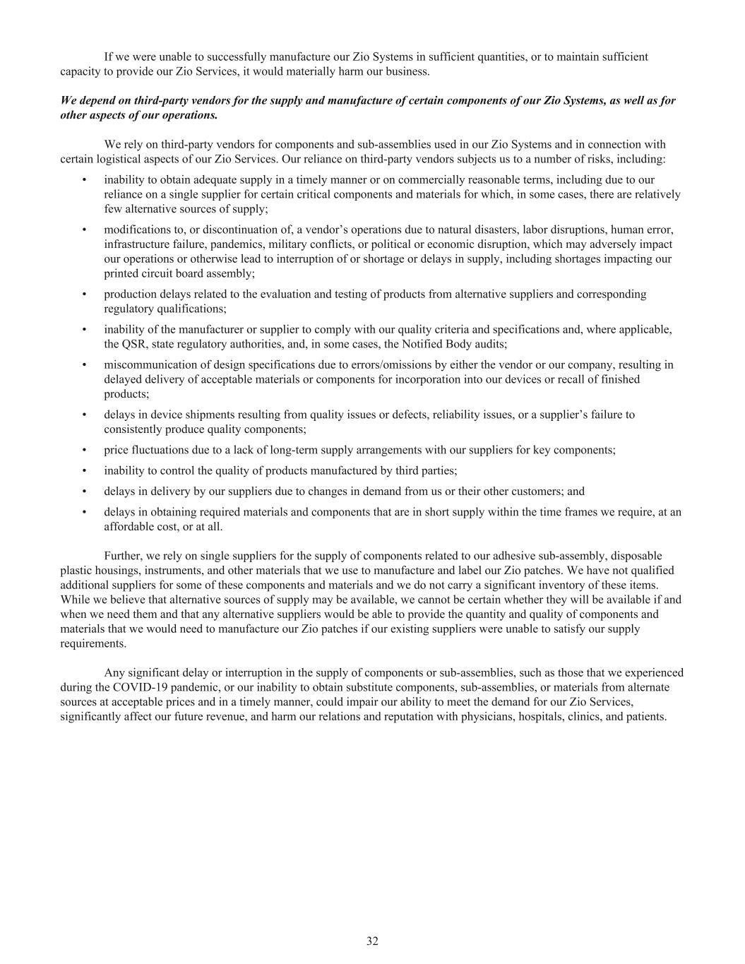 If we were unable to successfully manufacture our Zio Systems in sufficient quantities, or to maintain sufficient capacity to provide our Zio Services, it would materially harm our business. We depend on third-party vendors for the supply and manufacture of certain components of our Zio Systems, as well as for other aspects of our operations. We rely on third-party vendors for components and sub-assemblies used in our Zio Systems and in connection with certain logistical aspects of our Zio Services. Our reliance on third-party vendors subjects us to a number of risks, including: • inability to obtain adequate supply in a timely manner or on commercially reasonable terms, including due to our reliance on a single supplier for certain critical components and materials for which, in some cases, there are relatively few alternative sources of supply; • modifications to, or discontinuation of, a vendor’s operations due to natural disasters, labor disruptions, human error, infrastructure failure, pandemics, military conflicts, or political or economic disruption, which may adversely impact our operations or otherwise lead to interruption of or shortage or delays in supply, including shortages impacting our printed circuit board assembly; • production delays related to the evaluation and testing of products from alternative suppliers and corresponding regulatory qualifications; • inability of the manufacturer or supplier to comply with our quality criteria and specifications and, where applicable, the QSR, state regulatory authorities, and, in some cases, the Notified Body audits; • miscommunication of design specifications due to errors/omissions by either the vendor or our company, resulting in delayed delivery of acceptable materials or components for incorporation into our devices or recall of finished products; • delays in device shipments resulting from quality issues or defects, reliability issues, or a supplier’s failure to consistently produce quality components; • price fluctuations due to a lack of long-term supply arrangements with our suppliers for key components; • inability to control the quality of products manufactured by third parties; • delays in delivery by our suppliers due to changes in demand from us or their other customers; and • delays in obtaining required materials and components that are in short supply within the time frames we require, at an affordable cost, or at all. Further, we rely on single suppliers for the supply of components related to our adhesive sub-assembly, disposable plastic housings, instruments, and other materials that we use to manufacture and label our Zio patches. We have not qualified additional suppliers for some of these components and materials and we do not carry a significant inventory of these items. While we believe that alternative sources of supply may be available, we cannot be certain whether they will be available if and when we need them and that any alternative suppliers would be able to provide the quantity and quality of components and materials that we would need to manufacture our Zio patches if our existing suppliers were unable to satisfy our supply requirements. Any significant delay or interruption in the supply of components or sub-assemblies, such as those that we experienced during the COVID-19 pandemic, or our inability to obtain substitute components, sub-assemblies, or materials from alternate sources at acceptable prices and in a timely manner, could impair our ability to meet the demand for our Zio Services, significantly affect our future revenue, and harm our relations and reputation with physicians, hospitals, clinics, and patients. 32