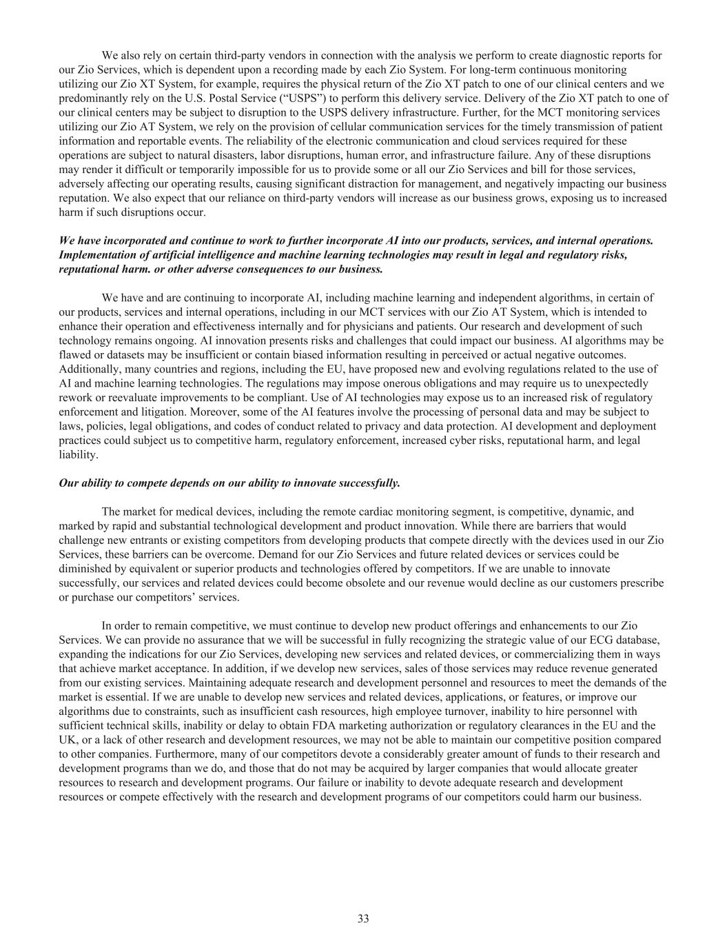 We also rely on certain third-party vendors in connection with the analysis we perform to create diagnostic reports for our Zio Services, which is dependent upon a recording made by each Zio System. For long-term continuous monitoring utilizing our Zio XT System, for example, requires the physical return of the Zio XT patch to one of our clinical centers and we predominantly rely on the U.S. Postal Service (“USPS”) to perform this delivery service. Delivery of the Zio XT patch to one of our clinical centers may be subject to disruption to the USPS delivery infrastructure. Further, for the MCT monitoring services utilizing our Zio AT System, we rely on the provision of cellular communication services for the timely transmission of patient information and reportable events. The reliability of the electronic communication and cloud services required for these operations are subject to natural disasters, labor disruptions, human error, and infrastructure failure. Any of these disruptions may render it difficult or temporarily impossible for us to provide some or all our Zio Services and bill for those services, adversely affecting our operating results, causing significant distraction for management, and negatively impacting our business reputation. We also expect that our reliance on third-party vendors will increase as our business grows, exposing us to increased harm if such disruptions occur. We have incorporated and continue to work to further incorporate AI into our products, services, and internal operations. Implementation of artificial intelligence and machine learning technologies may result in legal and regulatory risks, reputational harm. or other adverse consequences to our business. We have and are continuing to incorporate AI, including machine learning and independent algorithms, in certain of our products, services and internal operations, including in our MCT services with our Zio AT System, which is intended to enhance their operation and effectiveness internally and for physicians and patients. Our research and development of such technology remains ongoing. AI innovation presents risks and challenges that could impact our business. AI algorithms may be flawed or datasets may be insufficient or contain biased information resulting in perceived or actual negative outcomes. Additionally, many countries and regions, including the EU, have proposed new and evolving regulations related to the use of AI and machine learning technologies. The regulations may impose onerous obligations and may require us to unexpectedly rework or reevaluate improvements to be compliant. Use of AI technologies may expose us to an increased risk of regulatory enforcement and litigation. Moreover, some of the AI features involve the processing of personal data and may be subject to laws, policies, legal obligations, and codes of conduct related to privacy and data protection. AI development and deployment practices could subject us to competitive harm, regulatory enforcement, increased cyber risks, reputational harm, and legal liability. Our ability to compete depends on our ability to innovate successfully. The market for medical devices, including the remote cardiac monitoring segment, is competitive, dynamic, and marked by rapid and substantial technological development and product innovation. While there are barriers that would challenge new entrants or existing competitors from developing products that compete directly with the devices used in our Zio Services, these barriers can be overcome. Demand for our Zio Services and future related devices or services could be diminished by equivalent or superior products and technologies offered by competitors. If we are unable to innovate successfully, our services and related devices could become obsolete and our revenue would decline as our customers prescribe or purchase our competitors’ services. In order to remain competitive, we must continue to develop new product offerings and enhancements to our Zio Services. We can provide no assurance that we will be successful in fully recognizing the strategic value of our ECG database, expanding the indications for our Zio Services, developing new services and related devices, or commercializing them in ways that achieve market acceptance. In addition, if we develop new services, sales of those services may reduce revenue generated from our existing services. Maintaining adequate research and development personnel and resources to meet the demands of the market is essential. If we are unable to develop new services and related devices, applications, or features, or improve our algorithms due to constraints, such as insufficient cash resources, high employee turnover, inability to hire personnel with sufficient technical skills, inability or delay to obtain FDA marketing authorization or regulatory clearances in the EU and the UK, or a lack of other research and development resources, we may not be able to maintain our competitive position compared to other companies. Furthermore, many of our competitors devote a considerably greater amount of funds to their research and development programs than we do, and those that do not may be acquired by larger companies that would allocate greater resources to research and development programs. Our failure or inability to devote adequate research and development resources or compete effectively with the research and development programs of our competitors could harm our business. 33