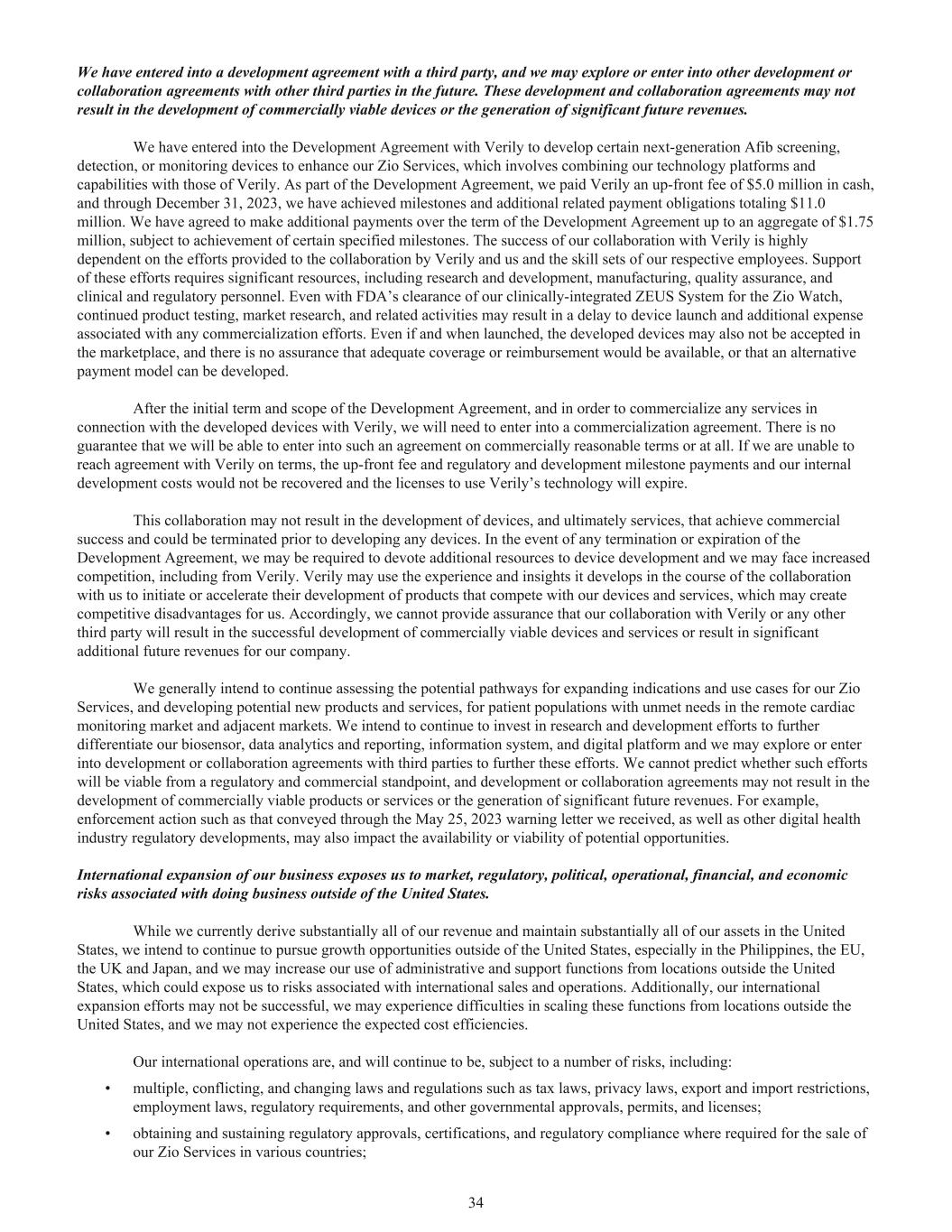 We have entered into a development agreement with a third party, and we may explore or enter into other development or collaboration agreements with other third parties in the future. These development and collaboration agreements may not result in the development of commercially viable devices or the generation of significant future revenues. We have entered into the Development Agreement with Verily to develop certain next-generation Afib screening, detection, or monitoring devices to enhance our Zio Services, which involves combining our technology platforms and capabilities with those of Verily. As part of the Development Agreement, we paid Verily an up-front fee of $5.0 million in cash, and through December 31, 2023, we have achieved milestones and additional related payment obligations totaling $11.0 million. We have agreed to make additional payments over the term of the Development Agreement up to an aggregate of $1.75 million, subject to achievement of certain specified milestones. The success of our collaboration with Verily is highly dependent on the efforts provided to the collaboration by Verily and us and the skill sets of our respective employees. Support of these efforts requires significant resources, including research and development, manufacturing, quality assurance, and clinical and regulatory personnel. Even with FDA’s clearance of our clinically-integrated ZEUS System for the Zio Watch, continued product testing, market research, and related activities may result in a delay to device launch and additional expense associated with any commercialization efforts. Even if and when launched, the developed devices may also not be accepted in the marketplace, and there is no assurance that adequate coverage or reimbursement would be available, or that an alternative payment model can be developed. After the initial term and scope of the Development Agreement, and in order to commercialize any services in connection with the developed devices with Verily, we will need to enter into a commercialization agreement. There is no guarantee that we will be able to enter into such an agreement on commercially reasonable terms or at all. If we are unable to reach agreement with Verily on terms, the up-front fee and regulatory and development milestone payments and our internal development costs would not be recovered and the licenses to use Verily’s technology will expire. This collaboration may not result in the development of devices, and ultimately services, that achieve commercial success and could be terminated prior to developing any devices. In the event of any termination or expiration of the Development Agreement, we may be required to devote additional resources to device development and we may face increased competition, including from Verily. Verily may use the experience and insights it develops in the course of the collaboration with us to initiate or accelerate their development of products that compete with our devices and services, which may create competitive disadvantages for us. Accordingly, we cannot provide assurance that our collaboration with Verily or any other third party will result in the successful development of commercially viable devices and services or result in significant additional future revenues for our company. We generally intend to continue assessing the potential pathways for expanding indications and use cases for our Zio Services, and developing potential new products and services, for patient populations with unmet needs in the remote cardiac monitoring market and adjacent markets. We intend to continue to invest in research and development efforts to further differentiate our biosensor, data analytics and reporting, information system, and digital platform and we may explore or enter into development or collaboration agreements with third parties to further these efforts. We cannot predict whether such efforts will be viable from a regulatory and commercial standpoint, and development or collaboration agreements may not result in the development of commercially viable products or services or the generation of significant future revenues. For example, enforcement action such as that conveyed through the May 25, 2023 warning letter we received, as well as other digital health industry regulatory developments, may also impact the availability or viability of potential opportunities. International expansion of our business exposes us to market, regulatory, political, operational, financial, and economic risks associated with doing business outside of the United States. While we currently derive substantially all of our revenue and maintain substantially all of our assets in the United States, we intend to continue to pursue growth opportunities outside of the United States, especially in the Philippines, the EU, the UK and Japan, and we may increase our use of administrative and support functions from locations outside the United States, which could expose us to risks associated with international sales and operations. Additionally, our international expansion efforts may not be successful, we may experience difficulties in scaling these functions from locations outside the United States, and we may not experience the expected cost efficiencies. Our international operations are, and will continue to be, subject to a number of risks, including: • multiple, conflicting, and changing laws and regulations such as tax laws, privacy laws, export and import restrictions, employment laws, regulatory requirements, and other governmental approvals, permits, and licenses; • obtaining and sustaining regulatory approvals, certifications, and regulatory compliance where required for the sale of our Zio Services in various countries; 34