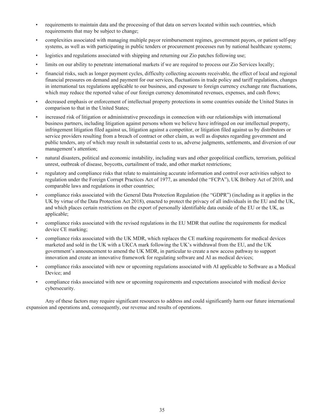 • requirements to maintain data and the processing of that data on servers located within such countries, which requirements that may be subject to change; • complexities associated with managing multiple payor reimbursement regimes, government payors, or patient self-pay systems, as well as with participating in public tenders or procurement processes run by national healthcare systems; • logistics and regulations associated with shipping and returning our Zio patches following use; • limits on our ability to penetrate international markets if we are required to process our Zio Services locally; • financial risks, such as longer payment cycles, difficulty collecting accounts receivable, the effect of local and regional financial pressures on demand and payment for our services, fluctuations in trade policy and tariff regulations, changes in international tax regulations applicable to our business, and exposure to foreign currency exchange rate fluctuations, which may reduce the reported value of our foreign currency denominated revenues, expenses, and cash flows; • decreased emphasis or enforcement of intellectual property protections in some countries outside the United States in comparison to that in the United States; • increased risk of litigation or administrative proceedings in connection with our relationships with international business partners, including litigation against persons whom we believe have infringed on our intellectual property, infringement litigation filed against us, litigation against a competitor, or litigation filed against us by distributors or service providers resulting from a breach of contract or other claim, as well as disputes regarding government and public tenders, any of which may result in substantial costs to us, adverse judgments, settlements, and diversion of our management’s attention; • natural disasters, political and economic instability, including wars and other geopolitical conflicts, terrorism, political unrest, outbreak of disease, boycotts, curtailment of trade, and other market restrictions; • regulatory and compliance risks that relate to maintaining accurate information and control over activities subject to regulation under the Foreign Corrupt Practices Act of 1977, as amended (the “FCPA”), UK Bribery Act of 2010, and comparable laws and regulations in other countries; • compliance risks associated with the General Data Protection Regulation (the “GDPR”) (including as it applies in the UK by virtue of the Data Protection Act 2018), enacted to protect the privacy of all individuals in the EU and the UK, and which places certain restrictions on the export of personally identifiable data outside of the EU or the UK, as applicable; • compliance risks associated with the revised regulations in the EU MDR that outline the requirements for medical device CE marking; • compliance risks associated with the UK MDR, which replaces the CE marking requirements for medical devices marketed and sold in the UK with a UKCA mark following the UK’s withdrawal from the EU, and the UK government’s announcement to amend the UK MDR, in particular to create a new access pathway to support innovation and create an innovative framework for regulating software and AI as medical devices; • compliance risks associated with new or upcoming regulations associated with AI applicable to Software as a Medical Device; and • compliance risks associated with new or upcoming requirements and expectations associated with medical device cybersecurity. Any of these factors may require significant resources to address and could significantly harm our future international expansion and operations and, consequently, our revenue and results of operations. 35