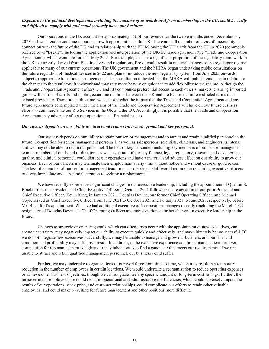 Exposure to UK political developments, including the outcome of its withdrawal from membership in the EU, could be costly and difficult to comply with and could seriously harm our business. Our operations in the UK account for approximately 1% of our revenue for the twelve months ended December 31, 2023 and we intend to continue to pursue growth opportunities in the UK. There are still a number of areas of uncertainty in connection with the future of the UK and its relationship with the EU following the UK’s exit from the EU in 2020 (commonly referred to as “Brexit”), including the application and interpretation of the UK-EU trade agreement (the “Trade and Cooperation Agreement”), which went into force in May 2021. For example, because a significant proportion of the regulatory framework in the UK is currently derived from EU directives and regulations, Brexit could result in material changes to the regulatory regime applicable to many of our current operations. The UK government and the MHRA began undertaking public consultations on the future regulation of medical devices in 2022 and plan to introduce the new regulatory system from July 2025 onwards, subject to appropriate transitional arrangements. The consultation indicated that the MHRA will publish guidance in relation to the changes to the regulatory framework and may rely more heavily on guidance to add flexibility to the regime. Although the Trade and Cooperation Agreement offers UK and EU companies preferential access to each other’s markets, ensuring imported goods will be free of tariffs and quotas, economic relations between the UK and the EU are on more restricted terms than existed previously. Therefore, at this time, we cannot predict the impact that the Trade and Cooperation Agreement and any future agreements contemplated under the terms of the Trade and Cooperation Agreement will have on our future business efforts to commercialize our Zio Services in the UK and the EU. Accordingly, it is possible that the Trade and Cooperation Agreement may adversely affect our operations and financial results. Our success depends on our ability to attract and retain senior management and key personnel. Our success depends on our ability to retain our senior management and to attract and retain qualified personnel in the future. Competition for senior management personnel, as well as salespersons, scientists, clinicians, and engineers, is intense and we may not be able to retain our personnel. The loss of key personnel, including key members of our senior management team or members of our board of directors, as well as certain of our key finance, legal, regulatory, research and development, quality, and clinical personnel, could disrupt our operations and have a material and adverse effect on our ability to grow our business. Each of our officers may terminate their employment at any time without notice and without cause or good reason. The loss of a member of our senior management team or our professional staff would require the remaining executive officers to divert immediate and substantial attention to seeking a replacement. We have recently experienced significant changes in our executive leadership, including the appointment of Quentin S. Blackford as our President and Chief Executive Officer in October 2021 following the resignation of our prior President and Chief Executive Officer, Kevin King, in January 2021. Douglas Devine, our former Chief Operating Officer, and Michael Coyle served as Chief Executive Officer from June 2021 to October 2021 and January 2021 to June 2021, respectively, before Mr. Blackford’s appointment. We have had additional executive officer positions changes recently (including the March 2023 resignation of Douglas Devine as Chief Operating Officer) and may experience further changes in executive leadership in the future. Changes to strategic or operating goals, which can often times occur with the appointment of new executives, can create uncertainty, may negatively impact our ability to execute quickly and effectively, and may ultimately be unsuccessful. If we do not integrate new executives successfully, we may be unable to manage and grow our business, and our financial condition and profitability may suffer as a result. In addition, to the extent we experience additional management turnover, competition for top management is high and it may take months to find a candidate that meets our requirements. If we are unable to attract and retain qualified management personnel, our business could suffer. Further, we may undertake reorganizations of our workforce from time to time, which may result in a temporary reduction in the number of employees in certain locations. We would undertake a reorganization to reduce operating expenses or achieve other business objectives, though we cannot guarantee any specific amount of long-term cost savings. Further, the turnover in our employee base could result in operational and administrative inefficiencies, which could adversely impact the results of our operations, stock price, and customer relationships, could complicate our efforts to retain other valuable employees, and could make recruiting for future management and other positions more difficult. 36