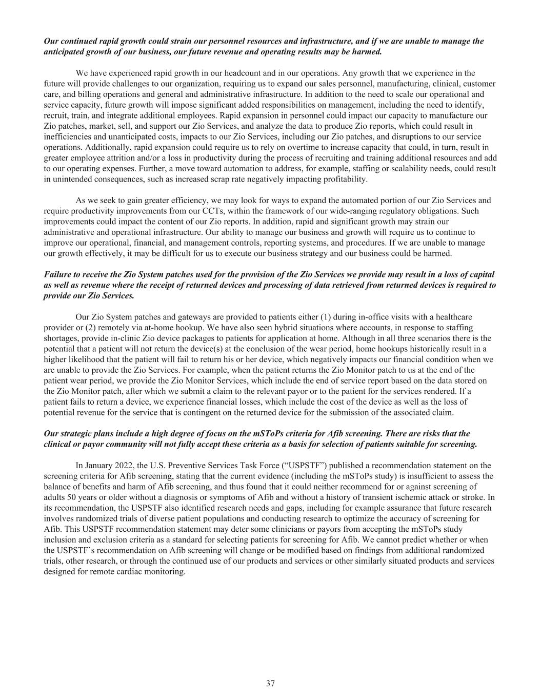 Our continued rapid growth could strain our personnel resources and infrastructure, and if we are unable to manage the anticipated growth of our business, our future revenue and operating results may be harmed. We have experienced rapid growth in our headcount and in our operations. Any growth that we experience in the future will provide challenges to our organization, requiring us to expand our sales personnel, manufacturing, clinical, customer care, and billing operations and general and administrative infrastructure. In addition to the need to scale our operational and service capacity, future growth will impose significant added responsibilities on management, including the need to identify, recruit, train, and integrate additional employees. Rapid expansion in personnel could impact our capacity to manufacture our Zio patches, market, sell, and support our Zio Services, and analyze the data to produce Zio reports, which could result in inefficiencies and unanticipated costs, impacts to our Zio Services, including our Zio patches, and disruptions to our service operations. Additionally, rapid expansion could require us to rely on overtime to increase capacity that could, in turn, result in greater employee attrition and/or a loss in productivity during the process of recruiting and training additional resources and add to our operating expenses. Further, a move toward automation to address, for example, staffing or scalability needs, could result in unintended consequences, such as increased scrap rate negatively impacting profitability. As we seek to gain greater efficiency, we may look for ways to expand the automated portion of our Zio Services and require productivity improvements from our CCTs, within the framework of our wide-ranging regulatory obligations. Such improvements could impact the content of our Zio reports. In addition, rapid and significant growth may strain our administrative and operational infrastructure. Our ability to manage our business and growth will require us to continue to improve our operational, financial, and management controls, reporting systems, and procedures. If we are unable to manage our growth effectively, it may be difficult for us to execute our business strategy and our business could be harmed. Failure to receive the Zio System patches used for the provision of the Zio Services we provide may result in a loss of capital as well as revenue where the receipt of returned devices and processing of data retrieved from returned devices is required to provide our Zio Services. Our Zio System patches and gateways are provided to patients either (1) during in-office visits with a healthcare provider or (2) remotely via at-home hookup. We have also seen hybrid situations where accounts, in response to staffing shortages, provide in-clinic Zio device packages to patients for application at home. Although in all three scenarios there is the potential that a patient will not return the device(s) at the conclusion of the wear period, home hookups historically result in a higher likelihood that the patient will fail to return his or her device, which negatively impacts our financial condition when we are unable to provide the Zio Services. For example, when the patient returns the Zio Monitor patch to us at the end of the patient wear period, we provide the Zio Monitor Services, which include the end of service report based on the data stored on the Zio Monitor patch, after which we submit a claim to the relevant payor or to the patient for the services rendered. If a patient fails to return a device, we experience financial losses, which include the cost of the device as well as the loss of potential revenue for the service that is contingent on the returned device for the submission of the associated claim. Our strategic plans include a high degree of focus on the mSToPs criteria for Afib screening. There are risks that the clinical or payor community will not fully accept these criteria as a basis for selection of patients suitable for screening. In January 2022, the U.S. Preventive Services Task Force (“USPSTF”) published a recommendation statement on the screening criteria for Afib screening, stating that the current evidence (including the mSToPs study) is insufficient to assess the balance of benefits and harm of Afib screening, and thus found that it could neither recommend for or against screening of adults 50 years or older without a diagnosis or symptoms of Afib and without a history of transient ischemic attack or stroke. In its recommendation, the USPSTF also identified research needs and gaps, including for example assurance that future research involves randomized trials of diverse patient populations and conducting research to optimize the accuracy of screening for Afib. This USPSTF recommendation statement may deter some clinicians or payors from accepting the mSToPs study inclusion and exclusion criteria as a standard for selecting patients for screening for Afib. We cannot predict whether or when the USPSTF’s recommendation on Afib screening will change or be modified based on findings from additional randomized trials, other research, or through the continued use of our products and services or other similarly situated products and services designed for remote cardiac monitoring. 37