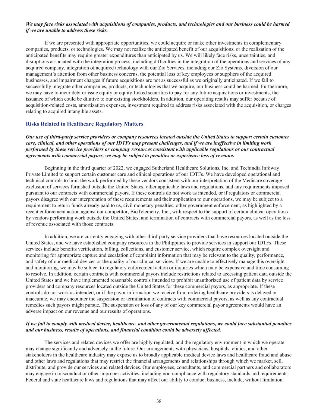 We may face risks associated with acquisitions of companies, products, and technologies and our business could be harmed if we are unable to address these risks. If we are presented with appropriate opportunities, we could acquire or make other investments in complementary companies, products, or technologies. We may not realize the anticipated benefit of our acquisitions, or the realization of the anticipated benefits may require greater expenditures than anticipated by us. We will likely face risks, uncertainties, and disruptions associated with the integration process, including difficulties in the integration of the operations and services of any acquired company, integration of acquired technology with our Zio Services, including our Zio Systems, diversion of our management’s attention from other business concerns, the potential loss of key employees or suppliers of the acquired businesses, and impairment charges if future acquisitions are not as successful as we originally anticipated. If we fail to successfully integrate other companies, products, or technologies that we acquire, our business could be harmed. Furthermore, we may have to incur debt or issue equity or equity-linked securities to pay for any future acquisitions or investments, the issuance of which could be dilutive to our existing stockholders. In addition, our operating results may suffer because of acquisition-related costs, amortization expenses, investment required to address risks associated with the acquisition, or charges relating to acquired intangible assets. Risks Related to Healthcare Regulatory Matters Our use of third-party service providers or company resources located outside the United States to support certain customer care, clinical, and other operations of our IDTFs may present challenges, and if we are ineffective in limiting work performed by these service providers or company resources consistent with applicable regulations or our contractual agreements with commercial payors, we may be subject to penalties or experience loss of revenue. Beginning in the third quarter of 2022, we engaged Sutherland Healthcare Solutions, Inc. and Techindia Infoway Private Limited to support certain customer care and clinical operations of our IDTFs. We have developed operational and technical controls to limit the work performed by these vendors consistent with our interpretation of the Medicare coverage exclusion of services furnished outside the United States, other applicable laws and regulations, and any requirements imposed pursuant to our contracts with commercial payors. If these controls do not work as intended, or if regulators or commercial payors disagree with our interpretation of these requirements and their application to our operations, we may be subject to a requirement to return funds already paid to us, civil monetary penalties, other government enforcement, as highlighted by a recent enforcement action against our competitor, BioTelemetry, Inc., with respect to the support of certain clinical operations by vendors performing work outside the United States, and termination of contracts with commercial payors, as well as the loss of revenue associated with those contracts. In addition, we are currently engaging with other third-party service providers that have resources located outside the United States, and we have established company resources in the Philippines to provide services in support our IDTFs. These services include benefits verification, billing, collections, and customer service, which require complex oversight and monitoring for appropriate capture and escalation of complaint information that may be relevant to the quality, performance, and safety of our medical devices or the quality of our clinical services. If we are unable to effectively manage this oversight and monitoring, we may be subject to regulatory enforcement action or inquiries which may be expensive and time consuming to resolve. In addition, certain contracts with commercial payors include restrictions related to accessing patient data outside the United States and we have implemented reasonable controls intended to prohibit unauthorized use of patient data by service providers and company resources located outside the United States for these commercial payors, as appropriate. If these controls do not work as intended, or if the payor information we receive from ordering healthcare providers is delayed or inaccurate, we may encounter the suspension or termination of contracts with commercial payors, as well as any contractual remedies such payors might pursue. The suspension or loss of any of our key commercial payor agreements would have an adverse impact on our revenue and our results of operations. If we fail to comply with medical device, healthcare, and other governmental regulations, we could face substantial penalties and our business, results of operations, and financial condition could be adversely affected. The services and related devices we offer are highly regulated, and the regulatory environment in which we operate may change significantly and adversely in the future. Our arrangements with physicians, hospitals, clinics, and other stakeholders in the healthcare industry may expose us to broadly applicable medical device laws and healthcare fraud and abuse and other laws and regulations that may restrict the financial arrangements and relationships through which we market, sell, distribute, and provide our services and related devices. Our employees, consultants, and commercial partners and collaborators may engage in misconduct or other improper activities, including non-compliance with regulatory standards and requirements. Federal and state healthcare laws and regulations that may affect our ability to conduct business, include, without limitation: 38