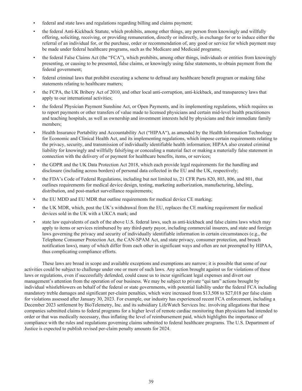 • federal and state laws and regulations regarding billing and claims payment; • the federal Anti-Kickback Statute, which prohibits, among other things, any person from knowingly and willfully offering, soliciting, receiving, or providing remuneration, directly or indirectly, in exchange for or to induce either the referral of an individual for, or the purchase, order or recommendation of, any good or service for which payment may be made under federal healthcare programs, such as the Medicare and Medicaid programs; • the federal False Claims Act (the “FCA”), which prohibits, among other things, individuals or entities from knowingly presenting, or causing to be presented, false claims, or knowingly using false statements, to obtain payment from the federal government; • federal criminal laws that prohibit executing a scheme to defraud any healthcare benefit program or making false statements relating to healthcare matters; • the FCPA, the UK Bribery Act of 2010, and other local anti-corruption, anti-kickback, and transparency laws that apply to our international activities; • the federal Physician Payment Sunshine Act, or Open Payments, and its implementing regulations, which requires us to report payments or other transfers of value made to licensed physicians and certain mid-level health practitioners and teaching hospitals, as well as ownership and investment interests held by physicians and their immediate family members; • Health Insurance Portability and Accountability Act (“HIPAA“), as amended by the Health Information Technology for Economic and Clinical Health Act, and its implementing regulations, which impose certain requirements relating to the privacy, security, and transmission of individually identifiable health information; HIPAA also created criminal liability for knowingly and willfully falsifying or concealing a material fact or making a materially false statement in connection with the delivery of or payment for healthcare benefits, items, or services; • the GDPR and the UK Data Protection Act 2018, which each provide legal requirements for the handling and disclosure (including across borders) of personal data collected in the EU and the UK, respectively; • the FDA’s Code of Federal Regulations, including but not limited to, 21 CFR Parts 820, 803, 806, and 801, that outlines requirements for medical device design, testing, marketing authorization, manufacturing, labeling, distribution, and post-market surveillance requirements; • the EU MDD and EU MDR that outline requirements for medical device CE marking; • the UK MDR, which, post the UK’s withdrawal from the EU, replaces the CE marking requirement for medical devices sold in the UK with a UKCA mark; and • state law equivalents of each of the above U.S. federal laws, such as anti-kickback and false claims laws which may apply to items or services reimbursed by any third-party payor, including commercial insurers, and state and foreign laws governing the privacy and security of individually identifiable information in certain circumstances (e.g., the Telephone Consumer Protection Act, the CAN-SPAM Act, and state privacy, consumer protection, and breach notification laws), many of which differ from each other in significant ways and often are not preempted by HIPAA, thus complicating compliance efforts. These laws are broad in scope and available exceptions and exemptions are narrow; it is possible that some of our activities could be subject to challenge under one or more of such laws. Any action brought against us for violations of these laws or regulations, even if successfully defended, could cause us to incur significant legal expenses and divert our management’s attention from the operation of our business. We may be subject to private “qui tam” actions brought by individual whistleblowers on behalf of the federal or state governments, with potential liability under the federal FCA including mandatory treble damages and significant per-claim penalties, which were increased from $13,508 to $27,018 per false claim for violations assessed after January 30, 2023. For example, our industry has experienced recent FCA enforcement, including a December 2023 settlement by BioTelemetry, Inc. and its subsidiary LifeWatch Services Inc. involving allegations that these companies submitted claims to federal programs for a higher level of remote cardiac monitoring than physicians had intended to order or that was medically necessary, thus inflating the level of reimbursement paid, which highlights the importance of compliance with the rules and regulations governing claims submitted to federal healthcare programs. The U.S. Department of Justice is expected to publish revised per-claim penalty amounts for 2024. 39