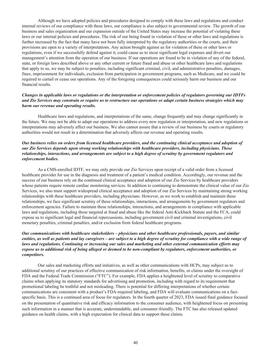 Although we have adopted policies and procedures designed to comply with these laws and regulations and conduct internal reviews of our compliance with these laws, our compliance is also subject to governmental review. The growth of our business and sales organization and our expansion outside of the United States may increase the potential of violating these laws or our internal policies and procedures. The risk of our being found in violation of these or other laws and regulations is further increased by the fact that many have not been fully interpreted by the regulatory authorities or the courts, and their provisions are open to a variety of interpretations. Any action brought against us for violation of these or other laws or regulations, even if we successfully defend against it, could cause us to incur significant legal expenses and divert our management’s attention from the operation of our business. If our operations are found to be in violation of any of the federal, state, or foreign laws described above or any other current or future fraud and abuse or other healthcare laws and regulations that apply to us, we may be subject to penalties, including significant criminal, civil, and administrative penalties, damages, fines, imprisonment for individuals, exclusion from participation in government programs, such as Medicare, and we could be required to curtail or cease our operations. Any of the foregoing consequences could seriously harm our business and our financial results. Changes in applicable laws or regulations or the interpretation or enforcement policies of regulators governing our IDTFs and Zio Services may constrain or require us to restructure our operations or adapt certain business strategies which may harm our revenue and operating results. Healthcare laws and regulations, and interpretations of the same, change frequently and may change significantly in the future. We may not be able to adapt our operations to address every new regulation or interpretation, and new regulations or interpretations may adversely affect our business. We also cannot assure that a review of our business by courts or regulatory authorities would not result in a determination that adversely affects our revenue and operating results. Our business relies on orders from licensed healthcare providers, and the continuing clinical acceptance and adoption of our Zio Services depends upon strong working relationships with healthcare providers, including physicians. These relationships, interactions, and arrangements are subject to a high degree of scrutiny by government regulators and enforcement bodies. As a CMS-enrolled IDTF, we may only provide our Zio Services upon receipt of a valid order from a licensed healthcare provider for use in the diagnosis and treatment of a patient’s medical condition. Accordingly, our revenue and the success of our business rely on the continued clinical acceptance and adoption of our Zio Services by healthcare providers whose patients require remote cardiac monitoring services. In addition to continuing to demonstrate the clinical value of our Zio Services, we also must support widespread clinical acceptance and adoption of our Zio Services by maintaining strong working relationships with these healthcare providers, including physicians. However, as we work to establish and maintain these relationships, we face significant scrutiny of these relationships, interactions, and arrangements by government regulators and enforcement agencies. Failure to maintain these relationships, interactions, and arrangements in compliance with applicable laws and regulations, including those targeted at fraud and abuse like the federal Anti-Kickback Statute and the FCA, could expose us to significant legal and financial repercussions, including government civil and criminal investigations, civil monetary penalties, criminal penalties, and/or exclusion from federal healthcare programs. Our communications with healthcare stakeholders – physicians and other healthcare professionals, payors, and similar entities, as well as patients and lay caregivers – are subject to a high degree of scrutiny for compliance with a wide range of laws and regulations. Continuing or increasing our sales and marketing and other external communication efforts may expose us to additional risk of being alleged or deemed to be non-compliant by regulators, enforcement authorities, or competitors. Our sales and marketing efforts and initiatives, as well as other communications with HCPs, may subject us to additional scrutiny of our practices of effective communication of risk information, benefits, or claims under the oversight of FDA and the Federal Trade Commission (“FTC”). For example, FDA applies a heightened level of scrutiny to comparative claims when applying its statutory standards for advertising and promotion, including with regard to its requirement that promotional labeling be truthful and not misleading. There is potential for differing interpretations of whether certain communications are consistent with a product’s FDA-required labeling, and FDA will evaluate communications on a fact- specific basis. This is a continued area of focus for regulators. In the fourth quarter of 2023, FDA issued final guidance focused on the presentation of quantitative risk and efficacy information to the consumer audience, with heightened focus on presenting such information in a manner that is accurate, understandable, and consumer-friendly. The FTC has also released updated guidance on health claims, with a high expectation for clinical data to support these claims. 40
