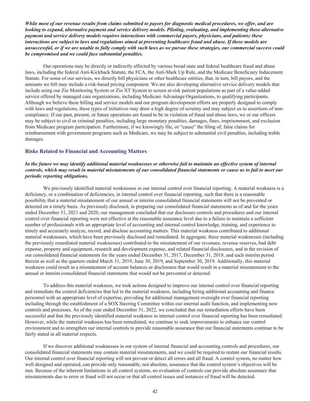 While most of our revenue results from claims submitted to payors for diagnostic medical procedures, we offer, and are looking to expand, alternative payment and service delivery models. Piloting, evaluating, and implementing these alternative payment and service delivery models requires interactions with commercial payors, physicians, and patients; these interactions are subject to laws and regulations aimed at preventing healthcare fraud and abuse. If these models are unsuccessful, or if we are unable to fully comply with such laws as we pursue these strategies, our commercial success could be compromised and we could face substantial penalties. Our operations may be directly or indirectly affected by various broad state and federal healthcare fraud and abuse laws, including the federal Anti-Kickback Statute, the FCA, the Anti-Mark Up Rule, and the Medicare Beneficiary Inducement Statute. For some of our services, we directly bill physicians or other healthcare entities, that, in turn, bill payors, and the amounts we bill may include a risk-based pricing component. We are also developing alternative service delivery models that include using our Zio Monitoring System or Zio XT System to screen at-risk patient populations as part of a value-added service offered by managed care organizations, including Medicare Advantage Organizations, to qualifying participants. Although we believe these billing and service models and our program development efforts are properly designed to comply with laws and regulations, these types of initiatives may draw a high degree of scrutiny and may subject us to assertions of non- compliance. If our past, present, or future operations are found to be in violation of fraud and abuse laws, we or our officers may be subject to civil or criminal penalties, including large monetary penalties, damages, fines, imprisonment, and exclusion from Medicare program participation. Furthermore, if we knowingly file, or “cause” the filing of, false claims for reimbursement with government programs such as Medicare, we may be subject to substantial civil penalties, including treble damages. Risks Related to Financial and Accounting Matters In the future we may identify additional material weaknesses or otherwise fail to maintain an effective system of internal controls, which may result in material misstatements of our consolidated financial statements or cause us to fail to meet our periodic reporting obligations. We previously identified material weaknesses in our internal control over financial reporting. A material weakness is a deficiency, or a combination of deficiencies, in internal control over financial reporting, such that there is a reasonable possibility that a material misstatement of our annual or interim consolidated financial statements will not be prevented or detected on a timely basis. As previously disclosed, in preparing our consolidated financial statements as of and for the years ended December 31, 2021 and 2020, our management concluded that our disclosure controls and procedures and our internal control over financial reporting were not effective at the reasonable assurance level due to a failure to maintain a sufficient number of professionals with an appropriate level of accounting and internal control knowledge, training, and experience to timely and accurately analyze, record, and disclose accounting matters. This material weakness contributed to additional material weaknesses, which have been previously disclosed and remediated. In aggregate, these material weaknesses (including the previously remediated material weaknesses) contributed to the misstatement of our revenues, revenue reserves, bad debt expense, property and equipment, research and development expense, and related financial disclosures, and in the revision of our consolidated financial statements for the years ended December 31, 2017, December 31, 2018, and each interim period therein as well as the quarters ended March 31, 2019, June 30, 2019, and September 30, 2019. Additionally, this material weakness could result in a misstatement of account balances or disclosures that would result in a material misstatement to the annual or interim consolidated financial statements that would not be prevented or detected. To address this material weakness, we took actions designed to improve our internal control over financial reporting and remediate the control deficiencies that led to the material weakness, including hiring additional accounting and finance personnel with an appropriate level of expertise, providing for additional management oversight over financial reporting including through the establishment of a SOX Steering Committee within our internal audit function, and implementing new controls and processes. As of the year ended December 31, 2022, we concluded that our remediation efforts have been successful and that the previously identified material weakness in internal control over financial reporting has been remediated. However, while the material weakness has been remediated, we continue to seek improvements to enhance our control environment and to strengthen our internal controls to provide reasonable assurance that our financial statements continue to be fairly stated in all material respects. If we discover additional weaknesses in our system of internal financial and accounting controls and procedures, our consolidated financial statements may contain material misstatements, and we could be required to restate our financial results. Our internal control over financial reporting will not prevent or detect all errors and all fraud. A control system, no matter how well designed and operated, can provide only reasonable, not absolute, assurance that the control system’s objectives will be met. Because of the inherent limitations in all control systems, no evaluation of controls can provide absolute assurance that misstatements due to error or fraud will not occur or t