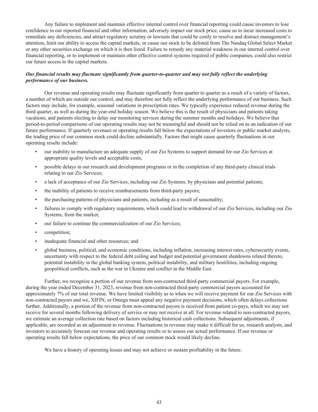 Any failure to implement and maintain effective internal control over financial reporting could cause investors to lose confidence in our reported financial and other information, adversely impact our stock price, cause us to incur increased costs to remediate any deficiencies, and attract regulatory scrutiny or lawsuits that could be costly to resolve and distract management’s attention, limit our ability to access the capital markets, or cause our stock to be delisted from The Nasdaq Global Select Market or any other securities exchange on which it is then listed. Failure to remedy any material weakness in our internal control over financial reporting, or to implement or maintain other effective control systems required of public companies, could also restrict our future access to the capital markets. Our financial results may fluctuate significantly from quarter-to-quarter and may not fully reflect the underlying performance of our business. Our revenue and operating results may fluctuate significantly from quarter to quarter as a result of a variety of factors, a number of which are outside our control, and may therefore not fully reflect the underlying performance of our business. Such factors may include, for example, seasonal variations in prescription rates. We typically experience reduced revenue during the third quarter, as well as during the year-end holiday season. We believe this is the result of physicians and patients taking vacations, and patients electing to delay our monitoring services during the summer months and holidays. We believe that period-to-period comparisons of our operating results may not be meaningful and should not be relied on as an indication of our future performance. If quarterly revenues or operating results fall below the expectations of investors or public market analysts, the trading price of our common stock could decline substantially. Factors that might cause quarterly fluctuations in our operating results include: • our inability to manufacture an adequate supply of our Zio Systems to support demand for our Zio Services at appropriate quality levels and acceptable costs; • possible delays in our research and development programs or in the completion of any third-party clinical trials relating to our Zio Services; • a lack of acceptance of our Zio Services, including our Zio Systems, by physicians and potential patients; • the inability of patients to receive reimbursements from third-party payors; • the purchasing patterns of physicians and patients, including as a result of seasonality; • failures to comply with regulatory requirements, which could lead to withdrawal of our Zio Services, including our Zio Systems, from the market; • our failure to continue the commercialization of our Zio Services; • competition; • inadequate financial and other resources; and • global business, political, and economic conditions, including inflation, increasing interest rates, cybersecurity events, uncertainty with respect to the federal debt ceiling and budget and potential government shutdowns related thereto, potential instability in the global banking system, political instability, and military hostilities, including ongoing geopolitical conflicts, such as the war in Ukraine and conflict in the Middle East. Further, we recognize a portion of our revenue from non-contracted third-party commercial payors. For example, during the year ended December 31, 2023, revenue from non-contracted third-party commercial payors accounted for approximately 7% of our total revenue. We have limited visibility as to when we will receive payment for our Zio Services with non-contracted payors and we, XIFIN, or Omega must appeal any negative payment decisions, which often delays collections further. Additionally, a portion of the revenue from non-contracted payors is received from patient co-pays, which we may not receive for several months following delivery of service or may not receive at all. For revenue related to non-contracted payors, we estimate an average collection rate based on factors including historical cash collections. Subsequent adjustments, if applicable, are recorded as an adjustment to revenue. Fluctuations in revenue may make it difficult for us, research analysts, and investors to accurately forecast our revenue and operating results or to assess our actual performance. If our revenue or operating results fall below expectations, the price of our common stock would likely decline. We have a history of operating losses and may not achieve or sustain profitability in the future. 43