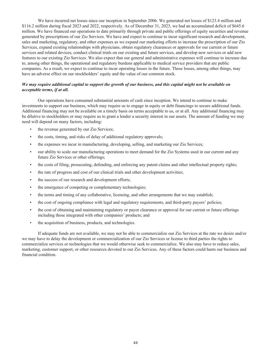 We have incurred net losses since our inception in September 2006. We generated net losses of $123.4 million and $116.2 million during fiscal 2023 and 2022, respectively. As of December 31, 2023, we had an accumulated deficit of $645.6 million. We have financed our operations to date primarily through private and public offerings of equity securities and revenue generated by prescriptions of our Zio Services. We have and expect to continue to incur significant research and development, sales and marketing, regulatory, and other expenses as we expand our marketing efforts to increase the prescription of our Zio Services, expand existing relationships with physicians, obtain regulatory clearances or approvals for our current or future services and related devices, conduct clinical trials on our existing and future services, and develop new services or add new features to our existing Zio Services. We also expect that our general and administrative expenses will continue to increase due to, among other things, the operational and regulatory burdens applicable to medical service providers that are public companies. As a result, we expect to continue to incur operating losses in the future. These losses, among other things, may have an adverse effect on our stockholders’ equity and the value of our common stock. We may require additional capital to support the growth of our business, and this capital might not be available on acceptable terms, if at all. Our operations have consumed substantial amounts of cash since inception. We intend to continue to make investments to support our business, which may require us to engage in equity or debt financings to secure additional funds. Additional financing may not be available on a timely basis on terms acceptable to us, or at all. Any additional financing may be dilutive to stockholders or may require us to grant a lender a security interest in our assets. The amount of funding we may need will depend on many factors, including: • the revenue generated by our Zio Services; • the costs, timing, and risks of delay of additional regulatory approvals; • the expenses we incur in manufacturing, developing, selling, and marketing our Zio Services; • our ability to scale our manufacturing operations to meet demand for the Zio Systems used in our current and any future Zio Services or other offerings; • the costs of filing, prosecuting, defending, and enforcing any patent claims and other intellectual property rights; • the rate of progress and cost of our clinical trials and other development activities; • the success of our research and development efforts; • the emergence of competing or complementary technologies; • the terms and timing of any collaborative, licensing, and other arrangements that we may establish; • the cost of ongoing compliance with legal and regulatory requirements, and third-party payors’ policies; • the cost of obtaining and maintaining regulatory or payor clearance or approval for our current or future offerings including those integrated with other companies’ products; and • the acquisition of business, products, and technologies. If adequate funds are not available, we may not be able to commercialize our Zio Services at the rate we desire and/or we may have to delay the development or commercialization of our Zio Services or license to third parties the rights to commercialize services or technologies that we would otherwise seek to commercialize. We also may have to reduce sales, marketing, customer support, or other resources devoted to our Zio Services. Any of these factors could harm our business and financial condition. 44