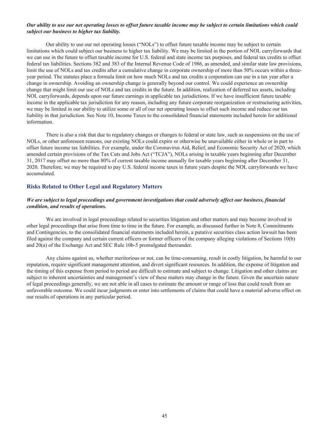 Our ability to use our net operating losses to offset future taxable income may be subject to certain limitations which could subject our business to higher tax liability. Our ability to use our net operating losses (“NOLs”) to offset future taxable income may be subject to certain limitations which could subject our business to higher tax liability. We may be limited in the portion of NOL carryforwards that we can use in the future to offset taxable income for U.S. federal and state income tax purposes, and federal tax credits to offset federal tax liabilities. Sections 382 and 383 of the Internal Revenue Code of 1986, as amended, and similar state law provisions, limit the use of NOLs and tax credits after a cumulative change in corporate ownership of more than 50% occurs within a three- year period. The statutes place a formula limit on how much NOLs and tax credits a corporation can use in a tax year after a change in ownership. Avoiding an ownership change is generally beyond our control. We could experience an ownership change that might limit our use of NOLs and tax credits in the future. In addition, realization of deferred tax assets, including NOL carryforwards, depends upon our future earnings in applicable tax jurisdictions. If we have insufficient future taxable income in the applicable tax jurisdiction for any reason, including any future corporate reorganization or restructuring activities, we may be limited in our ability to utilize some or all of our net operating losses to offset such income and reduce our tax liability in that jurisdiction. See Note 10, Income Taxes to the consolidated financial statements included herein for additional information. There is also a risk that due to regulatory changes or changes to federal or state law, such as suspensions on the use of NOLs, or other unforeseen reasons, our existing NOLs could expire or otherwise be unavailable either in whole or in part to offset future income tax liabilities. For example, under the Coronavirus Aid, Relief, and Economic Security Act of 2020, which amended certain provisions of the Tax Cuts and Jobs Act (“TCJA”), NOLs arising in taxable years beginning after December 31, 2017 may offset no more than 80% of current taxable income annually for taxable years beginning after December 31, 2020. Therefore, we may be required to pay U.S. federal income taxes in future years despite the NOL carryforwards we have accumulated. Risks Related to Other Legal and Regulatory Matters We are subject to legal proceedings and government investigations that could adversely affect our business, financial condition, and results of operations. We are involved in legal proceedings related to securities litigation and other matters and may become involved in other legal proceedings that arise from time to time in the future. For example, as discussed further in Note 8, Commitments and Contingencies, to the consolidated financial statements included herein, a putative securities class action lawsuit has been filed against the company and certain current officers or former officers of the company alleging violations of Sections 10(b) and 20(a) of the Exchange Act and SEC Rule 10b-5 promulgated thereunder. Any claims against us, whether meritorious or not, can be time-consuming, result in costly litigation, be harmful to our reputation, require significant management attention, and divert significant resources. In addition, the expense of litigation and the timing of this expense from period to period are difficult to estimate and subject to change. Litigation and other claims are subject to inherent uncertainties and management’s view of these matters may change in the future. Given the uncertain nature of legal proceedings generally, we are not able in all cases to estimate the amount or range of loss that could result from an unfavorable outcome. We could incur judgments or enter into settlements of claims that could have a material adverse effect on our results of operations in any particular period. 45