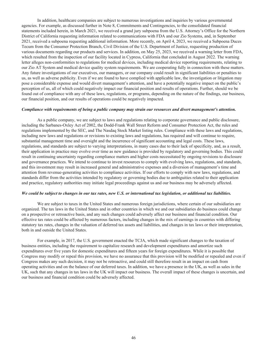 In addition, healthcare companies are subject to numerous investigations and inquiries by various governmental agencies. For example, as discussed further in Note 8, Commitments and Contingencies, to the consolidated financial statements included herein, in March 2021, we received a grand jury subpoena from the U.S. Attorney’s Office for the Northern District of California requesting information related to communications with FDA and our Zio Systems, and, in September 2021, received a subpoena requesting additional information. More recently, on April 4, 2023, we received a Subpoena Duces Tecum from the Consumer Protection Branch, Civil Division of the U.S. Department of Justice, requesting production of various documents regarding our products and services. In addition, on May 25, 2023, we received a warning letter from FDA, which resulted from the inspection of our facility located in Cypress, California that concluded in August 2022. The warning letter alleges non-conformities to regulations for medical devices, including medical device reporting requirements, relating to our Zio AT System and medical device quality system requirements. We are cooperating fully in connection with these matters. Any future investigations of our executives, our managers, or our company could result in significant liabilities or penalties to us, as well as adverse publicity. Even if we are found to have complied with applicable law, the investigation or litigation may pose a considerable expense and would divert management’s attention, and have a potentially negative impact on the public’s perception of us, all of which could negatively impact our financial position and results of operations. Further, should we be found out of compliance with any of these laws, regulations, or programs, depending on the nature of the findings, our business, our financial position, and our results of operations could be negatively impacted. Compliance with requirements of being a public company may strain our resources and divert management’s attention. As a public company, we are subject to laws and regulations relating to corporate governance and public disclosure, including the Sarbanes-Oxley Act of 2002, the Dodd-Frank Wall Street Reform and Consumer Protection Act, the rules and regulations implemented by the SEC, and The Nasdaq Stock Market listing rules. Compliance with these laws and regulations, including new laws and regulations or revisions to existing laws and regulations, has required and will continue to require, substantial management time and oversight and the incurrence of significant accounting and legal costs. These laws, regulations, and standards are subject to varying interpretations, in many cases due to their lack of specificity, and, as a result, their application in practice may evolve over time as new guidance is provided by regulatory and governing bodies. This could result in continuing uncertainty regarding compliance matters and higher costs necessitated by ongoing revisions to disclosure and governance practices. We intend to continue to invest resources to comply with evolving laws, regulations, and standards, and this investment may result in increased general and administrative expenses and a diversion of management’s time and attention from revenue-generating activities to compliance activities. If our efforts to comply with new laws, regulations, and standards differ from the activities intended by regulatory or governing bodies due to ambiguities related to their application and practice, regulatory authorities may initiate legal proceedings against us and our business may be adversely affected. We could be subject to changes in our tax rates, new U.S. or international tax legislation, or additional tax liabilities. We are subject to taxes in the United States and numerous foreign jurisdictions, where certain of our subsidiaries are organized. The tax laws in the United States and in other countries in which we and our subsidiaries do business could change on a prospective or retroactive basis, and any such changes could adversely affect our business and financial condition. Our effective tax rates could be affected by numerous factors, including changes in the mix of earnings in countries with differing statutory tax rates, changes in the valuation of deferred tax assets and liabilities, and changes in tax laws or their interpretation, both in and outside the United States. For example, in 2017, the U.S. government enacted the TCJA, which made significant changes to the taxation of business entities, including the requirement to capitalize research and development expenditures and amortize such expenditures over five years for domestic expenditures and fifteen years for foreign expenditures. While it is possible that Congress may modify or repeal this provision, we have no assurance that this provision will be modified or repealed and even if Congress makes any such decision, it may not be retroactive, and could still therefore result in an impact on cash from operating activities and on the balance of our deferred taxes. In addition, we have a presence in the UK, as well as sales in the UK, such that any changes in tax laws in the UK will impact our business. The overall impact of these changes is uncertain, and our business and financial condition could be adversely affected. 46