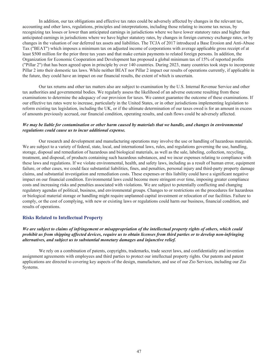 In addition, our tax obligations and effective tax rates could be adversely affected by changes in the relevant tax, accounting and other laws, regulations, principles and interpretations, including those relating to income tax nexus, by recognizing tax losses or lower than anticipated earnings in jurisdictions where we have lower statutory rates and higher than anticipated earnings in jurisdictions where we have higher statutory rates, by changes in foreign currency exchange rates, or by changes in the valuation of our deferred tax assets and liabilities. The TCJA of 2017 introduced a Base Erosion and Anti-Abuse Tax ("BEAT") which imposes a minimum tax on adjusted income of corporations with average applicable gross receipt of at least $500 million for the prior three tax years and that make certain payments to related foreign persons. In addition, the Organization for Economic Cooperation and Development has proposed a global minimum tax of 15% of reported profits ("Pillar 2") that has been agreed upon in principle by over 140 countries. During 2023, many countries took steps to incorporate Pillar 2 into their domestic tax laws. While neither BEAT nor Pillar 2 impact our results of operations currently, if applicable in the future, they could have an impact on our financial results, the extent of which is uncertain. Our tax returns and other tax matters also are subject to examination by the U.S. Internal Revenue Service and other tax authorities and governmental bodies. We regularly assess the likelihood of an adverse outcome resulting from these examinations to determine the adequacy of our provision for taxes. We cannot guarantee the outcome of these examinations. If our effective tax rates were to increase, particularly in the United States, or in other jurisdictions implementing legislation to reform existing tax legislation, including the UK, or if the ultimate determination of our taxes owed is for an amount in excess of amounts previously accrued, our financial condition, operating results, and cash flows could be adversely affected. We may be liable for contamination or other harm caused by materials that we handle, and changes in environmental regulations could cause us to incur additional expense. Our research and development and manufacturing operations may involve the use or handling of hazardous materials. We are subject to a variety of federal, state, local, and international laws, rules, and regulations governing the use, handling, storage, disposal and remediation of hazardous and biological materials, as well as the sale, labeling, collection, recycling, treatment, and disposal, of products containing such hazardous substances, and we incur expenses relating to compliance with these laws and regulations. If we violate environmental, health, and safety laws, including as a result of human error, equipment failure, or other cases, we could face substantial liabilities, fines, and penalties, personal injury and third-party property damage claims, and substantial investigation and remediation costs. These expenses or this liability could have a significant negative impact on our financial condition. Environmental laws could become more stringent over time, imposing greater compliance costs and increasing risks and penalties associated with violations. We are subject to potentially conflicting and changing regulatory agendas of political, business, and environmental groups. Changes to or restrictions on the procedures for hazardous or biological material storage or handling might require unplanned capital investment or relocation of our facilities. Failure to comply, or the cost of complying, with new or existing laws or regulations could harm our business, financial condition, and results of operations. Risks Related to Intellectual Property We are subject to claims of infringement or misappropriation of the intellectual property rights of others, which could prohibit us from shipping affected devices, require us to obtain licenses from third parties or to develop non-infringing alternatives, and subject us to substantial monetary damages and injunctive relief. We rely on a combination of patents, copyrights, trademarks, trade secret laws, and confidentiality and invention assignment agreements with employees and third parties to protect our intellectual property rights. Our patents and patent applications are directed to covering key aspects of the design, manufacture, and use of our Zio Services, including our Zio Systems. 47