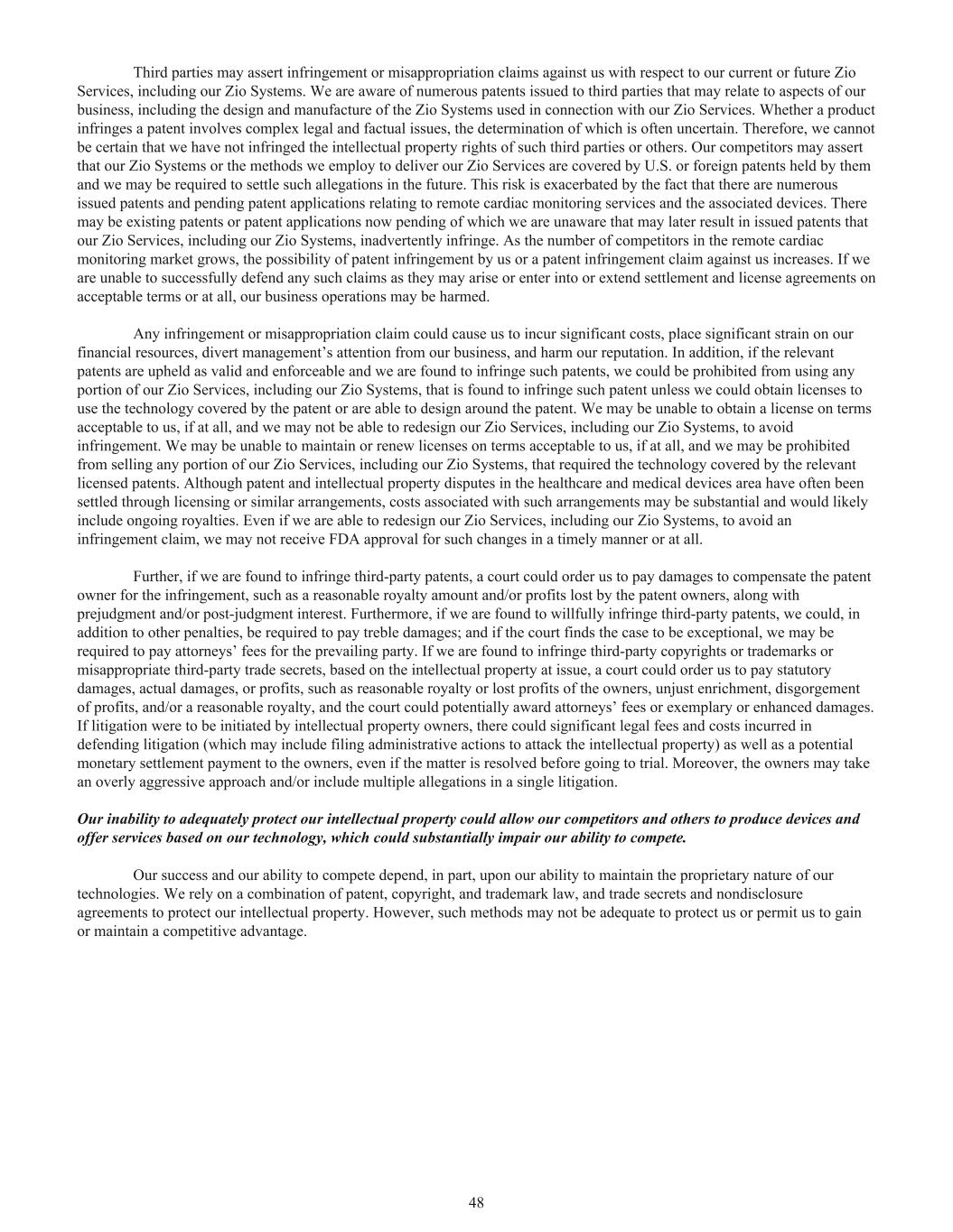 Third parties may assert infringement or misappropriation claims against us with respect to our current or future Zio Services, including our Zio Systems. We are aware of numerous patents issued to third parties that may relate to aspects of our business, including the design and manufacture of the Zio Systems used in connection with our Zio Services. Whether a product infringes a patent involves complex legal and factual issues, the determination of which is often uncertain. Therefore, we cannot be certain that we have not infringed the intellectual property rights of such third parties or others. Our competitors may assert that our Zio Systems or the methods we employ to deliver our Zio Services are covered by U.S. or foreign patents held by them and we may be required to settle such allegations in the future. This risk is exacerbated by the fact that there are numerous issued patents and pending patent applications relating to remote cardiac monitoring services and the associated devices. There may be existing patents or patent applications now pending of which we are unaware that may later result in issued patents that our Zio Services, including our Zio Systems, inadvertently infringe. As the number of competitors in the remote cardiac monitoring market grows, the possibility of patent infringement by us or a patent infringement claim against us increases. If we are unable to successfully defend any such claims as they may arise or enter into or extend settlement and license agreements on acceptable terms or at all, our business operations may be harmed. Any infringement or misappropriation claim could cause us to incur significant costs, place significant strain on our financial resources, divert management’s attention from our business, and harm our reputation. In addition, if the relevant patents are upheld as valid and enforceable and we are found to infringe such patents, we could be prohibited from using any portion of our Zio Services, including our Zio Systems, that is found to infringe such patent unless we could obtain licenses to use the technology covered by the patent or are able to design around the patent. We may be unable to obtain a license on terms acceptable to us, if at all, and we may not be able to redesign our Zio Services, including our Zio Systems, to avoid infringement. We may be unable to maintain or renew licenses on terms acceptable to us, if at all, and we may be prohibited from selling any portion of our Zio Services, including our Zio Systems, that required the technology covered by the relevant licensed patents. Although patent and intellectual property disputes in the healthcare and medical devices area have often been settled through licensing or similar arrangements, costs associated with such arrangements may be substantial and would likely include ongoing royalties. Even if we are able to redesign our Zio Services, including our Zio Systems, to avoid an infringement claim, we may not receive FDA approval for such changes in a timely manner or at all. Further, if we are found to infringe third-party patents, a court could order us to pay damages to compensate the patent owner for the infringement, such as a reasonable royalty amount and/or profits lost by the patent owners, along with prejudgment and/or post-judgment interest. Furthermore, if we are found to willfully infringe third-party patents, we could, in addition to other penalties, be required to pay treble damages; and if the court finds the case to be exceptional, we may be required to pay attorneys’ fees for the prevailing party. If we are found to infringe third-party copyrights or trademarks or misappropriate third-party trade secrets, based on the intellectual property at issue, a court could order us to pay statutory damages, actual damages, or profits, such as reasonable royalty or lost profits of the owners, unjust enrichment, disgorgement of profits, and/or a reasonable royalty, and the court could potentially award attorneys’ fees or exemplary or enhanced damages. If litigation were to be initiated by intellectual property owners, there could significant legal fees and costs incurred in defending litigation (which may include filing administrative actions to attack the intellectual property) as well as a potential monetary settlement payment to the owners, even if the matter is resolved before going to trial. Moreover, the owners may take an overly aggressive approach and/or include multiple allegations in a single litigation. Our inability to adequately protect our intellectual property could allow our competitors and others to produce devices and offer services based on our technology, which could substantially impair our ability to compete. Our success and our ability to compete depend, in part, upon our ability to maintain the proprietary nature of our technologies. We rely on a combination of patent, copyright, and trademark law, and trade secrets and nondisclosure agreements to protect our intellectual property. However, such methods may not be adequate to protect us or permit us to gain or maintain a competitive advantage. 48