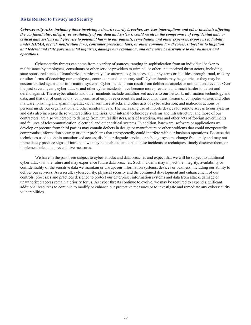 Risks Related to Privacy and Security Cybersecurity risks, including those involving network security breaches, services interruptions and other incidents affecting the confidentiality, integrity or availability of our data and systems, could result in the compromise of confidential data or critical data systems and give rise to potential harm to our patients, remediation and other expenses, expose us to liability under HIPAA, breach notification laws, consumer protection laws, or other common law theories, subject us to litigation and federal and state governmental inquiries, damage our reputation, and otherwise be disruptive to our business and operations. Cybersecurity threats can come from a variety of sources, ranging in sophistication from an individual hacker to malfeasance by employees, consultants or other service providers to criminal or other unauthorized threat actors, including state-sponsored attacks. Unauthorized parties may also attempt to gain access to our systems or facilities through fraud, trickery or other forms of deceiving our employees, contractors and temporary staff. Cyber threats may be generic, or they may be custom-crafted against our information systems. Cyber incidents can result from deliberate attacks or unintentional events. Over the past several years, cyber-attacks and other cyber incidents have become more prevalent and much harder to detect and defend against. These cyber attacks and other incidents include unauthorized access to our network, information technology and data, and that our of contractors; compromise of employee credentials and accounts; transmission of computer viruses and other malware; phishing and spamming attacks; ransomware attacks and other acts of cyber extortion; and malicious actions by persons inside our organization and other insider threats. The increasing use of mobile devices for remote access to our systems and data also increases these vulnerabilities and risks. Our internal technology systems and infrastructure, and those of our contractors, are also vulnerable to damage from natural disasters, acts of terrorism, war and other acts of foreign governments and failures of telecommunication, electrical and other critical systems. In addition, hardware, software or applications we develop or procure from third parties may contain defects in design or manufacture or other problems that could unexpectedly compromise information security or other problems that unexpectedly could interfere with our business operations. Because the techniques used to obtain unauthorized access, disable or degrade service, or sabotage systems change frequently and may not immediately produce signs of intrusion, we may be unable to anticipate these incidents or techniques, timely discover them, or implement adequate preventative measures. We have in the past been subject to cyber-attacks and data breaches and expect that we will be subject to additional cyber-attacks in the future and may experience future data breaches. Such incidents may impact the integrity, availability or confidentiality of the sensitive data we maintain or disrupt our information systems, devices or business, including our ability to deliver our services. As a result, cybersecurity, physical security and the continued development and enhancement of our controls, processes and practices designed to protect our enterprise, information systems and data from attack, damage or unauthorized access remain a priority for us. As cyber threats continue to evolve, we may be required to expend significant additional resources to continue to modify or enhance our protective measures or to investigate and remediate any cybersecurity vulnerabilities. 50