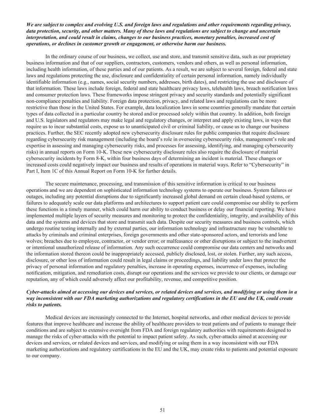 We are subject to complex and evolving U.S. and foreign laws and regulations and other requirements regarding privacy, data protection, security, and other matters. Many of these laws and regulations are subject to change and uncertain interpretation, and could result in claims, changes to our business practices, monetary penalties, increased cost of operations, or declines in customer growth or engagement, or otherwise harm our business. In the ordinary course of our business, we collect, use and store, and transmit sensitive data, such as our proprietary business information and that of our suppliers, contractors, customers, vendors and others, as well as personal information, including health information, of these parties and of our patients. As a result, we are subject to several foreign, federal and state laws and regulations protecting the use, disclosure and confidentiality of certain personal information, namely individually identifiable information (e.g., names, social security numbers, addresses, birth dates), and restricting the use and disclosure of that information. These laws include foreign, federal and state healthcare privacy laws, telehealth laws, breach notification laws and consumer protection laws. These frameworks impose stringent privacy and security standards and potentially significant non-compliance penalties and liability. Foreign data protection, privacy, and related laws and regulations can be more restrictive than those in the United States. For example, data localization laws in some countries generally mandate that certain types of data collected in a particular country be stored and/or processed solely within that country. In addition, both foreign and U.S. legislators and regulators may make legal and regulatory changes, or interpret and apply existing laws, in ways that require us to incur substantial costs, expose us to unanticipated civil or criminal liability, or cause us to change our business practices. Further, the SEC recently adopted new cybersecurity disclosure rules for public companies that require disclosure regarding cybersecurity risk management (including the board’s role in overseeing cybersecurity risks, management’s role and expertise in assessing and managing cybersecurity risks, and processes for assessing, identifying, and managing cybersecurity risks) in annual reports on Form 10-K. These new cybersecurity disclosure rules also require the disclosure of material cybersecurity incidents by Form 8-K, within four business days of determining an incident is material. These changes or increased costs could negatively impact our business and results of operations in material ways. Refer to “Cybersecurity” in Part I, Item 1C of this Annual Report on Form 10-K for further details. The secure maintenance, processing, and transmission of this sensitive information is critical to our business operations and we are dependent on sophisticated information technology systems to operate our business. System failures or outages, including any potential disruptions due to significantly increased global demand on certain cloud-based systems, or failures to adequately scale our data platforms and architectures to support patient care could compromise our ability to perform these functions in a timely manner, which could harm our ability to conduct business or delay our financial reporting. We have implemented multiple layers of security measures and monitoring to protect the confidentiality, integrity, and availability of this data and the systems and devices that store and transmit such data. Despite our security measures and business controls, which undergo routine testing internally and by external parties, our information technology and infrastructure may be vulnerable to attacks by criminals and criminal enterprises, foreign governments and other state-sponsored actors, and terrorists and lone wolves; breaches due to employee, contractor, or vendor error; or malfeasance or other disruptions or subject to the inadvertent or intentional unauthorized release of information. Any such occurrence could compromise our data centers and networks and the information stored thereon could be inappropriately accessed, publicly disclosed, lost, or stolen. Further, any such access, disclosure, or other loss of information could result in legal claims or proceedings, and liability under laws that protect the privacy of personal information and regulatory penalties, increase in operating expenses, incurrence of expenses, including notification, mitigation, and remediation costs, disrupt our operations and the services we provide to our clients, or damage our reputation, any of which could adversely affect our profitability, revenue, and competitive position. Cyber-attacks aimed at accessing our devices and services, or related devices and services, and modifying or using them in a way inconsistent with our FDA marketing authorizations and regulatory certifications in the EU and the UK, could create risks to patients. Medical devices are increasingly connected to the Internet, hospital networks, and other medical devices to provide features that improve healthcare and increase the ability of healthcare providers to treat patients and of patients to manage their conditions and are subject to extensive oversight from FDA and foreign regulatory authorities with requirements designed to manage the risks of cyber-attacks with the potential to impact patient safety. As such, cyber-attacks aimed at accessing our devices and services, or related devices and services, and modifying or using them in a way inconsistent with our FDA marketing authorizations and regulatory certifications in the EU and the UK, may create risks to patients and potential exposure to our company. 51
