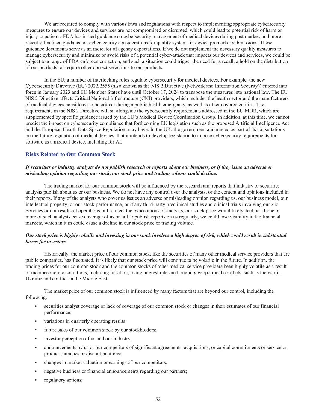 We are required to comply with various laws and regulations with respect to implementing appropriate cybersecurity measures to ensure our devices and services are not compromised or disrupted, which could lead to potential risk of harm or injury to patients. FDA has issued guidance on cybersecurity management of medical devices during post market, and more recently finalized guidance on cybersecurity considerations for quality systems in device premarket submissions. These guidance documents serve as an indicator of agency expectations. If we do not implement the necessary quality measures to manage cybersecurity and minimize or avoid risks of a potential cyber-attack that impacts our devices and services, we could be subject to a range of FDA enforcement action, and such a situation could trigger the need for a recall, a hold on the distribution of our products, or require other corrective actions to our products. In the EU, a number of interlocking rules regulate cybersecurity for medical devices. For example, the new Cybersecurity Directive (EU) 2022/2555 (also known as the NIS 2 Directive (Network and Information Security)) entered into force in January 2023 and EU Member States have until October 17, 2024 to transpose the measures into national law. The EU NIS 2 Directive affects Critical National Infrastructure (CNI) providers, which includes the health sector and the manufacturers of medical devices considered to be critical during a public health emergency, as well as other covered entities. The requirements in the NIS 2 Directive will sit alongside the cybersecurity requirements addressed in the EU MDR, which are supplemented by specific guidance issued by the EU’s Medical Device Coordination Group. In addition, at this time, we cannot predict the impact on cybersecurity compliance that forthcoming EU legislation such as the proposed Artificial Intelligence Act and the European Health Data Space Regulation, may have. In the UK, the government announced as part of its consultations on the future regulation of medical devices, that it intends to develop legislation to impose cybersecurity requirements for software as a medical device, including for AI. Risks Related to Our Common Stock If securities or industry analysts do not publish research or reports about our business, or if they issue an adverse or misleading opinion regarding our stock, our stock price and trading volume could decline. The trading market for our common stock will be influenced by the research and reports that industry or securities analysts publish about us or our business. We do not have any control over the analysts, or the content and opinions included in their reports. If any of the analysts who cover us issues an adverse or misleading opinion regarding us, our business model, our intellectual property, or our stock performance, or if any third-party preclinical studies and clinical trials involving our Zio Services or our results of operations fail to meet the expectations of analysts, our stock price would likely decline. If one or more of such analysts cease coverage of us or fail to publish reports on us regularly, we could lose visibility in the financial markets, which in turn could cause a decline in our stock price or trading volume. Our stock price is highly volatile and investing in our stock involves a high degree of risk, which could result in substantial losses for investors. Historically, the market price of our common stock, like the securities of many other medical service providers that are public companies, has fluctuated. It is likely that our stock price will continue to be volatile in the future. In addition, the trading prices for our common stock and the common stocks of other medical service providers been highly volatile as a result of macroeconomic conditions, including inflation, rising interest rates and ongoing geopolitical conflicts, such as the war in Ukraine and conflict in the Middle East. The market price of our common stock is influenced by many factors that are beyond our control, including the following: • securities analyst coverage or lack of coverage of our common stock or changes in their estimates of our financial performance; • variations in quarterly operating results; • future sales of our common stock by our stockholders; • investor perception of us and our industry; • announcements by us or our competitors of significant agreements, acquisitions, or capital commitments or service or product launches or discontinuations; • changes in market valuation or earnings of our competitors; • negative business or financial announcements regarding our partners; • regulatory actions; 52