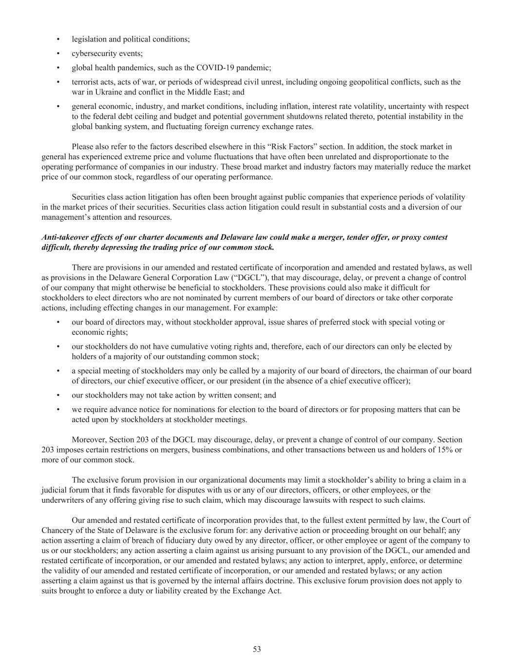 • legislation and political conditions; • cybersecurity events; • global health pandemics, such as the COVID-19 pandemic; • terrorist acts, acts of war, or periods of widespread civil unrest, including ongoing geopolitical conflicts, such as the war in Ukraine and conflict in the Middle East; and • general economic, industry, and market conditions, including inflation, interest rate volatility, uncertainty with respect to the federal debt ceiling and budget and potential government shutdowns related thereto, potential instability in the global banking system, and fluctuating foreign currency exchange rates. Please also refer to the factors described elsewhere in this “Risk Factors” section. In addition, the stock market in general has experienced extreme price and volume fluctuations that have often been unrelated and disproportionate to the operating performance of companies in our industry. These broad market and industry factors may materially reduce the market price of our common stock, regardless of our operating performance. Securities class action litigation has often been brought against public companies that experience periods of volatility in the market prices of their securities. Securities class action litigation could result in substantial costs and a diversion of our management’s attention and resources. Anti-takeover effects of our charter documents and Delaware law could make a merger, tender offer, or proxy contest difficult, thereby depressing the trading price of our common stock. There are provisions in our amended and restated certificate of incorporation and amended and restated bylaws, as well as provisions in the Delaware General Corporation Law (“DGCL”), that may discourage, delay, or prevent a change of control of our company that might otherwise be beneficial to stockholders. These provisions could also make it difficult for stockholders to elect directors who are not nominated by current members of our board of directors or take other corporate actions, including effecting changes in our management. For example: • our board of directors may, without stockholder approval, issue shares of preferred stock with special voting or economic rights; • our stockholders do not have cumulative voting rights and, therefore, each of our directors can only be elected by holders of a majority of our outstanding common stock; • a special meeting of stockholders may only be called by a majority of our board of directors, the chairman of our board of directors, our chief executive officer, or our president (in the absence of a chief executive officer); • our stockholders may not take action by written consent; and • we require advance notice for nominations for election to the board of directors or for proposing matters that can be acted upon by stockholders at stockholder meetings. Moreover, Section 203 of the DGCL may discourage, delay, or prevent a change of control of our company. Section 203 imposes certain restrictions on mergers, business combinations, and other transactions between us and holders of 15% or more of our common stock. The exclusive forum provision in our organizational documents may limit a stockholder’s ability to bring a claim in a judicial forum that it finds favorable for disputes with us or any of our directors, officers, or other employees, or the underwriters of any offering giving rise to such claim, which may discourage lawsuits with respect to such claims. Our amended and restated certificate of incorporation provides that, to the fullest extent permitted by law, the Court of Chancery of the State of Delaware is the exclusive forum for: any derivative action or proceeding brought on our behalf; any action asserting a claim of breach of fiduciary duty owed by any director, officer, or other employee or agent of the company to us or our stockholders; any action asserting a claim against us arising pursuant to any provision of the DGCL, our amended and restated certificate of incorporation, or our amended and restated bylaws; any action to interpret, apply, enforce, or determine the validity of our amended and restated certificate of incorporation, or our amended and restated bylaws; or any action asserting a claim against us that is governed by the internal affairs doctrine. This exclusive forum provision does not apply to suits brought to enforce a duty or liability created by the Exchange Act. 53