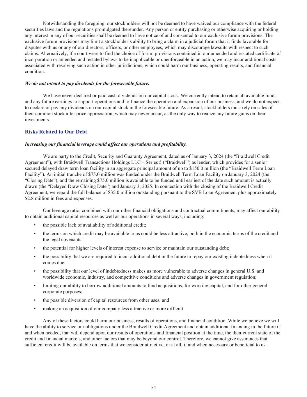 Notwithstanding the foregoing, our stockholders will not be deemed to have waived our compliance with the federal securities laws and the regulations promulgated thereunder. Any person or entity purchasing or otherwise acquiring or holding any interest in any of our securities shall be deemed to have notice of and consented to our exclusive forum provisions. The exclusive forum provisions may limit a stockholder’s ability to bring a claim in a judicial forum that it finds favorable for disputes with us or any of our directors, officers, or other employees, which may discourage lawsuits with respect to such claims. Alternatively, if a court were to find the choice of forum provisions contained in our amended and restated certificate of incorporation or amended and restated bylaws to be inapplicable or unenforceable in an action, we may incur additional costs associated with resolving such action in other jurisdictions, which could harm our business, operating results, and financial condition. We do not intend to pay dividends for the foreseeable future. We have never declared or paid cash dividends on our capital stock. We currently intend to retain all available funds and any future earnings to support operations and to finance the operation and expansion of our business, and we do not expect to declare or pay any dividends on our capital stock in the foreseeable future. As a result, stockholders must rely on sales of their common stock after price appreciation, which may never occur, as the only way to realize any future gains on their investments. Risks Related to Our Debt Increasing our financial leverage could affect our operations and profitability. We are party to the Credit, Security and Guaranty Agreement, dated as of January 3, 2024 (the “Braidwell Credit Agreement”), with Braidwell Transactions Holdings LLC – Series 5 (“Braidwell”) as lender, which provides for a senior secured delayed draw term loan facility in an aggregate principal amount of up to $150.0 million (the “Braidwell Term Loan Facility”). An initial tranche of $75.0 million was funded under the Braidwell Term Loan Facility on January 3, 2024 (the “Closing Date”), and the remaining $75.0 million is available to be funded until earliest of the date such amount is actually drawn (the “Delayed Draw Closing Date”) and January 3, 2025. In connection with the closing of the Braidwell Credit Agreement, we repaid the full balance of $35.0 million outstanding pursuant to the SVB Loan Agreement plus approximately $2.8 million in fees and expenses. Our leverage ratio, combined with our other financial obligations and contractual commitments, may affect our ability to obtain additional capital resources as well as our operations in several ways, including: • the possible lack of availability of additional credit; • the terms on which credit may be available to us could be less attractive, both in the economic terms of the credit and the legal covenants; • the potential for higher levels of interest expense to service or maintain our outstanding debt; • the possibility that we are required to incur additional debt in the future to repay our existing indebtedness when it comes due; • the possibility that our level of indebtedness makes us more vulnerable to adverse changes in general U.S. and worldwide economic, industry, and competitive conditions and adverse changes in government regulation; • limiting our ability to borrow additional amounts to fund acquisitions, for working capital, and for other general corporate purposes; • the possible diversion of capital resources from other uses; and • making an acquisition of our company less attractive or more difficult. Any of these factors could harm our business, results of operations, and financial condition. While we believe we will have the ability to service our obligations under the Braidwell Credit Agreement and obtain additional financing in the future if and when needed, that will depend upon our results of operations and financial position at the time, the then-current state of the credit and financial markets, and other factors that may be beyond our control. Therefore, we cannot give assurances that sufficient credit will be available on terms that we consider attractive, or at all, if and when necessary or beneficial to us. 54
