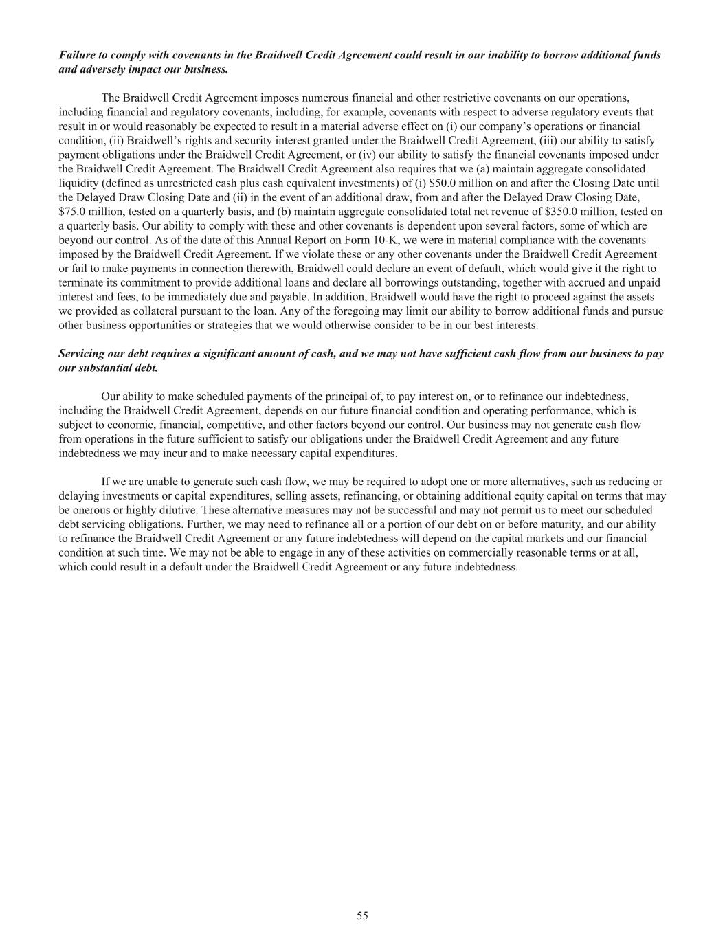 Failure to comply with covenants in the Braidwell Credit Agreement could result in our inability to borrow additional funds and adversely impact our business. The Braidwell Credit Agreement imposes numerous financial and other restrictive covenants on our operations, including financial and regulatory covenants, including, for example, covenants with respect to adverse regulatory events that result in or would reasonably be expected to result in a material adverse effect on (i) our company’s operations or financial condition, (ii) Braidwell’s rights and security interest granted under the Braidwell Credit Agreement, (iii) our ability to satisfy payment obligations under the Braidwell Credit Agreement, or (iv) our ability to satisfy the financial covenants imposed under the Braidwell Credit Agreement. The Braidwell Credit Agreement also requires that we (a) maintain aggregate consolidated liquidity (defined as unrestricted cash plus cash equivalent investments) of (i) $50.0 million on and after the Closing Date until the Delayed Draw Closing Date and (ii) in the event of an additional draw, from and after the Delayed Draw Closing Date, $75.0 million, tested on a quarterly basis, and (b) maintain aggregate consolidated total net revenue of $350.0 million, tested on a quarterly basis. Our ability to comply with these and other covenants is dependent upon several factors, some of which are beyond our control. As of the date of this Annual Report on Form 10-K, we were in material compliance with the covenants imposed by the Braidwell Credit Agreement. If we violate these or any other covenants under the Braidwell Credit Agreement or fail to make payments in connection therewith, Braidwell could declare an event of default, which would give it the right to terminate its commitment to provide additional loans and declare all borrowings outstanding, together with accrued and unpaid interest and fees, to be immediately due and payable. In addition, Braidwell would have the right to proceed against the assets we provided as collateral pursuant to the loan. Any of the foregoing may limit our ability to borrow additional funds and pursue other business opportunities or strategies that we would otherwise consider to be in our best interests. Servicing our debt requires a significant amount of cash, and we may not have sufficient cash flow from our business to pay our substantial debt. Our ability to make scheduled payments of the principal of, to pay interest on, or to refinance our indebtedness, including the Braidwell Credit Agreement, depends on our future financial condition and operating performance, which is subject to economic, financial, competitive, and other factors beyond our control. Our business may not generate cash flow from operations in the future sufficient to satisfy our obligations under the Braidwell Credit Agreement and any future indebtedness we may incur and to make necessary capital expenditures. If we are unable to generate such cash flow, we may be required to adopt one or more alternatives, such as reducing or delaying investments or capital expenditures, selling assets, refinancing, or obtaining additional equity capital on terms that may be onerous or highly dilutive. These alternative measures may not be successful and may not permit us to meet our scheduled debt servicing obligations. Further, we may need to refinance all or a portion of our debt on or before maturity, and our ability to refinance the Braidwell Credit Agreement or any future indebtedness will depend on the capital markets and our financial condition at such time. We may not be able to engage in any of these activities on commercially reasonable terms or at all, which could result in a default under the Braidwell Credit Agreement or any future indebtedness. 55
