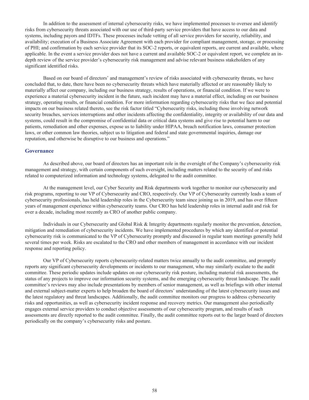 In addition to the assessment of internal cybersecurity risks, we have implemented processes to oversee and identify risks from cybersecurity threats associated with our use of third-party service providers that have access to our data and systems, including payors and IDTFs. These processes include vetting of all service providers for security, reliability, and availability; execution of a Business Associate Agreement with each provider for compliant management, storage, or processing of PHI; and confirmation by each service provider that its SOC-2 reports, or equivalent reports, are current and available, where applicable. In the event a service provider does not have a current and available SOC-2 or equivalent report, we complete an in- depth review of the service provider’s cybersecurity risk management and advise relevant business stakeholders of any significant identified risks. Based on our board of directors’ and management’s review of risks associated with cybersecurity threats, we have concluded that, to date, there have been no cybersecurity threats which have materially affected or are reasonably likely to materially affect our company, including our business strategy, results of operations, or financial condition. If we were to experience a material cybersecurity incident in the future, such incident may have a material effect, including on our business strategy, operating results, or financial condition. For more information regarding cybersecurity risks that we face and potential impacts on our business related thereto, see the risk factor titled “Cybersecurity risks, including those involving network security breaches, services interruptions and other incidents affecting the confidentiality, integrity or availability of our data and systems, could result in the compromise of confidential data or critical data systems and give rise to potential harm to our patients, remediation and other expenses, expose us to liability under HIPAA, breach notification laws, consumer protection laws, or other common law theories, subject us to litigation and federal and state governmental inquiries, damage our reputation, and otherwise be disruptive to our business and operations.” Governance As described above, our board of directors has an important role in the oversight of the Company’s cybersecurity risk management and strategy, with certain components of such oversight, including matters related to the security of and risks related to computerized information and technology systems, delegated to the audit committee. At the management level, our Cyber Security and Risk departments work together to monitor our cybersecurity and risk programs, reporting to our VP of Cybersecurity and CRO, respectively. Our VP of Cybersecurity currently leads a team of cybersecurity professionals, has held leadership roles in the Cybersecurity team since joining us in 2019, and has over fifteen years of management experience within cybersecurity teams. Our CRO has held leadership roles in internal audit and risk for over a decade, including most recently as CRO of another public company. Individuals in our Cybersecurity and Global Risk & Integrity departments regularly monitor the prevention, detection, mitigation and remediation of cybersecurity incidents. We have implemented procedures by which any identified or potential cybersecurity risk is communicated to the VP of Cybersecurity promptly and discussed in regular team meetings generally held several times per week. Risks are escalated to the CRO and other members of management in accordance with our incident response and reporting policy. Our VP of Cybersecurity reports cybersecurity-related matters twice annually to the audit committee, and promptly reports any significant cybersecurity developments or incidents to our management, who may similarly escalate to the audit committee. These periodic updates include updates on our cybersecurity risk posture, including material risk assessments, the status of any projects to improve our information security systems, and the emerging cybersecurity threat landscape. The audit committee’s reviews may also include presentations by members of senior management, as well as briefings with other internal and external subject-matter experts to help broaden the board of directors’ understanding of the latest cybersecurity issues and the latest regulatory and threat landscapes. Additionally, the audit committee monitors our progress to address cybersecurity risks and opportunities, as well as cybersecurity incident response and recovery metrics. Our management also periodically engages external service providers to conduct objective assessments of our cybersecurity program, and results of such assessments are directly reported to the audit committee. Finally, the audit committee reports out to the larger board of directors periodically on the company’s cybersecurity risks and posture. 58
