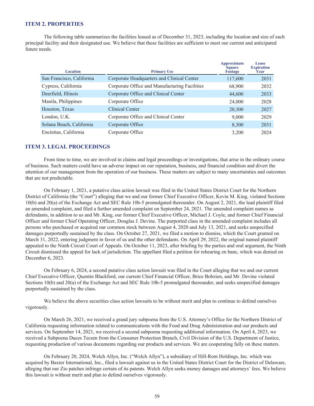 ITEM 2. PROPERTIES The following table summarizes the facilities leased as of December 31, 2023, including the location and size of each principal facility and their designated use. We believe that these facilities are sufficient to meet our current and anticipated future needs. Location Primary Use Approximate Square Footage Lease Expiration Year San Francisco, California Corporate Headquarters and Clinical Center 117,600 2031 Cypress, California Corporate Office and Manufacturing Facilities 68,900 2032 Deerfield, Illinois Corporate Office and Clinical Center 44,600 2033 Manila, Philippines Corporate Office 24,000 2028 Houston, Texas Clinical Center 20,300 2027 London, U.K. Corporate Office and Clinical Center 9,000 2029 Solana Beach, California Corporate Office 8,300 2031 Encinitas, California Corporate Office 3,200 2024 ITEM 3. LEGAL PROCEEDINGS From time to time, we are involved in claims and legal proceedings or investigations, that arise in the ordinary course of business. Such matters could have an adverse impact on our reputation, business, and financial condition and divert the attention of our management from the operation of our business. These matters are subject to many uncertainties and outcomes that are not predictable. On February 1, 2021, a putative class action lawsuit was filed in the United States District Court for the Northern District of California (the “Court”) alleging that we and our former Chief Executive Officer, Kevin M. King, violated Sections 10(b) and 20(a) of the Exchange Act and SEC Rule 10b-5 promulgated thereunder. On August 2, 2021, the lead plaintiff filed an amended complaint, and filed a further amended complaint on September 24, 2021. The amended complaint names as defendants, in addition to us and Mr. King, our former Chief Executive Officer, Michael J. Coyle, and former Chief Financial Officer and former Chief Operating Officer, Douglas J. Devine. The purported class in the amended complaint includes all persons who purchased or acquired our common stock between August 4, 2020 and July 13, 2021, and seeks unspecified damages purportedly sustained by the class. On October 27, 2021, we filed a motion to dismiss, which the Court granted on March 31, 2022, entering judgment in favor of us and the other defendants. On April 29, 2022, the original named plaintiff appealed to the Ninth Circuit Court of Appeals. On October 11, 2023, after briefing by the parties and oral argument, the Ninth Circuit dismissed the appeal for lack of jurisdiction. The appellant filed a petition for rehearing en banc, which was denied on December 6, 2023. On February 6, 2024, a second putative class action lawsuit was filed in the Court alleging that we and our current Chief Executive Officer, Quentin Blackford, our current Chief Financial Officer, Brice Bobzien, and Mr. Devine violated Sections 10(b) and 20(a) of the Exchange Act and SEC Rule 10b-5 promulgated thereunder, and seeks unspecified damages purportedly sustained by the class. We believe the above securities class action lawsuits to be without merit and plan to continue to defend ourselves vigorously. On March 26, 2021, we received a grand jury subpoena from the U.S. Attorney’s Office for the Northern District of California requesting information related to communications with the Food and Drug Administration and our products and services. On September 14, 2021, we received a second subpoena requesting additional information. On April 4, 2023, we received a Subpoena Duces Tecum from the Consumer Protection Branch, Civil Division of the U.S. Department of Justice, requesting production of various documents regarding our products and services. We are cooperating fully on these matters. On February 20, 2024, Welch Allyn, Inc. (“Welch Allyn”), a subsidiary of Hill-Rom Holdings, Inc. which was acquired by Baxter International, Inc., filed a lawsuit against us in the United States District Court for the District of Delaware, alleging that our Zio patches infringe certain of its patents. Welch Allyn seeks money damages and attorneys’ fees. We believe this lawsuit is without merit and plan to defend ourselves vigorously. 59