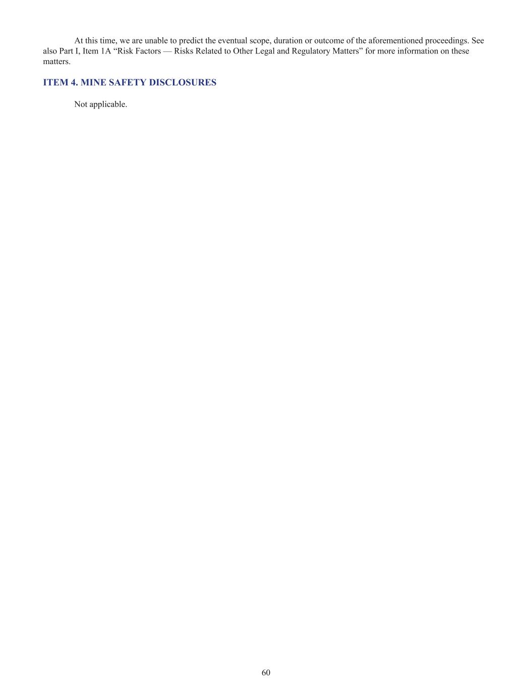 At this time, we are unable to predict the eventual scope, duration or outcome of the aforementioned proceedings. See also Part I, Item 1A “Risk Factors — Risks Related to Other Legal and Regulatory Matters” for more information on these matters. ITEM 4. MINE SAFETY DISCLOSURES Not applicable. 60