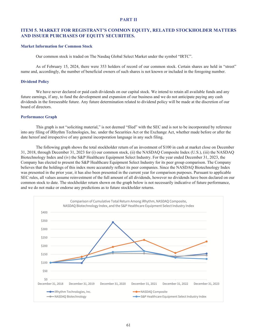 PART II ITEM 5. MARKET FOR REGISTRANT’S COMMON EQUITY, RELATED STOCKHOLDER MATTERS AND ISSUER PURCHASES OF EQUITY SECURITIES. Market Information for Common Stock Our common stock is traded on The Nasdaq Global Select Market under the symbol “IRTC”. As of February 15, 2024, there were 353 holders of record of our common stock. Certain shares are held in “street” name and, accordingly, the number of beneficial owners of such shares is not known or included in the foregoing number. Dividend Policy We have never declared or paid cash dividends on our capital stock. We intend to retain all available funds and any future earnings, if any, to fund the development and expansion of our business and we do not anticipate paying any cash dividends in the foreseeable future. Any future determination related to dividend policy will be made at the discretion of our board of directors. Performance Graph This graph is not “soliciting material,” is not deemed “filed” with the SEC and is not to be incorporated by reference into any filing of iRhythm Technologies, Inc. under the Securities Act or the Exchange Act, whether made before or after the date hereof and irrespective of any general incorporation language in any such filing. The following graph shows the total stockholder return of an investment of $100 in cash at market close on December 31, 2018, through December 31, 2023 for (i) our common stock, (ii) the NASDAQ Composite Index (U.S.), (iii) the NASDAQ Biotechnology Index and (iv) the S&P Healthcare Equipment Select Industry. For the year ended December 31, 2023, the Company has elected to present the S&P Healthcare Equipment Select Industry for its peer group comparison. The Company believes that the holdings of this index more accurately reflect its peer companies. Since the NASDAQ Biotechnology Index was presented in the prior year, it has also been presented in the current year for comparison purposes. Pursuant to applicable SEC rules, all values assume reinvestment of the full amount of all dividends, however no dividends have been declared on our common stock to date. The stockholder return shown on the graph below is not necessarily indicative of future performance, and we do not make or endorse any predictions as to future stockholder returns. 61