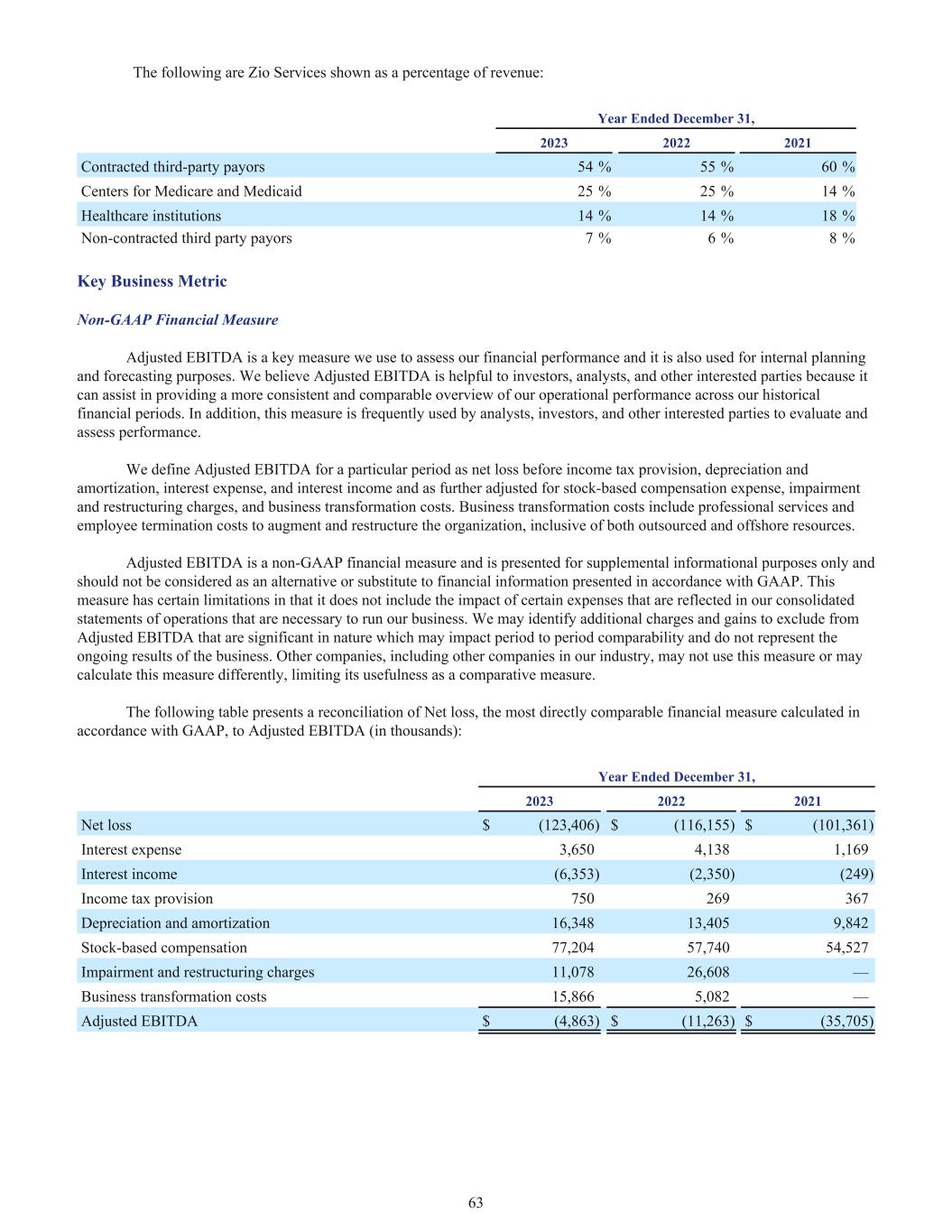 The following are Zio Services shown as a percentage of revenue: Year Ended December 31, 2023 2022 2021 Contracted third-party payors 54 % 55 % 60 % Centers for Medicare and Medicaid 25 % 25 % 14 % Healthcare institutions 14 % 14 % 18 % Non-contracted third party payors 7 % 6 % 8 % Key Business Metric Non-GAAP Financial Measure Adjusted EBITDA is a key measure we use to assess our financial performance and it is also used for internal planning and forecasting purposes. We believe Adjusted EBITDA is helpful to investors, analysts, and other interested parties because it can assist in providing a more consistent and comparable overview of our operational performance across our historical financial periods. In addition, this measure is frequently used by analysts, investors, and other interested parties to evaluate and assess performance. We define Adjusted EBITDA for a particular period as net loss before income tax provision, depreciation and amortization, interest expense, and interest income and as further adjusted for stock-based compensation expense, impairment and restructuring charges, and business transformation costs. Business transformation costs include professional services and employee termination costs to augment and restructure the organization, inclusive of both outsourced and offshore resources. Adjusted EBITDA is a non-GAAP financial measure and is presented for supplemental informational purposes only and should not be considered as an alternative or substitute to financial information presented in accordance with GAAP. This measure has certain limitations in that it does not include the impact of certain expenses that are reflected in our consolidated statements of operations that are necessary to run our business. We may identify additional charges and gains to exclude from Adjusted EBITDA that are significant in nature which may impact period to period comparability and do not represent the ongoing results of the business. Other companies, including other companies in our industry, may not use this measure or may calculate this measure differently, limiting its usefulness as a comparative measure. The following table presents a reconciliation of Net loss, the most directly comparable financial measure calculated in accordance with GAAP, to Adjusted EBITDA (in thousands): Year Ended December 31, 2023 2022 2021 Net loss $ (123,406) $ (116,155) $ (101,361) Interest expense 3,650 4,138 1,169 Interest income (6,353) (2,350) (249) Income tax provision 750 269 367 Depreciation and amortization 16,348 13,405 9,842 Stock-based compensation 77,204 57,740 54,527 Impairment and restructuring charges 11,078 26,608 — Business transformation costs 15,866 5,082 — Adjusted EBITDA $ (4,863) $ (11,263) $ (35,705) 63