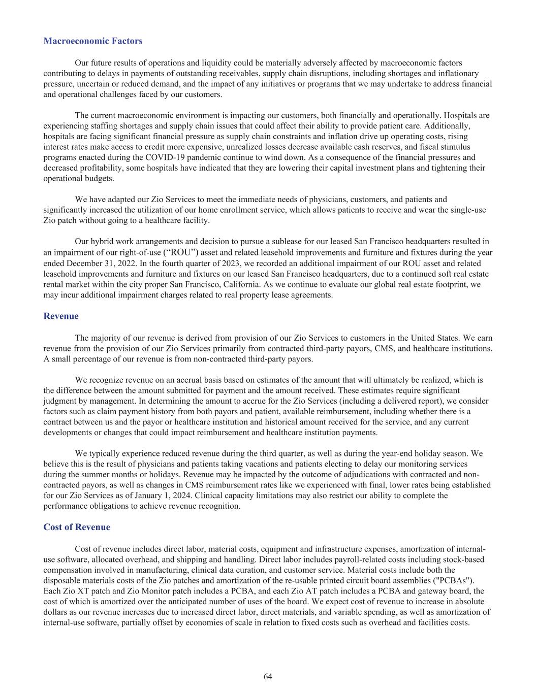 Macroeconomic Factors Our future results of operations and liquidity could be materially adversely affected by macroeconomic factors contributing to delays in payments of outstanding receivables, supply chain disruptions, including shortages and inflationary pressure, uncertain or reduced demand, and the impact of any initiatives or programs that we may undertake to address financial and operational challenges faced by our customers. The current macroeconomic environment is impacting our customers, both financially and operationally. Hospitals are experiencing staffing shortages and supply chain issues that could affect their ability to provide patient care. Additionally, hospitals are facing significant financial pressure as supply chain constraints and inflation drive up operating costs, rising interest rates make access to credit more expensive, unrealized losses decrease available cash reserves, and fiscal stimulus programs enacted during the COVID-19 pandemic continue to wind down. As a consequence of the financial pressures and decreased profitability, some hospitals have indicated that they are lowering their capital investment plans and tightening their operational budgets. We have adapted our Zio Services to meet the immediate needs of physicians, customers, and patients and significantly increased the utilization of our home enrollment service, which allows patients to receive and wear the single-use Zio patch without going to a healthcare facility. Our hybrid work arrangements and decision to pursue a sublease for our leased San Francisco headquarters resulted in an impairment of our right-of-use (“ROU”) asset and related leasehold improvements and furniture and fixtures during the year ended December 31, 2022. In the fourth quarter of 2023, we recorded an additional impairment of our ROU asset and related leasehold improvements and furniture and fixtures on our leased San Francisco headquarters, due to a continued soft real estate rental market within the city proper San Francisco, California. As we continue to evaluate our global real estate footprint, we may incur additional impairment charges related to real property lease agreements. Revenue The majority of our revenue is derived from provision of our Zio Services to customers in the United States. We earn revenue from the provision of our Zio Services primarily from contracted third-party payors, CMS, and healthcare institutions. A small percentage of our revenue is from non-contracted third-party payors. We recognize revenue on an accrual basis based on estimates of the amount that will ultimately be realized, which is the difference between the amount submitted for payment and the amount received. These estimates require significant judgment by management. In determining the amount to accrue for the Zio Services (including a delivered report), we consider factors such as claim payment history from both payors and patient, available reimbursement, including whether there is a contract between us and the payor or healthcare institution and historical amount received for the service, and any current developments or changes that could impact reimbursement and healthcare institution payments. We typically experience reduced revenue during the third quarter, as well as during the year-end holiday season. We believe this is the result of physicians and patients taking vacations and patients electing to delay our monitoring services during the summer months or holidays. Revenue may be impacted by the outcome of adjudications with contracted and non- contracted payors, as well as changes in CMS reimbursement rates like we experienced with final, lower rates being established for our Zio Services as of January 1, 2024. Clinical capacity limitations may also restrict our ability to complete the performance obligations to achieve revenue recognition. Cost of Revenue Cost of revenue includes direct labor, material costs, equipment and infrastructure expenses, amortization of internal- use software, allocated overhead, and shipping and handling. Direct labor includes payroll-related costs including stock-based compensation involved in manufacturing, clinical data curation, and customer service. Material costs include both the disposable materials costs of the Zio patches and amortization of the re-usable printed circuit board assemblies ("PCBAs"). Each Zio XT patch and Zio Monitor patch includes a PCBA, and each Zio AT patch includes a PCBA and gateway board, the cost of which is amortized over the anticipated number of uses of the board. We expect cost of revenue to increase in absolute dollars as our revenue increases due to increased direct labor, direct materials, and variable spending, as well as amortization of internal-use software, partially offset by economies of scale in relation to fixed costs such as overhead and facilities costs. 64