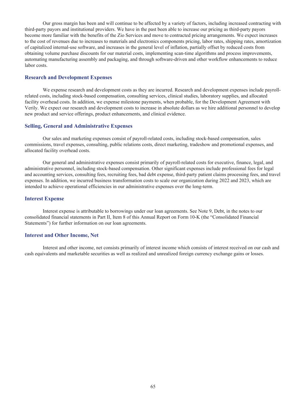 Our gross margin has been and will continue to be affected by a variety of factors, including increased contracting with third-party payors and institutional providers. We have in the past been able to increase our pricing as third-party payors become more familiar with the benefits of the Zio Services and move to contracted pricing arrangements. We expect increases to the cost of revenues due to increases to materials and electronics components pricing, labor rates, shipping rates, amortization of capitalized internal-use software, and increases in the general level of inflation, partially offset by reduced costs from obtaining volume purchase discounts for our material costs, implementing scan-time algorithms and process improvements, automating manufacturing assembly and packaging, and through software-driven and other workflow enhancements to reduce labor costs. Research and Development Expenses We expense research and development costs as they are incurred. Research and development expenses include payroll- related costs, including stock-based compensation, consulting services, clinical studies, laboratory supplies, and allocated facility overhead costs. In addition, we expense milestone payments, when probable, for the Development Agreement with Verily. We expect our research and development costs to increase in absolute dollars as we hire additional personnel to develop new product and service offerings, product enhancements, and clinical evidence. Selling, General and Administrative Expenses Our sales and marketing expenses consist of payroll-related costs, including stock-based compensation, sales commissions, travel expenses, consulting, public relations costs, direct marketing, tradeshow and promotional expenses, and allocated facility overhead costs. Our general and administrative expenses consist primarily of payroll-related costs for executive, finance, legal, and administrative personnel, including stock-based compensation. Other significant expenses include professional fees for legal and accounting services, consulting fees, recruiting fees, bad debt expense, third-party patient claims processing fees, and travel expenses. In addition, we incurred business transformation costs to scale our organization during 2022 and 2023, which are intended to achieve operational efficiencies in our administrative expenses over the long-term. Interest Expense Interest expense is attributable to borrowings under our loan agreements. See Note 9, Debt, in the notes to our consolidated financial statements in Part II, Item 8 of this Annual Report on Form 10-K (the “Consolidated Financial Statements”) for further information on our loan agreements. Interest and Other Income, Net Interest and other income, net consists primarily of interest income which consists of interest received on our cash and cash equivalents and marketable securities as well as realized and unrealized foreign currency exchange gains or losses. 65
