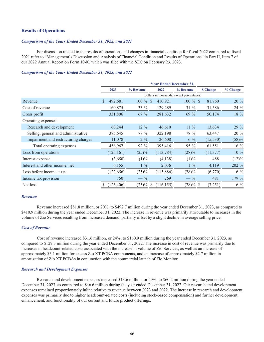 Results of Operations Comparison of the Years Ended December 31, 2022, and 2021 For discussion related to the results of operations and changes in financial condition for fiscal 2022 compared to fiscal 2021 refer to “Management’s Discussion and Analysis of Financial Condition and Results of Operations” in Part II, Item 7 of our 2022 Annual Report on Form 10-K, which was filed with the SEC on February 23, 2023. Comparison of the Years Ended December 31, 2023, and 2022 2023 % Revenue 2022 % Revenue $ Change % Change (dollars in thousands, except percentages) Revenue $ 492,681 100 % $ 410,921 100 % $ 81,760 20 % Cost of revenue 160,875 33 % 129,289 31 % 31,586 24 % Gross profit 331,806 67 % 281,632 69 % 50,174 18 % Operating expenses: Research and development 60,244 12 % 46,610 11 % 13,634 29 % Selling, general and administrative 385,645 78 % 322,198 78 % 63,447 20 % Impairment and restructuring charges 11,078 2 % 26,608 6 % (15,530) (58) % Total operating expenses 456,967 92 % 395,416 95 % 61,551 16 % Loss from operations (125,161) (25) % (113,784) (28) % (11,377) 10 % Interest expense (3,650) (1) % (4,138) (1) % 488 (12) % Interest and other income, net 6,155 1 % 2,036 1 % 4,119 202 % Loss before income taxes (122,656) (25) % (115,886) (28) % (6,770) 6 % Income tax provision 750 — % 269 — % 481 179 % Net loss $ (123,406) (25) % $ (116,155) (28) % $ (7,251) 6 % Year Ended December 31, Revenue Revenue increased $81.8 million, or 20%, to $492.7 million during the year ended December 31, 2023, as compared to $410.9 million during the year ended December 31, 2022. The increase in revenue was primarily attributable to increases in the volume of Zio Services resulting from increased demand, partially offset by a slight decline in average selling price. Cost of Revenue Cost of revenue increased $31.6 million, or 24%, to $160.9 million during the year ended December 31, 2023, as compared to $129.3 million during the year ended December 31, 2022. The increase in cost of revenue was primarily due to increases in headcount-related costs associated with the increase in volume of Zio Services, as well as an increase of approximately $3.1 million for excess Zio XT PCBA components, and an increase of approximately $2.7 million in amortization of Zio XT PCBAs in conjunction with the commercial launch of Zio Monitor. Research and Development Expenses Research and development expenses increased $13.6 million, or 29%, to $60.2 million during the year ended December 31, 2023, as compared to $46.6 million during the year ended December 31, 2022. Our research and development expenses remained proportionately inline relative to revenue between 2023 and 2022. The increase in research and development expenses was primarily due to higher headcount-related costs (including stock-based compensation) and further development, enhancement, and functionality of our current and future product offerings. 66