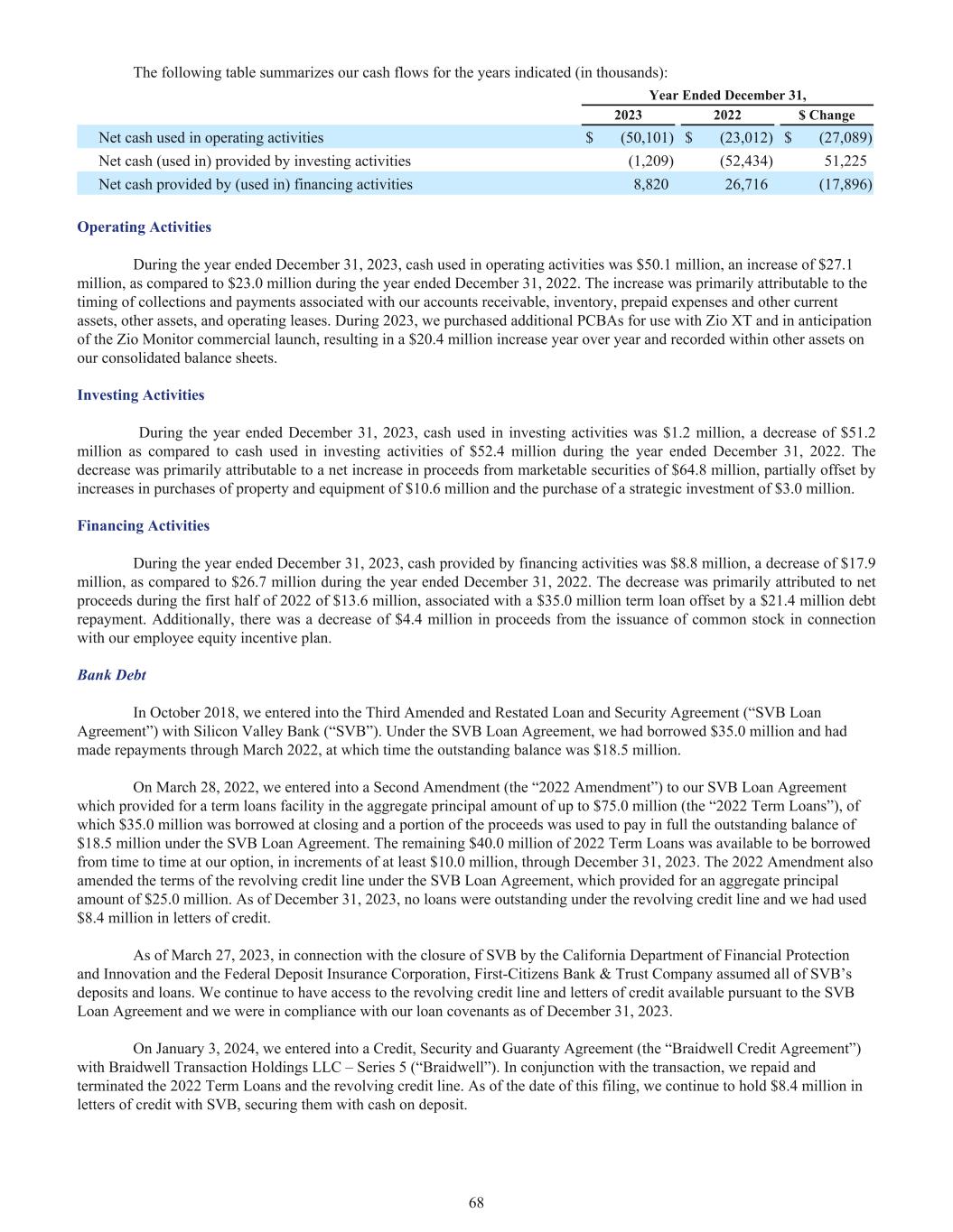 The following table summarizes our cash flows for the years indicated (in thousands): Year Ended December 31, 2023 2022 $ Change Net cash used in operating activities $ (50,101) $ (23,012) $ (27,089) Net cash (used in) provided by investing activities (1,209) (52,434) 51,225 Net cash provided by (used in) financing activities 8,820 26,716 (17,896) Operating Activities During the year ended December 31, 2023, cash used in operating activities was $50.1 million, an increase of $27.1 million, as compared to $23.0 million during the year ended December 31, 2022. The increase was primarily attributable to the timing of collections and payments associated with our accounts receivable, inventory, prepaid expenses and other current assets, other assets, and operating leases. During 2023, we purchased additional PCBAs for use with Zio XT and in anticipation of the Zio Monitor commercial launch, resulting in a $20.4 million increase year over year and recorded within other assets on our consolidated balance sheets. Investing Activities During the year ended December 31, 2023, cash used in investing activities was $1.2 million, a decrease of $51.2 million as compared to cash used in investing activities of $52.4 million during the year ended December 31, 2022. The decrease was primarily attributable to a net increase in proceeds from marketable securities of $64.8 million, partially offset by increases in purchases of property and equipment of $10.6 million and the purchase of a strategic investment of $3.0 million. Financing Activities During the year ended December 31, 2023, cash provided by financing activities was $8.8 million, a decrease of $17.9 million, as compared to $26.7 million during the year ended December 31, 2022. The decrease was primarily attributed to net proceeds during the first half of 2022 of $13.6 million, associated with a $35.0 million term loan offset by a $21.4 million debt repayment. Additionally, there was a decrease of $4.4 million in proceeds from the issuance of common stock in connection with our employee equity incentive plan. Bank Debt In October 2018, we entered into the Third Amended and Restated Loan and Security Agreement (“SVB Loan Agreement”) with Silicon Valley Bank (“SVB”). Under the SVB Loan Agreement, we had borrowed $35.0 million and had made repayments through March 2022, at which time the outstanding balance was $18.5 million. On March 28, 2022, we entered into a Second Amendment (the “2022 Amendment”) to our SVB Loan Agreement which provided for a term loans facility in the aggregate principal amount of up to $75.0 million (the “2022 Term Loans”), of which $35.0 million was borrowed at closing and a portion of the proceeds was used to pay in full the outstanding balance of $18.5 million under the SVB Loan Agreement. The remaining $40.0 million of 2022 Term Loans was available to be borrowed from time to time at our option, in increments of at least $10.0 million, through December 31, 2023. The 2022 Amendment also amended the terms of the revolving credit line under the SVB Loan Agreement, which provided for an aggregate principal amount of $25.0 million. As of December 31, 2023, no loans were outstanding under the revolving credit line and we had used $8.4 million in letters of credit. As of March 27, 2023, in connection with the closure of SVB by the California Department of Financial Protection and Innovation and the Federal Deposit Insurance Corporation, First-Citizens Bank & Trust Company assumed all of SVB’s deposits and loans. We continue to have access to the revolving credit line and letters of credit available pursuant to the SVB Loan Agreement and we were in compliance with our loan covenants as of December 31, 2023. On January 3, 2024, we entered into a Credit, Security and Guaranty Agreement (the “Braidwell Credit Agreement”) with Braidwell Transaction Holdings LLC – Series 5 (“Braidwell”). In conjunction with the transaction, we repaid and terminated the 2022 Term Loans and the revolving credit line. As of the date of this filing, we continue to hold $8.4 million in letters of credit with SVB, securing them with cash on deposit. 68
