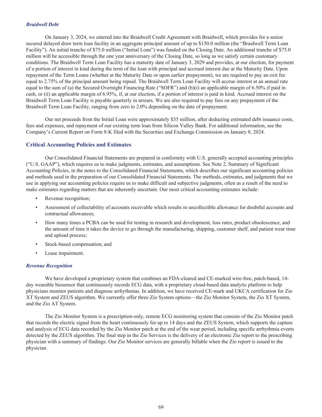 Braidwell Debt On January 3, 2024, we entered into the Braidwell Credit Agreement with Braidwell, which provides for a senior secured delayed draw term loan facility in an aggregate principal amount of up to $150.0 million (the “Braidwell Term Loan Facility”). An initial tranche of $75.0 million (“Initial Loan”) was funded on the Closing Date. An additional tranche of $75.0 million will be accessible through the one year anniversary of the Closing Date, so long as we satisfy certain customary conditions. The Braidwell Term Loan Facility has a maturity date of January 3, 2029 and provides, at our election, for payment of a portion of interest in kind during the term of the loan with principal and accrued interest due at the Maturity Date. Upon repayment of the Term Loans (whether at the Maturity Date or upon earlier prepayment), we are required to pay an exit fee equal to 2.75% of the principal amount being repaid. The Braidwell Term Loan Facility will accrue interest at an annual rate equal to the sum of (a) the Secured Overnight Financing Rate (“SOFR”) and (b)(i) an applicable margin of 6.50% if paid in cash, or (ii) an applicable margin of 6.95%, if, at our election, if a portion of interest is paid in kind. Accrued interest on the Braidwell Term Loan Facility is payable quarterly in arrears. We are also required to pay fees on any prepayment of the Braidwell Term Loan Facility, ranging from zero to 2.0% depending on the date of prepayment. Our net proceeds from the Initial Loan were approximately $35 million, after deducting estimated debt issuance costs, fees and expenses, and repayment of our existing term loan from Silicon Valley Bank. For additional information, see the Company’s Current Report on Form 8-K filed with the Securities and Exchange Commission on January 8, 2024. Critical Accounting Policies and Estimates Our Consolidated Financial Statements are prepared in conformity with U.S. generally accepted accounting principles (“U.S. GAAP”), which requires us to make judgments, estimates, and assumptions. See Note 2, Summary of Significant Accounting Policies, in the notes to the Consolidated Financial Statements, which describes our significant accounting policies and methods used in the preparation of our Consolidated Financial Statements. The methods, estimates, and judgments that we use in applying our accounting policies require us to make difficult and subjective judgments, often as a result of the need to make estimates regarding matters that are inherently uncertain. Our most critical accounting estimates include: • Revenue recognition; • Assessment of collectability of accounts receivable which results in uncollectible allowance for doubtful accounts and contractual allowances; • How many times a PCBA can be used for testing in research and development, loss rates, product obsolescence, and the amount of time it takes the device to go through the manufacturing, shipping, customer shelf, and patient wear time and upload process; • Stock-based compensation; and • Lease impairment. Revenue Recognition We have developed a proprietary system that combines an FDA-cleared and CE-marked wire-free, patch-based, 14- day wearable biosensor that continuously records ECG data, with a proprietary cloud-based data analytic platform to help physicians monitor patients and diagnose arrhythmias. In addition, we have received CE-mark and UKCA certification for Zio XT System and ZEUS algorithm. We currently offer three Zio System options—the Zio Monitor System, the Zio XT System, and the Zio AT System. The Zio Monitor System is a prescription-only, remote ECG monitoring system that consists of the Zio Monitor patch that records the electric signal from the heart continuously for up to 14 days and the ZEUS System, which supports the capture and analysis of ECG data recorded by the Zio Monitor patch at the end of the wear period, including specific arrhythmia events detected by the ZEUS algorithm. The final step in the Zio Services is the delivery of an electronic Zio report to the prescribing physician with a summary of findings. Our Zio Monitor services are generally billable when the Zio report is issued to the physician. 69