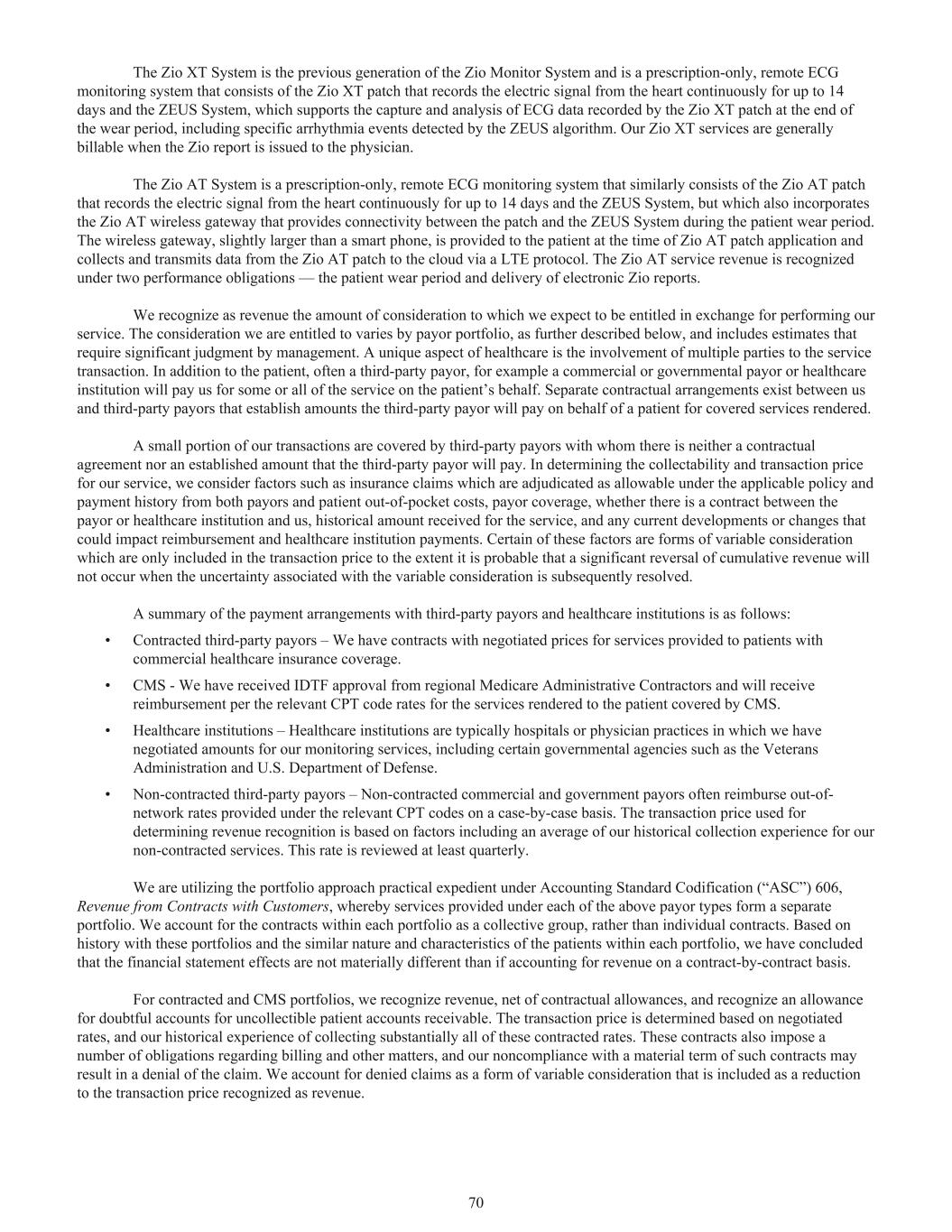 The Zio XT System is the previous generation of the Zio Monitor System and is a prescription-only, remote ECG monitoring system that consists of the Zio XT patch that records the electric signal from the heart continuously for up to 14 days and the ZEUS System, which supports the capture and analysis of ECG data recorded by the Zio XT patch at the end of the wear period, including specific arrhythmia events detected by the ZEUS algorithm. Our Zio XT services are generally billable when the Zio report is issued to the physician. The Zio AT System is a prescription-only, remote ECG monitoring system that similarly consists of the Zio AT patch that records the electric signal from the heart continuously for up to 14 days and the ZEUS System, but which also incorporates the Zio AT wireless gateway that provides connectivity between the patch and the ZEUS System during the patient wear period. The wireless gateway, slightly larger than a smart phone, is provided to the patient at the time of Zio AT patch application and collects and transmits data from the Zio AT patch to the cloud via a LTE protocol. The Zio AT service revenue is recognized under two performance obligations — the patient wear period and delivery of electronic Zio reports. We recognize as revenue the amount of consideration to which we expect to be entitled in exchange for performing our service. The consideration we are entitled to varies by payor portfolio, as further described below, and includes estimates that require significant judgment by management. A unique aspect of healthcare is the involvement of multiple parties to the service transaction. In addition to the patient, often a third-party payor, for example a commercial or governmental payor or healthcare institution will pay us for some or all of the service on the patient’s behalf. Separate contractual arrangements exist between us and third-party payors that establish amounts the third-party payor will pay on behalf of a patient for covered services rendered. A small portion of our transactions are covered by third-party payors with whom there is neither a contractual agreement nor an established amount that the third-party payor will pay. In determining the collectability and transaction price for our service, we consider factors such as insurance claims which are adjudicated as allowable under the applicable policy and payment history from both payors and patient out-of-pocket costs, payor coverage, whether there is a contract between the payor or healthcare institution and us, historical amount received for the service, and any current developments or changes that could impact reimbursement and healthcare institution payments. Certain of these factors are forms of variable consideration which are only included in the transaction price to the extent it is probable that a significant reversal of cumulative revenue will not occur when the uncertainty associated with the variable consideration is subsequently resolved. A summary of the payment arrangements with third-party payors and healthcare institutions is as follows: • Contracted third-party payors – We have contracts with negotiated prices for services provided to patients with commercial healthcare insurance coverage. • CMS - We have received IDTF approval from regional Medicare Administrative Contractors and will receive reimbursement per the relevant CPT code rates for the services rendered to the patient covered by CMS. • Healthcare institutions – Healthcare institutions are typically hospitals or physician practices in which we have negotiated amounts for our monitoring services, including certain governmental agencies such as the Veterans Administration and U.S. Department of Defense. • Non-contracted third-party payors – Non-contracted commercial and government payors often reimburse out-of- network rates provided under the relevant CPT codes on a case-by-case basis. The transaction price used for determining revenue recognition is based on factors including an average of our historical collection experience for our non-contracted services. This rate is reviewed at least quarterly. We are utilizing the portfolio approach practical expedient under Accounting Standard Codification (“ASC”) 606, Revenue from Contracts with Customers, whereby services provided under each of the above payor types form a separate portfolio. We account for the contracts within each portfolio as a collective group, rather than individual contracts. Based on history with these portfolios and the similar nature and characteristics of the patients within each portfolio, we have concluded that the financial statement effects are not materially different than if accounting for revenue on a contract-by-contract basis. For contracted and CMS portfolios, we recognize revenue, net of contractual allowances, and recognize an allowance for doubtful accounts for uncollectible patient accounts receivable. The transaction price is determined based on negotiated rates, and our historical experience of collecting substantially all of these contracted rates. These contracts also impose a number of obligations regarding billing and other matters, and our noncompliance with a material term of such contracts may result in a denial of the claim. We account for denied claims as a form of variable consideration that is included as a reduction to the transaction price recognized as revenue. 70