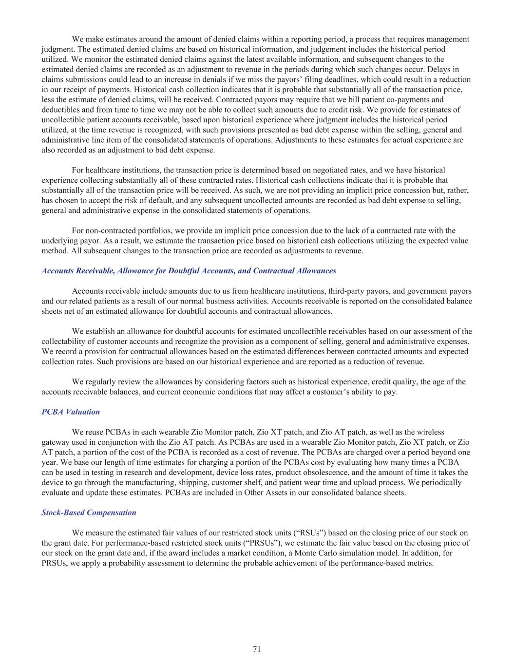 We make estimates around the amount of denied claims within a reporting period, a process that requires management judgment. The estimated denied claims are based on historical information, and judgement includes the historical period utilized. We monitor the estimated denied claims against the latest available information, and subsequent changes to the estimated denied claims are recorded as an adjustment to revenue in the periods during which such changes occur. Delays in claims submissions could lead to an increase in denials if we miss the payors’ filing deadlines, which could result in a reduction in our receipt of payments. Historical cash collection indicates that it is probable that substantially all of the transaction price, less the estimate of denied claims, will be received. Contracted payors may require that we bill patient co-payments and deductibles and from time to time we may not be able to collect such amounts due to credit risk. We provide for estimates of uncollectible patient accounts receivable, based upon historical experience where judgment includes the historical period utilized, at the time revenue is recognized, with such provisions presented as bad debt expense within the selling, general and administrative line item of the consolidated statements of operations. Adjustments to these estimates for actual experience are also recorded as an adjustment to bad debt expense. For healthcare institutions, the transaction price is determined based on negotiated rates, and we have historical experience collecting substantially all of these contracted rates. Historical cash collections indicate that it is probable that substantially all of the transaction price will be received. As such, we are not providing an implicit price concession but, rather, has chosen to accept the risk of default, and any subsequent uncollected amounts are recorded as bad debt expense to selling, general and administrative expense in the consolidated statements of operations. For non-contracted portfolios, we provide an implicit price concession due to the lack of a contracted rate with the underlying payor. As a result, we estimate the transaction price based on historical cash collections utilizing the expected value method. All subsequent changes to the transaction price are recorded as adjustments to revenue. Accounts Receivable, Allowance for Doubtful Accounts, and Contractual Allowances Accounts receivable include amounts due to us from healthcare institutions, third-party payors, and government payors and our related patients as a result of our normal business activities. Accounts receivable is reported on the consolidated balance sheets net of an estimated allowance for doubtful accounts and contractual allowances. We establish an allowance for doubtful accounts for estimated uncollectible receivables based on our assessment of the collectability of customer accounts and recognize the provision as a component of selling, general and administrative expenses. We record a provision for contractual allowances based on the estimated differences between contracted amounts and expected collection rates. Such provisions are based on our historical experience and are reported as a reduction of revenue. We regularly review the allowances by considering factors such as historical experience, credit quality, the age of the accounts receivable balances, and current economic conditions that may affect a customer’s ability to pay. PCBA Valuation We reuse PCBAs in each wearable Zio Monitor patch, Zio XT patch, and Zio AT patch, as well as the wireless gateway used in conjunction with the Zio AT patch. As PCBAs are used in a wearable Zio Monitor patch, Zio XT patch, or Zio AT patch, a portion of the cost of the PCBA is recorded as a cost of revenue. The PCBAs are charged over a period beyond one year. We base our length of time estimates for charging a portion of the PCBAs cost by evaluating how many times a PCBA can be used in testing in research and development, device loss rates, product obsolescence, and the amount of time it takes the device to go through the manufacturing, shipping, customer shelf, and patient wear time and upload process. We periodically evaluate and update these estimates. PCBAs are included in Other Assets in our consolidated balance sheets. Stock-Based Compensation We measure the estimated fair values of our restricted stock units (“RSUs”) based on the closing price of our stock on the grant date. For performance-based restricted stock units (“PRSUs”), we estimate the fair value based on the closing price of our stock on the grant date and, if the award includes a market condition, a Monte Carlo simulation model. In addition, for PRSUs, we apply a probability assessment to determine the probable achievement of the performance-based metrics. 71