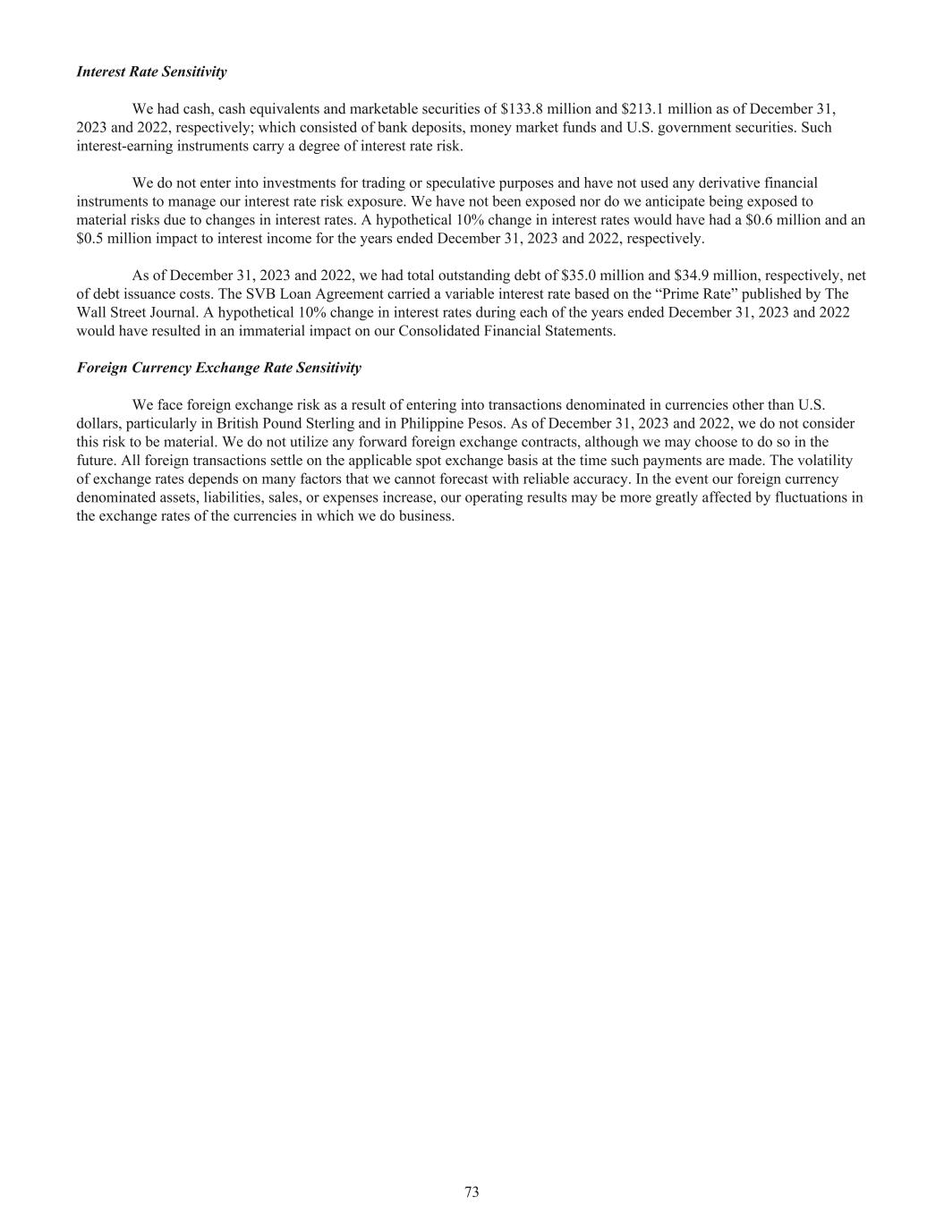Interest Rate Sensitivity We had cash, cash equivalents and marketable securities of $133.8 million and $213.1 million as of December 31, 2023 and 2022, respectively; which consisted of bank deposits, money market funds and U.S. government securities. Such interest-earning instruments carry a degree of interest rate risk. We do not enter into investments for trading or speculative purposes and have not used any derivative financial instruments to manage our interest rate risk exposure. We have not been exposed nor do we anticipate being exposed to material risks due to changes in interest rates. A hypothetical 10% change in interest rates would have had a $0.6 million and an $0.5 million impact to interest income for the years ended December 31, 2023 and 2022, respectively. As of December 31, 2023 and 2022, we had total outstanding debt of $35.0 million and $34.9 million, respectively, net of debt issuance costs. The SVB Loan Agreement carried a variable interest rate based on the “Prime Rate” published by The Wall Street Journal. A hypothetical 10% change in interest rates during each of the years ended December 31, 2023 and 2022 would have resulted in an immaterial impact on our Consolidated Financial Statements. Foreign Currency Exchange Rate Sensitivity We face foreign exchange risk as a result of entering into transactions denominated in currencies other than U.S. dollars, particularly in British Pound Sterling and in Philippine Pesos. As of December 31, 2023 and 2022, we do not consider this risk to be material. We do not utilize any forward foreign exchange contracts, although we may choose to do so in the future. All foreign transactions settle on the applicable spot exchange basis at the time such payments are made. The volatility of exchange rates depends on many factors that we cannot forecast with reliable accuracy. In the event our foreign currency denominated assets, liabilities, sales, or expenses increase, our operating results may be more greatly affected by fluctuations in the exchange rates of the currencies in which we do business. 73