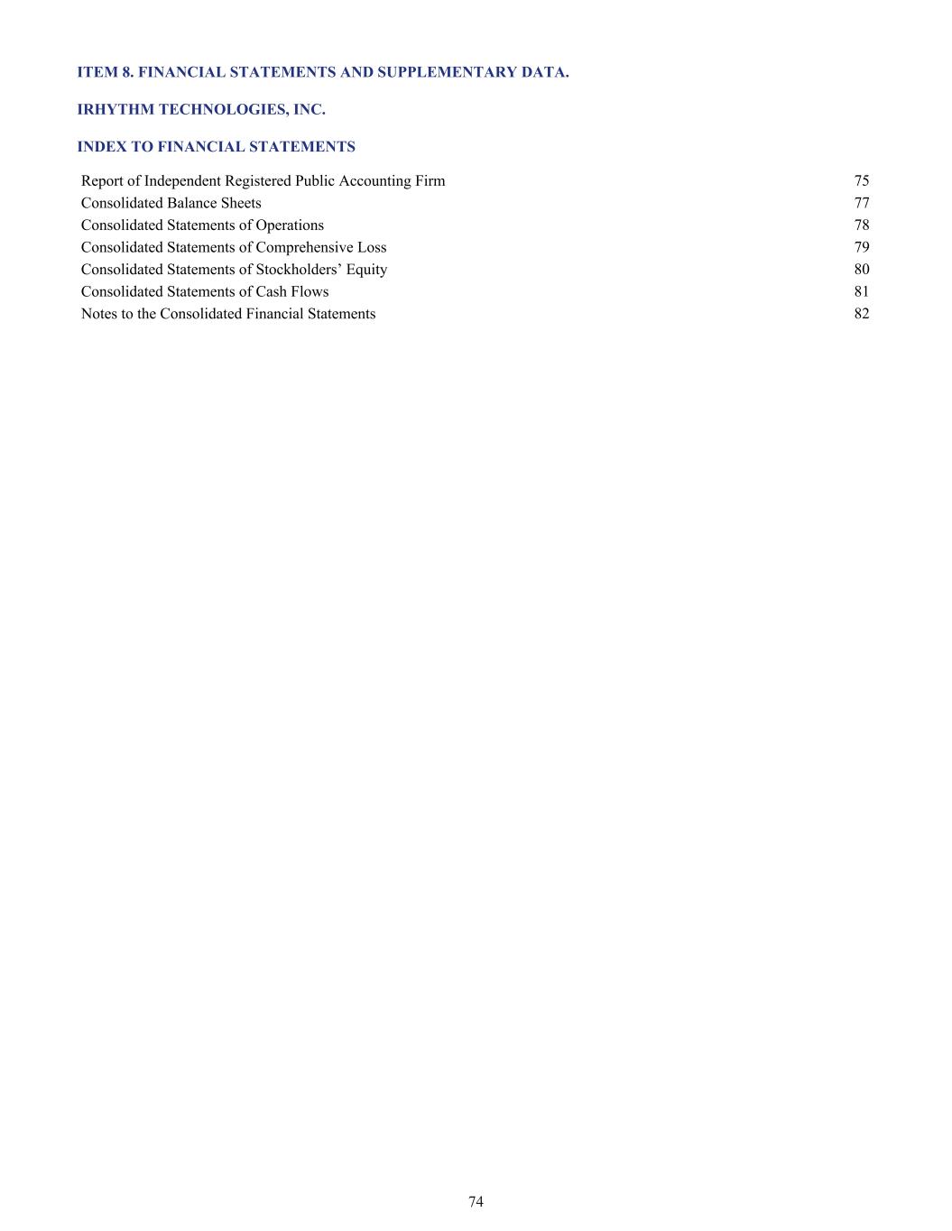 ITEM 8. FINANCIAL STATEMENTS AND SUPPLEMENTARY DATA. IRHYTHM TECHNOLOGIES, INC. INDEX TO FINANCIAL STATEMENTS Report of Independent Registered Public Accounting Firm 75 Consolidated Balance Sheets 77 Consolidated Statements of Operations 78 Consolidated Statements of Comprehensive Loss 79 Consolidated Statements of Stockholders’ Equity 80 Consolidated Statements of Cash Flows 81 Notes to the Consolidated Financial Statements 82 74