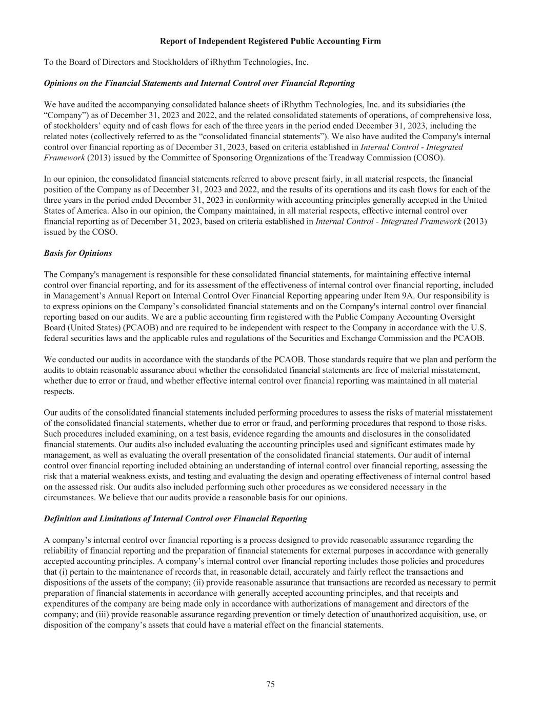 Report of Independent Registered Public Accounting Firm To the Board of Directors and Stockholders of iRhythm Technologies, Inc. Opinions on the Financial Statements and Internal Control over Financial Reporting We have audited the accompanying consolidated balance sheets of iRhythm Technologies, Inc. and its subsidiaries (the “Company”) as of December 31, 2023 and 2022, and the related consolidated statements of operations, of comprehensive loss, of stockholders’ equity and of cash flows for each of the three years in the period ended December 31, 2023, including the related notes (collectively referred to as the “consolidated financial statements”). We also have audited the Company's internal control over financial reporting as of December 31, 2023, based on criteria established in Internal Control - Integrated Framework (2013) issued by the Committee of Sponsoring Organizations of the Treadway Commission (COSO). In our opinion, the consolidated financial statements referred to above present fairly, in all material respects, the financial position of the Company as of December 31, 2023 and 2022, and the results of its operations and its cash flows for each of the three years in the period ended December 31, 2023 in conformity with accounting principles generally accepted in the United States of America. Also in our opinion, the Company maintained, in all material respects, effective internal control over financial reporting as of December 31, 2023, based on criteria established in Internal Control - Integrated Framework (2013) issued by the COSO. Basis for Opinions The Company's management is responsible for these consolidated financial statements, for maintaining effective internal control over financial reporting, and for its assessment of the effectiveness of internal control over financial reporting, included in Management’s Annual Report on Internal Control Over Financial Reporting appearing under Item 9A. Our responsibility is to express opinions on the Company’s consolidated financial statements and on the Company's internal control over financial reporting based on our audits. We are a public accounting firm registered with the Public Company Accounting Oversight Board (United States) (PCAOB) and are required to be independent with respect to the Company in accordance with the U.S. federal securities laws and the applicable rules and regulations of the Securities and Exchange Commission and the PCAOB. We conducted our audits in accordance with the standards of the PCAOB. Those standards require that we plan and perform the audits to obtain reasonable assurance about whether the consolidated financial statements are free of material misstatement, whether due to error or fraud, and whether effective internal control over financial reporting was maintained in all material respects. Our audits of the consolidated financial statements included performing procedures to assess the risks of material misstatement of the consolidated financial statements, whether due to error or fraud, and performing procedures that respond to those risks. Such procedures included examining, on a test basis, evidence regarding the amounts and disclosures in the consolidated financial statements. Our audits also included evaluating the accounting principles used and significant estimates made by management, as well as evaluating the overall presentation of the consolidated financial statements. Our audit of internal control over financial reporting included obtaining an understanding of internal control over financial reporting, assessing the risk that a material weakness exists, and testing and evaluating the design and operating effectiveness of internal control based on the assessed risk. Our audits also included performing such other procedures as we considered necessary in the circumstances. We believe that our audits provide a reasonable basis for our opinions. Definition and Limitations of Internal Control over Financial Reporting A company’s internal control over financial reporting is a process designed to provide reasonable assurance regarding the reliability of financial reporting and the preparation of financial statements for external purposes in accordance with generally accepted accounting principles. A company’s internal control over financial reporting includes those policies and procedures that (i) pertain to the maintenance of records that, in reasonable detail, accurately and fairly reflect the transactions and dispositions of the assets of the company; (ii) provide reasonable assurance that transactions are recorded as necessary to permit preparation of financial statements in accordance with generally accepted accounting principles, and that receipts and expenditures of the company are being made only in accordance with authorizations of management and directors of the company; and (iii) provide reasonable assurance regarding prevention or timely detection of unauthorized acquisition, use, or disposition of the company’s assets that could have a material effect on the financial statements. 75