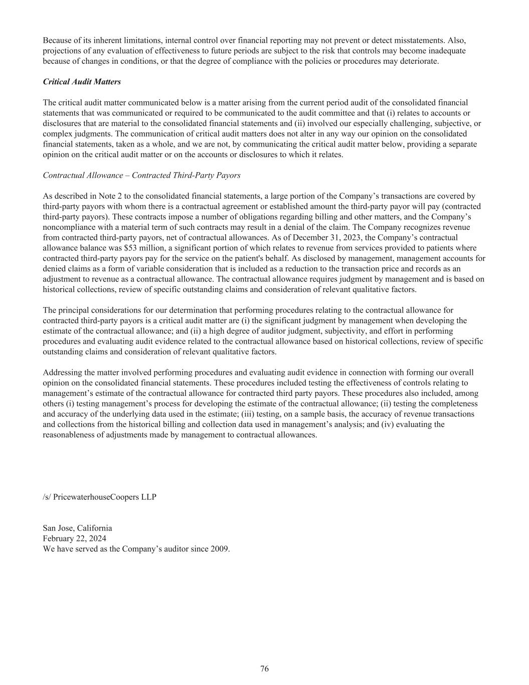 Because of its inherent limitations, internal control over financial reporting may not prevent or detect misstatements. Also, projections of any evaluation of effectiveness to future periods are subject to the risk that controls may become inadequate because of changes in conditions, or that the degree of compliance with the policies or procedures may deteriorate. Critical Audit Matters The critical audit matter communicated below is a matter arising from the current period audit of the consolidated financial statements that was communicated or required to be communicated to the audit committee and that (i) relates to accounts or disclosures that are material to the consolidated financial statements and (ii) involved our especially challenging, subjective, or complex judgments. The communication of critical audit matters does not alter in any way our opinion on the consolidated financial statements, taken as a whole, and we are not, by communicating the critical audit matter below, providing a separate opinion on the critical audit matter or on the accounts or disclosures to which it relates. Contractual Allowance – Contracted Third-Party Payors As described in Note 2 to the consolidated financial statements, a large portion of the Company’s transactions are covered by third-party payors with whom there is a contractual agreement or established amount the third-party payor will pay (contracted third-party payors). These contracts impose a number of obligations regarding billing and other matters, and the Company’s noncompliance with a material term of such contracts may result in a denial of the claim. The Company recognizes revenue from contracted third-party payors, net of contractual allowances. As of December 31, 2023, the Company’s contractual allowance balance was $53 million, a significant portion of which relates to revenue from services provided to patients where contracted third-party payors pay for the service on the patient's behalf. As disclosed by management, management accounts for denied claims as a form of variable consideration that is included as a reduction to the transaction price and records as an adjustment to revenue as a contractual allowance. The contractual allowance requires judgment by management and is based on historical collections, review of specific outstanding claims and consideration of relevant qualitative factors. The principal considerations for our determination that performing procedures relating to the contractual allowance for contracted third-party payors is a critical audit matter are (i) the significant judgment by management when developing the estimate of the contractual allowance; and (ii) a high degree of auditor judgment, subjectivity, and effort in performing procedures and evaluating audit evidence related to the contractual allowance based on historical collections, review of specific outstanding claims and consideration of relevant qualitative factors. Addressing the matter involved performing procedures and evaluating audit evidence in connection with forming our overall opinion on the consolidated financial statements. These procedures included testing the effectiveness of controls relating to management’s estimate of the contractual allowance for contracted third party payors. These procedures also included, among others (i) testing management’s process for developing the estimate of the contractual allowance; (ii) testing the completeness and accuracy of the underlying data used in the estimate; (iii) testing, on a sample basis, the accuracy of revenue transactions and collections from the historical billing and collection data used in management’s analysis; and (iv) evaluating the reasonableness of adjustments made by management to contractual allowances. /s/ PricewaterhouseCoopers LLP San Jose, California February 22, 2024 We have served as the Company’s auditor since 2009. 76