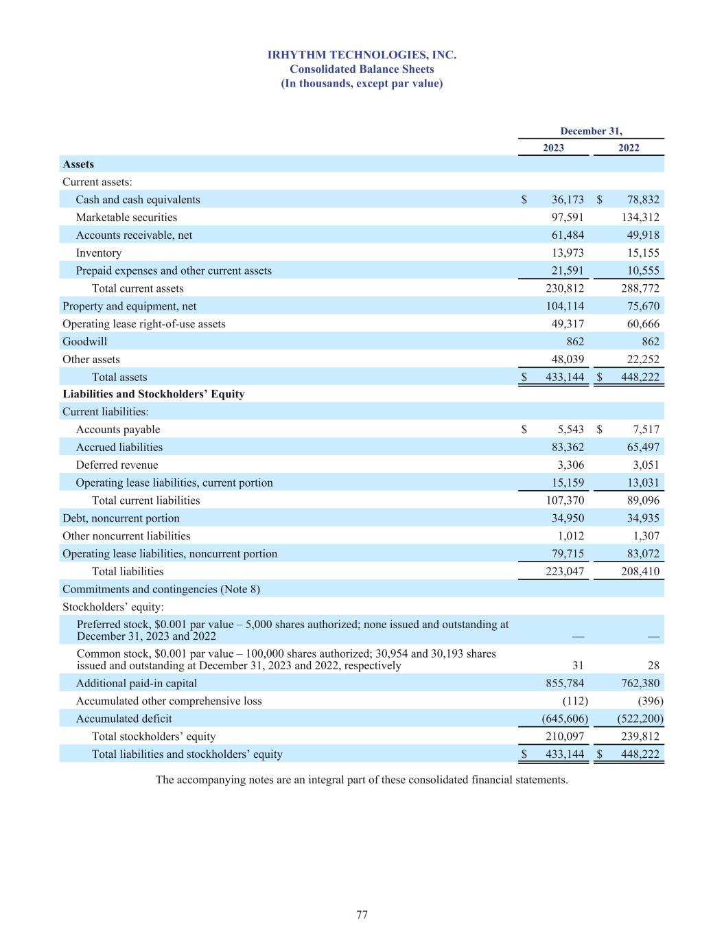 IRHYTHM TECHNOLOGIES, INC. Consolidated Balance Sheets (In thousands, except par value) December 31, 2023 2022 Assets Current assets: Cash and cash equivalents $ 36,173 $ 78,832 Marketable securities 97,591 134,312 Accounts receivable, net 61,484 49,918 Inventory 13,973 15,155 Prepaid expenses and other current assets 21,591 10,555 Total current assets 230,812 288,772 Property and equipment, net 104,114 75,670 Operating lease right-of-use assets 49,317 60,666 Goodwill 862 862 Other assets 48,039 22,252 Total assets $ 433,144 $ 448,222 Liabilities and Stockholders’ Equity Current liabilities: Accounts payable $ 5,543 $ 7,517 Accrued liabilities 83,362 65,497 Deferred revenue 3,306 3,051 Operating lease liabilities, current portion 15,159 13,031 Total current liabilities 107,370 89,096 Debt, noncurrent portion 34,950 34,935 Other noncurrent liabilities 1,012 1,307 Operating lease liabilities, noncurrent portion 79,715 83,072 Total liabilities 223,047 208,410 Commitments and contingencies (Note 8) Stockholders’ equity: Preferred stock, $0.001 par value – 5,000 shares authorized; none issued and outstanding at December 31, 2023 and 2022 — — Common stock, $0.001 par value – 100,000 shares authorized; 30,954 and 30,193 shares issued and outstanding at December 31, 2023 and 2022, respectively 31 28 Additional paid-in capital 855,784 762,380 Accumulated other comprehensive loss (112) (396) Accumulated deficit (645,606) (522,200) Total stockholders’ equity 210,097 239,812 Total liabilities and stockholders’ equity $ 433,144 $ 448,222 The accompanying notes are an integral part of these consolidated financial statements. 77