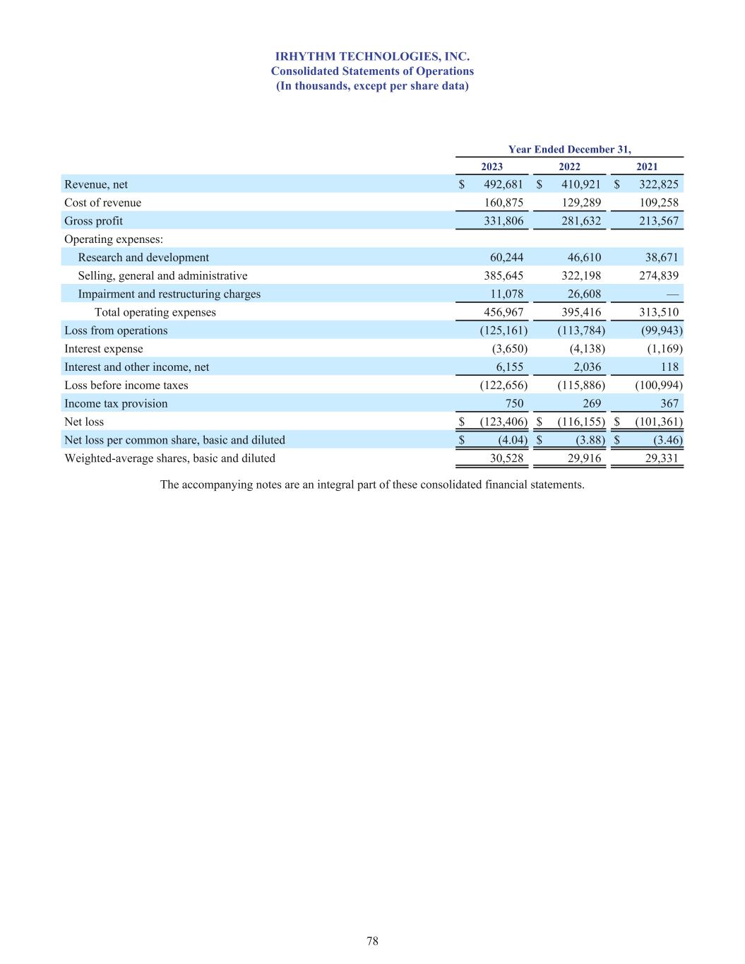 IRHYTHM TECHNOLOGIES, INC. Consolidated Statements of Operations (In thousands, except per share data) Year Ended December 31, 2023 2022 2021 Revenue, net $ 492,681 $ 410,921 $ 322,825 Cost of revenue 160,875 129,289 109,258 Gross profit 331,806 281,632 213,567 Operating expenses: Research and development 60,244 46,610 38,671 Selling, general and administrative 385,645 322,198 274,839 Impairment and restructuring charges 11,078 26,608 — Total operating expenses 456,967 395,416 313,510 Loss from operations (125,161) (113,784) (99,943) Interest expense (3,650) (4,138) (1,169) Interest and other income, net 6,155 2,036 118 Loss before income taxes (122,656) (115,886) (100,994) Income tax provision 750 269 367 Net loss $ (123,406) $ (116,155) $ (101,361) Net loss per common share, basic and diluted $ (4.04) $ (3.88) $ (3.46) Weighted-average shares, basic and diluted 30,528 29,916 29,331 The accompanying notes are an integral part of these consolidated financial statements. 78