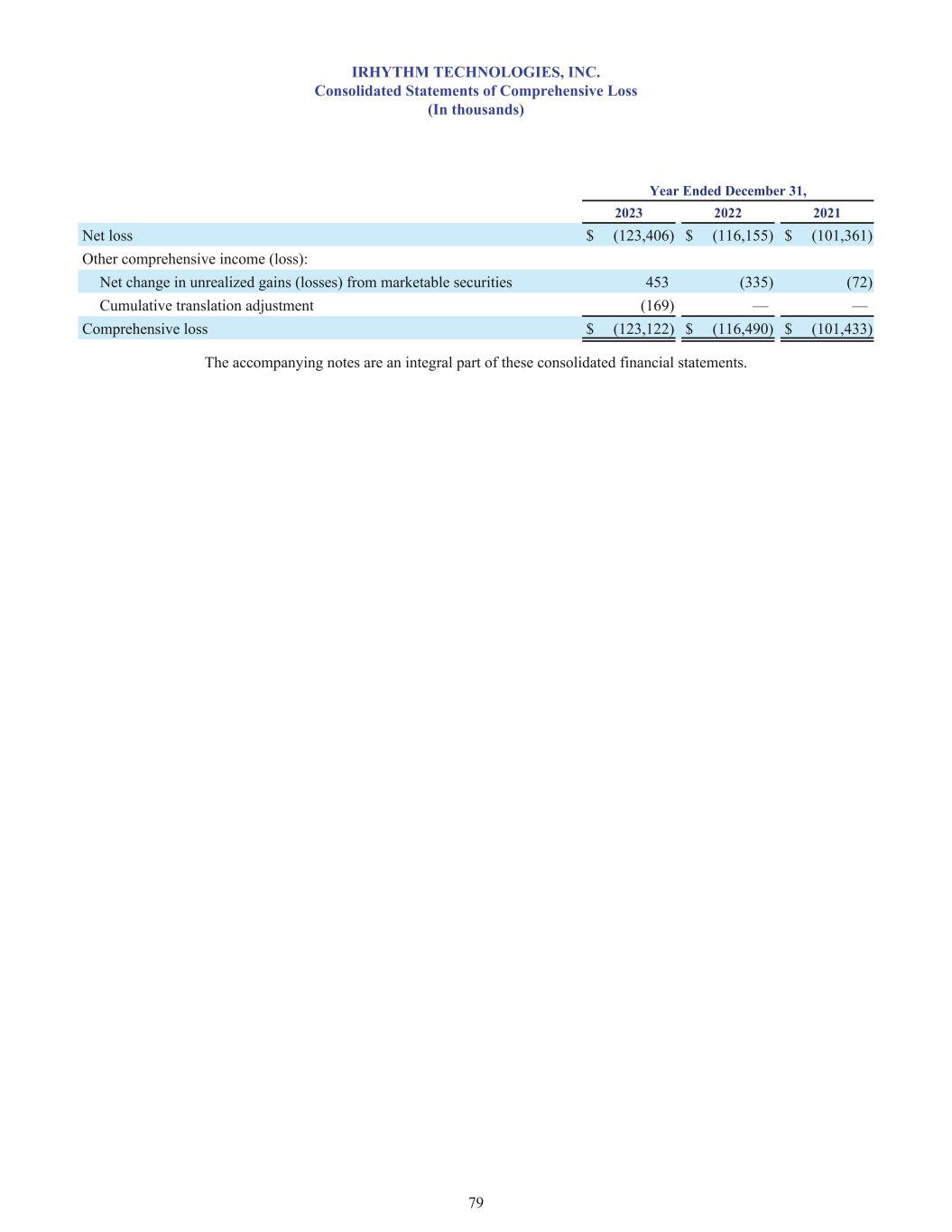 IRHYTHM TECHNOLOGIES, INC. Consolidated Statements of Comprehensive Loss (In thousands) Year Ended December 31, 2023 2022 2021 Net loss $ (123,406) $ (116,155) $ (101,361) Other comprehensive income (loss): Net change in unrealized gains (losses) from marketable securities 453 (335) (72) Cumulative translation adjustment (169) — — Comprehensive loss $ (123,122) $ (116,490) $ (101,433) The accompanying notes are an integral part of these consolidated financial statements. 79